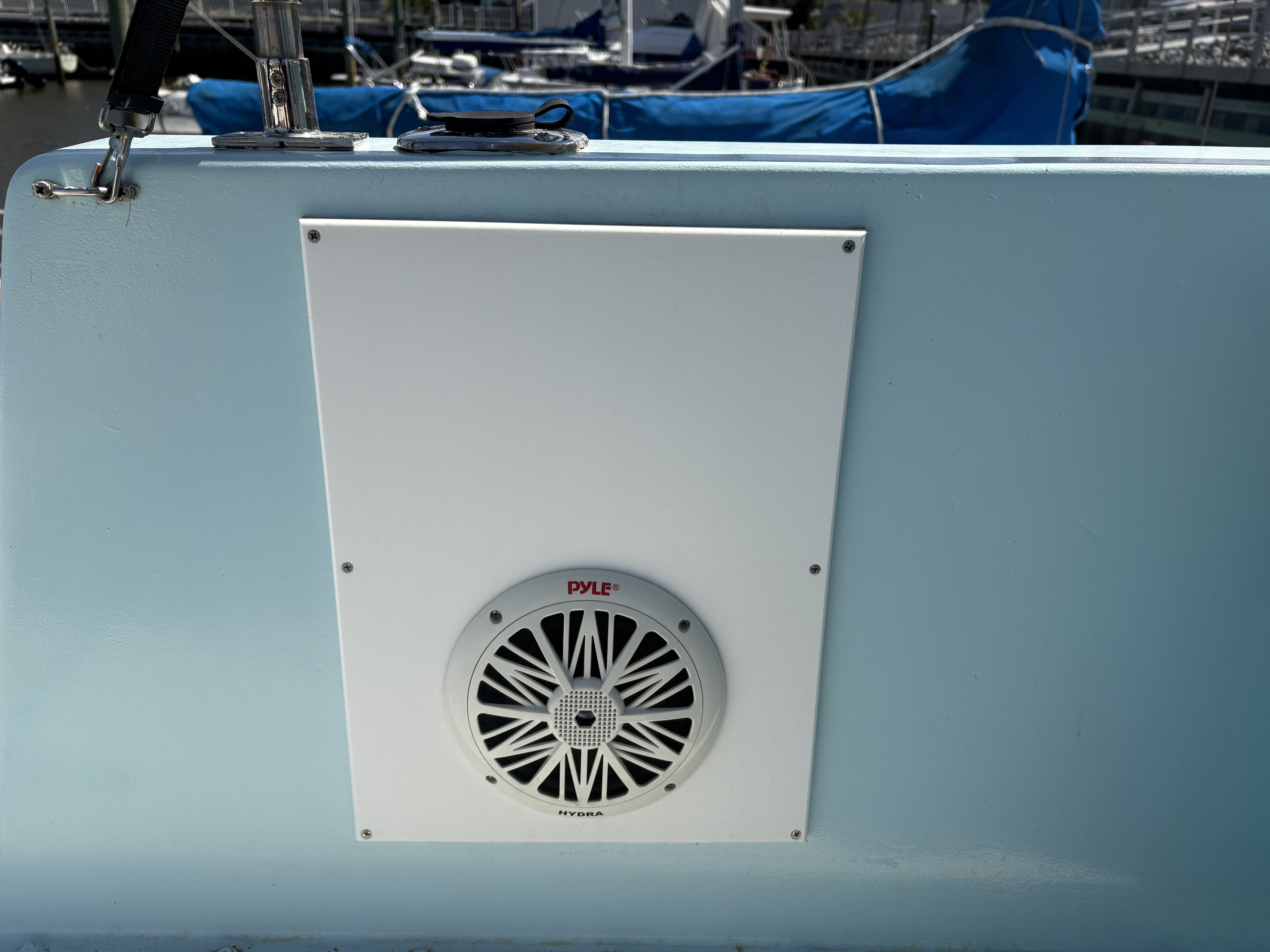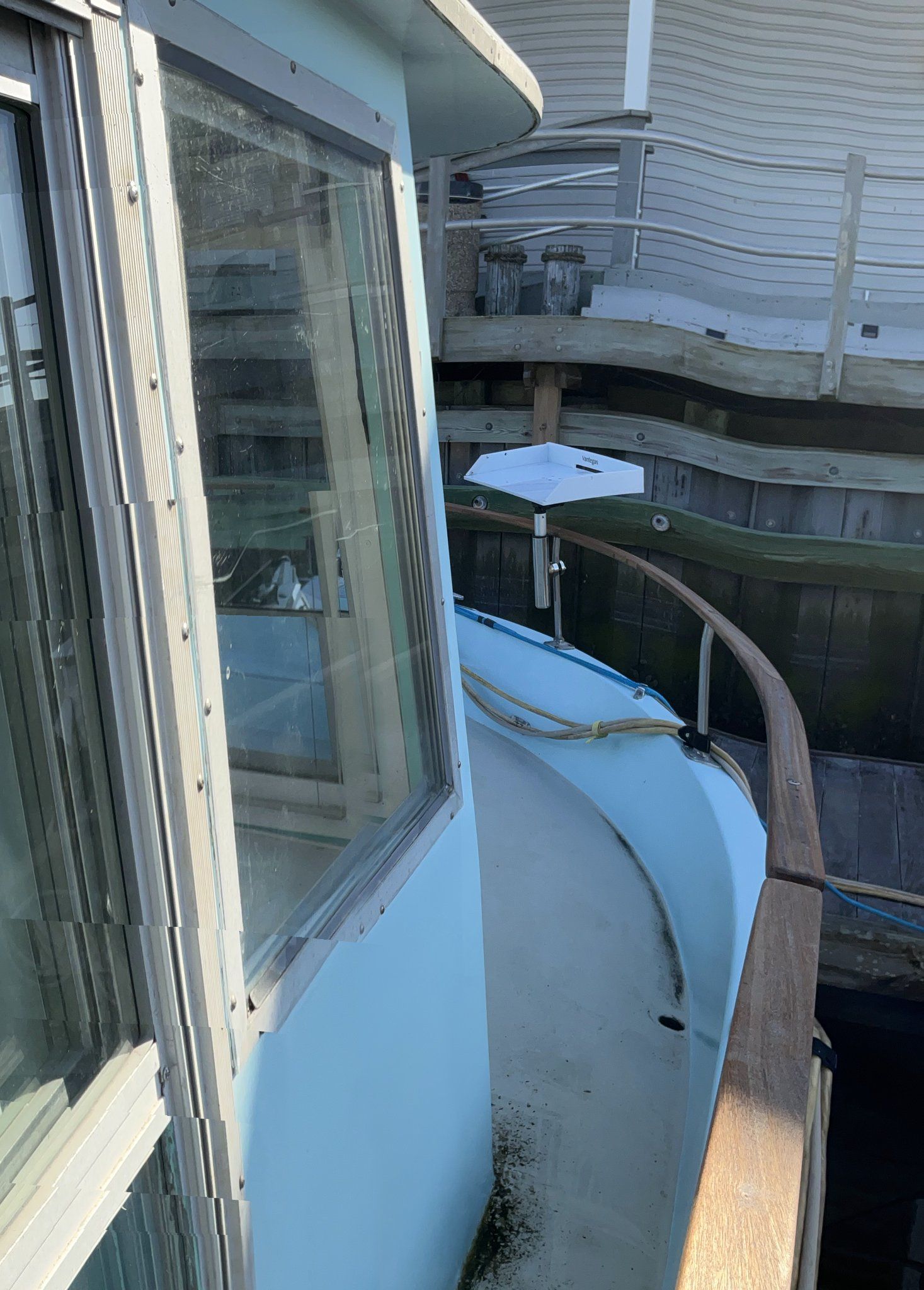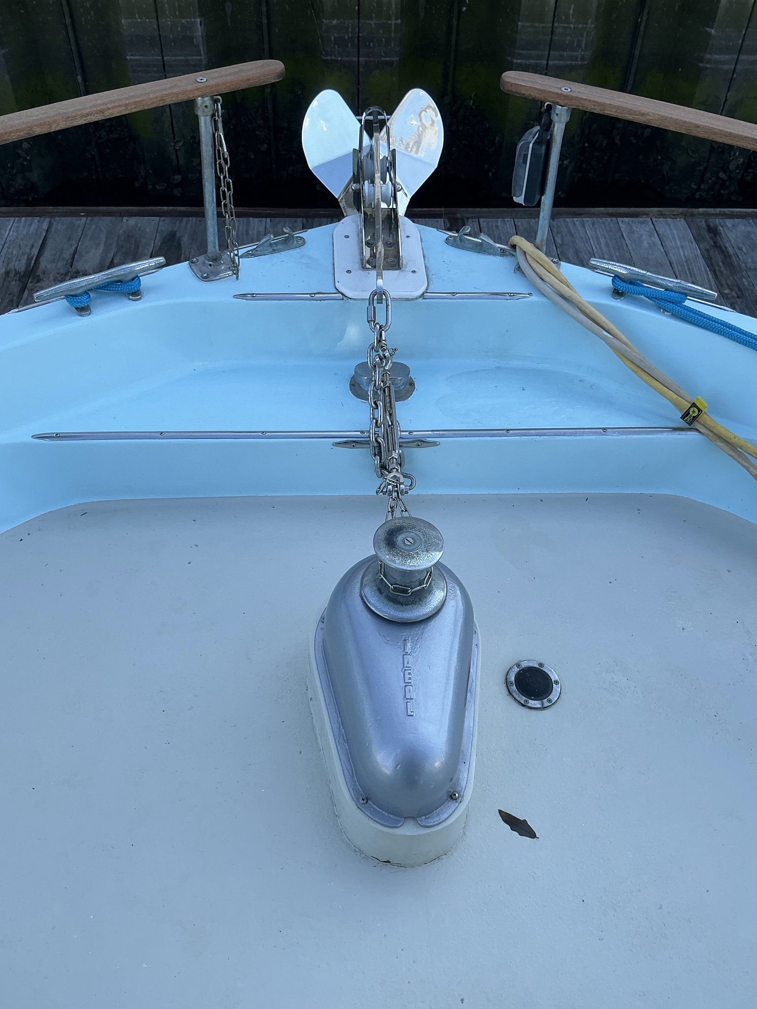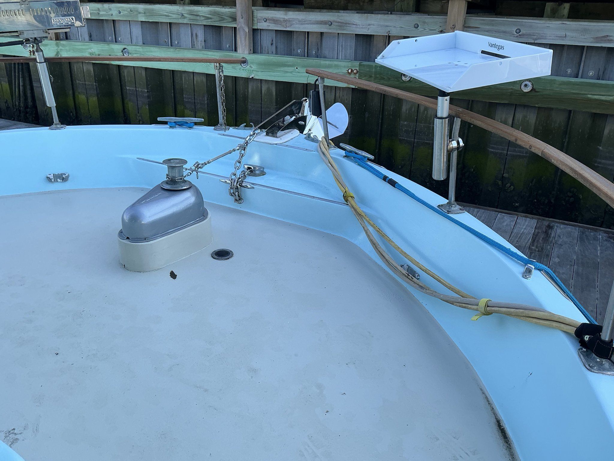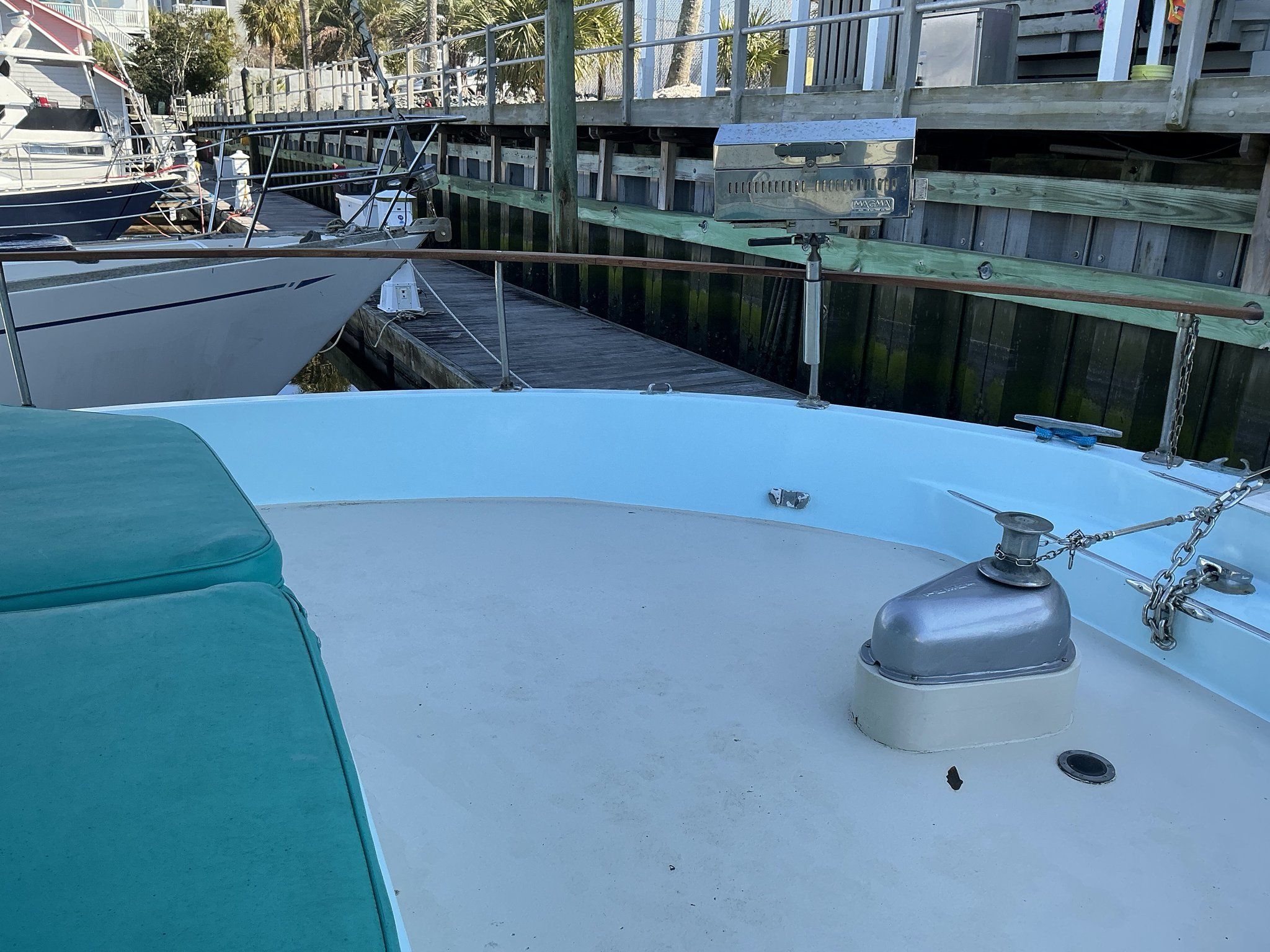 Exterior: Deck Hatches, aluminum sliding doors, mahogany deck railings, freeing ports for deck drainage, cleats throughout vessel