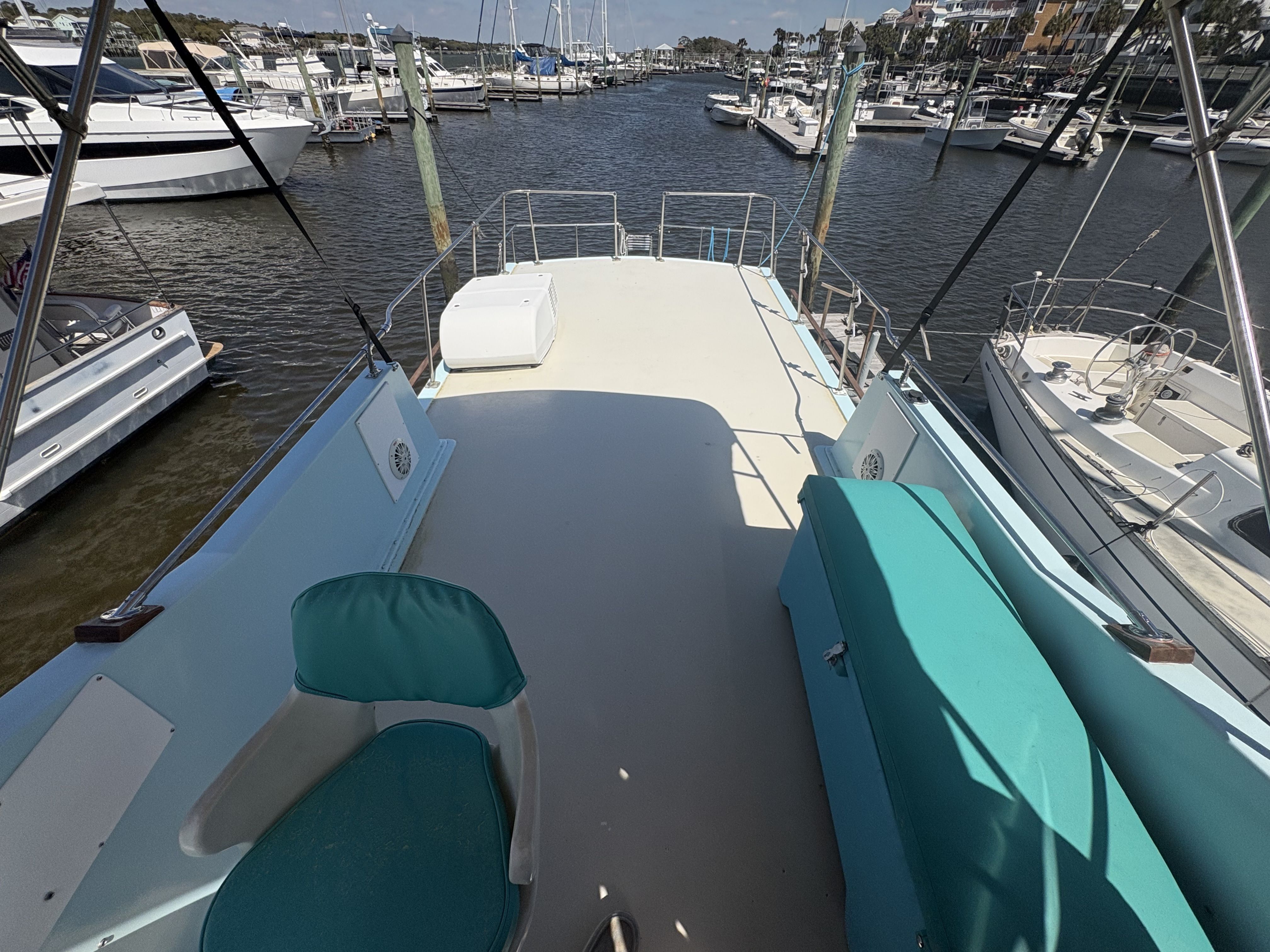 Deck Areas: Generous exterior deck space allows for line handling, lounging, and entertaining, with easy access around the vessel and expansive bridge with seating and cruising controls.