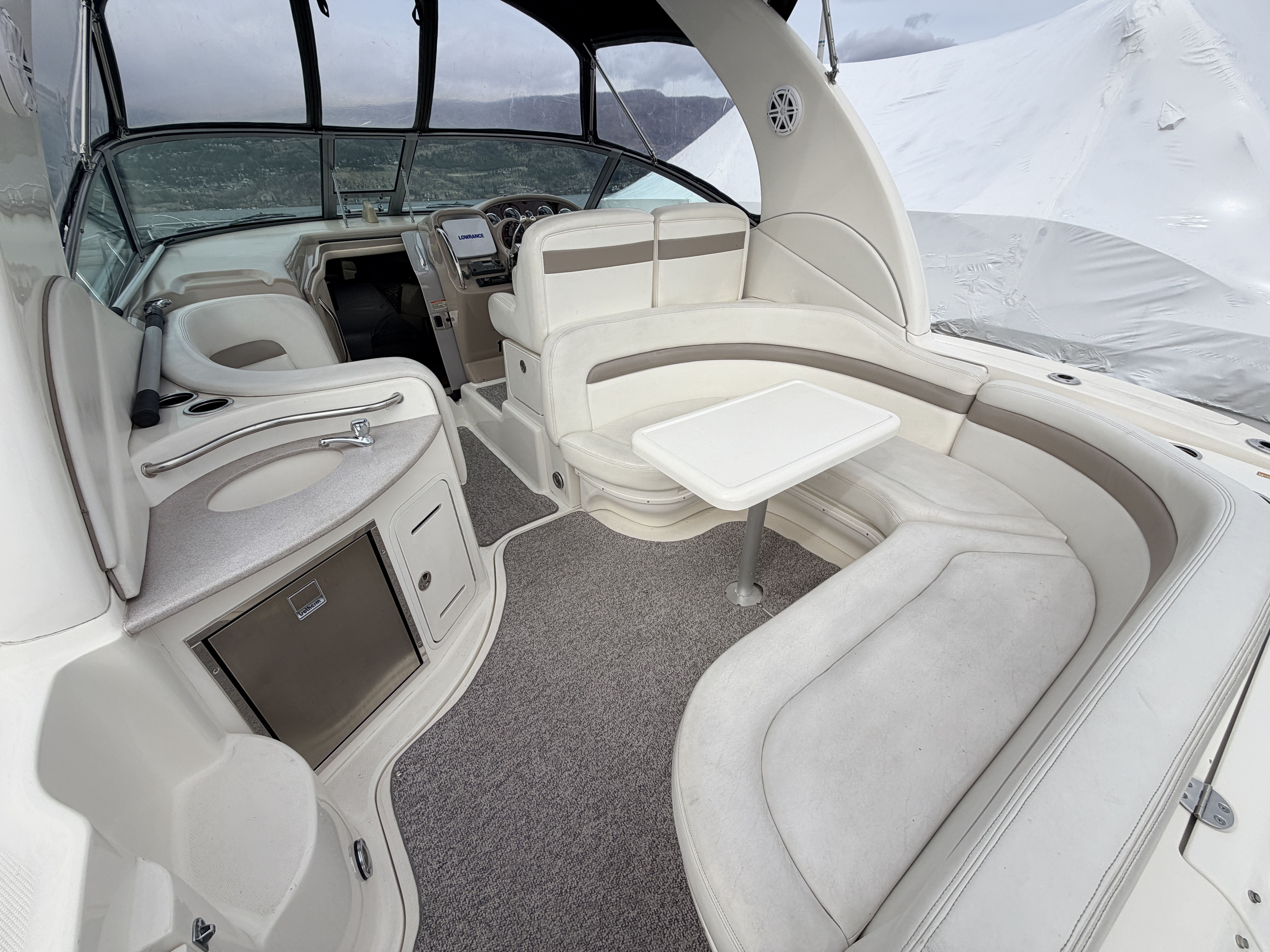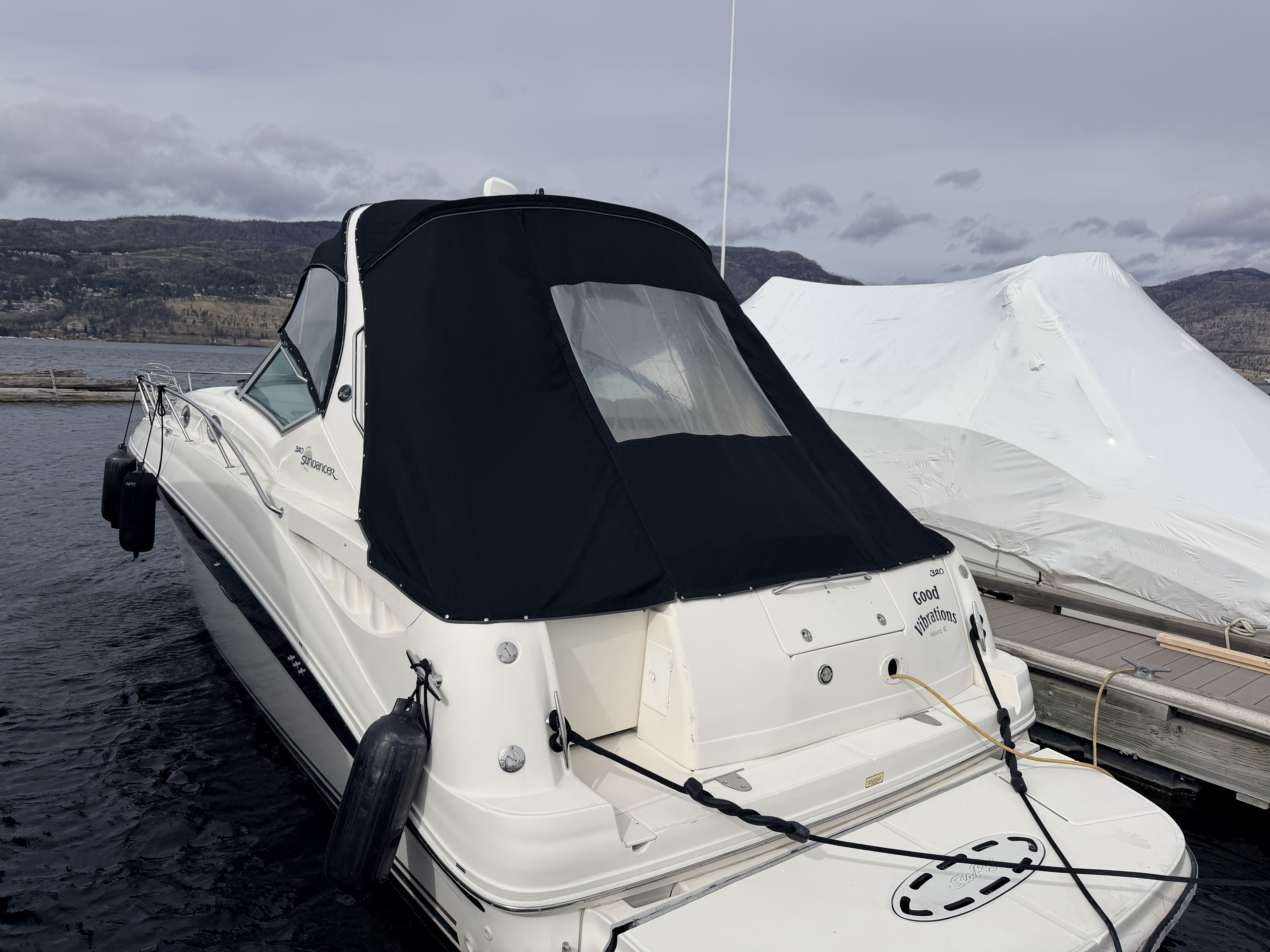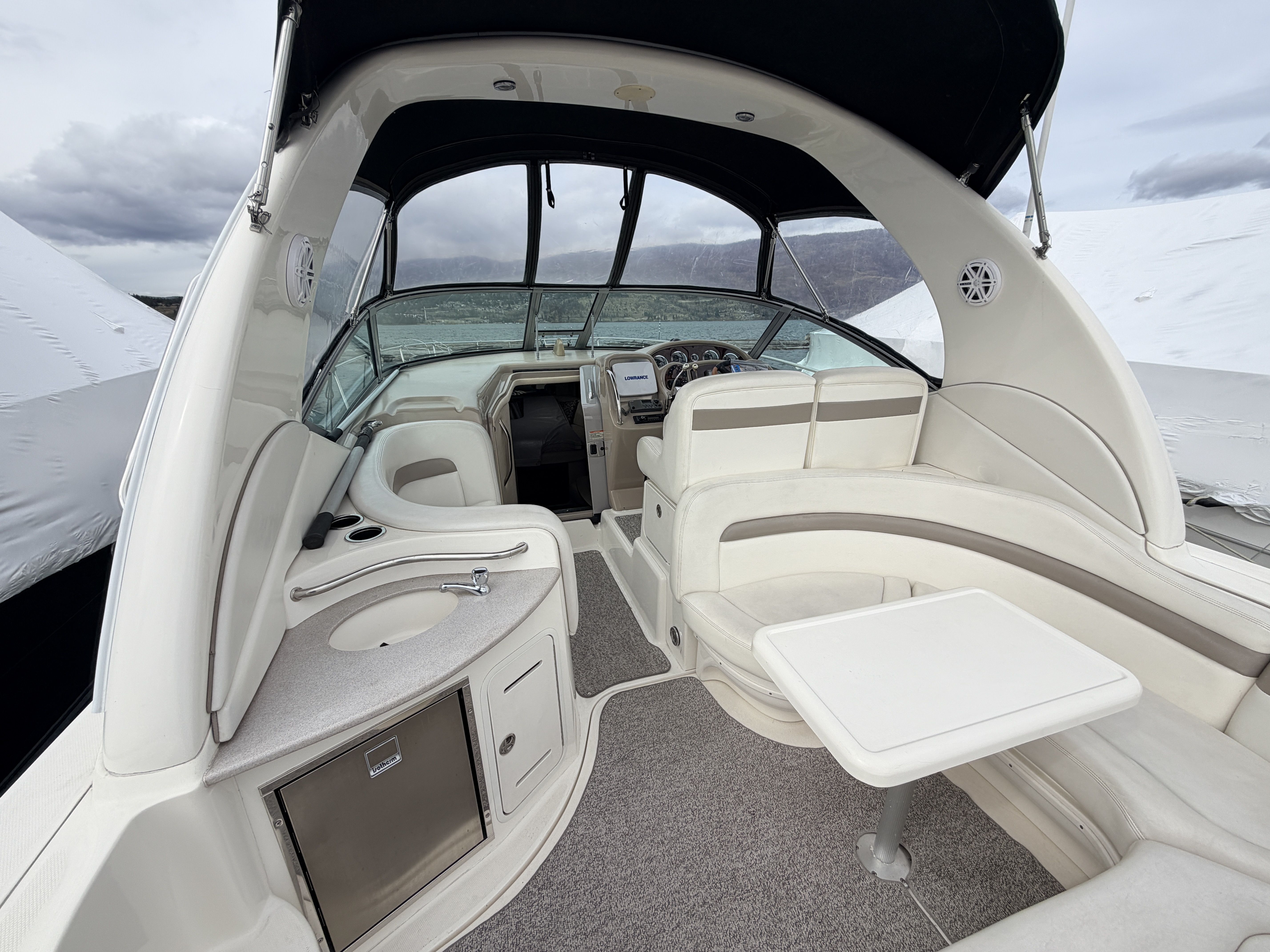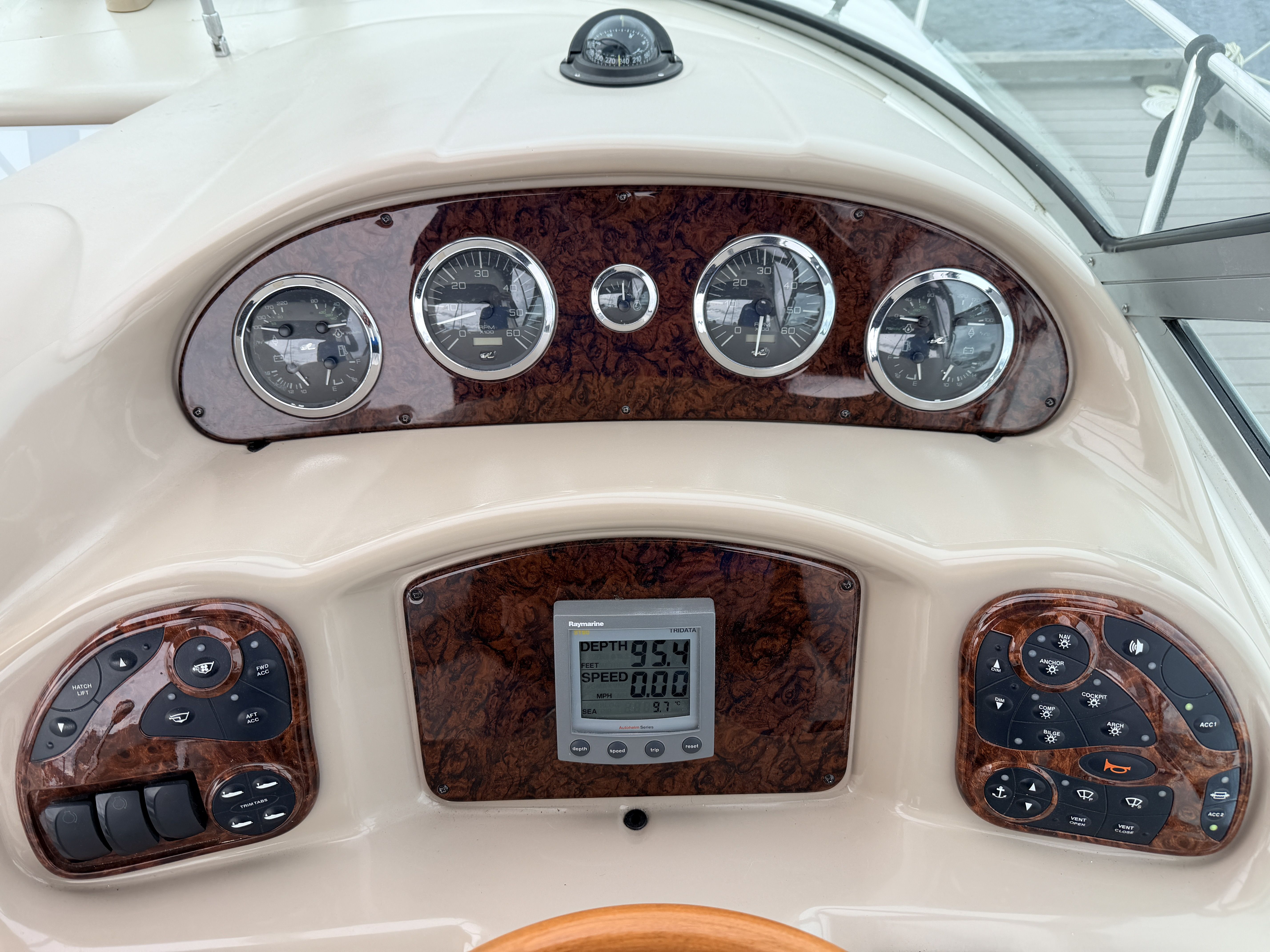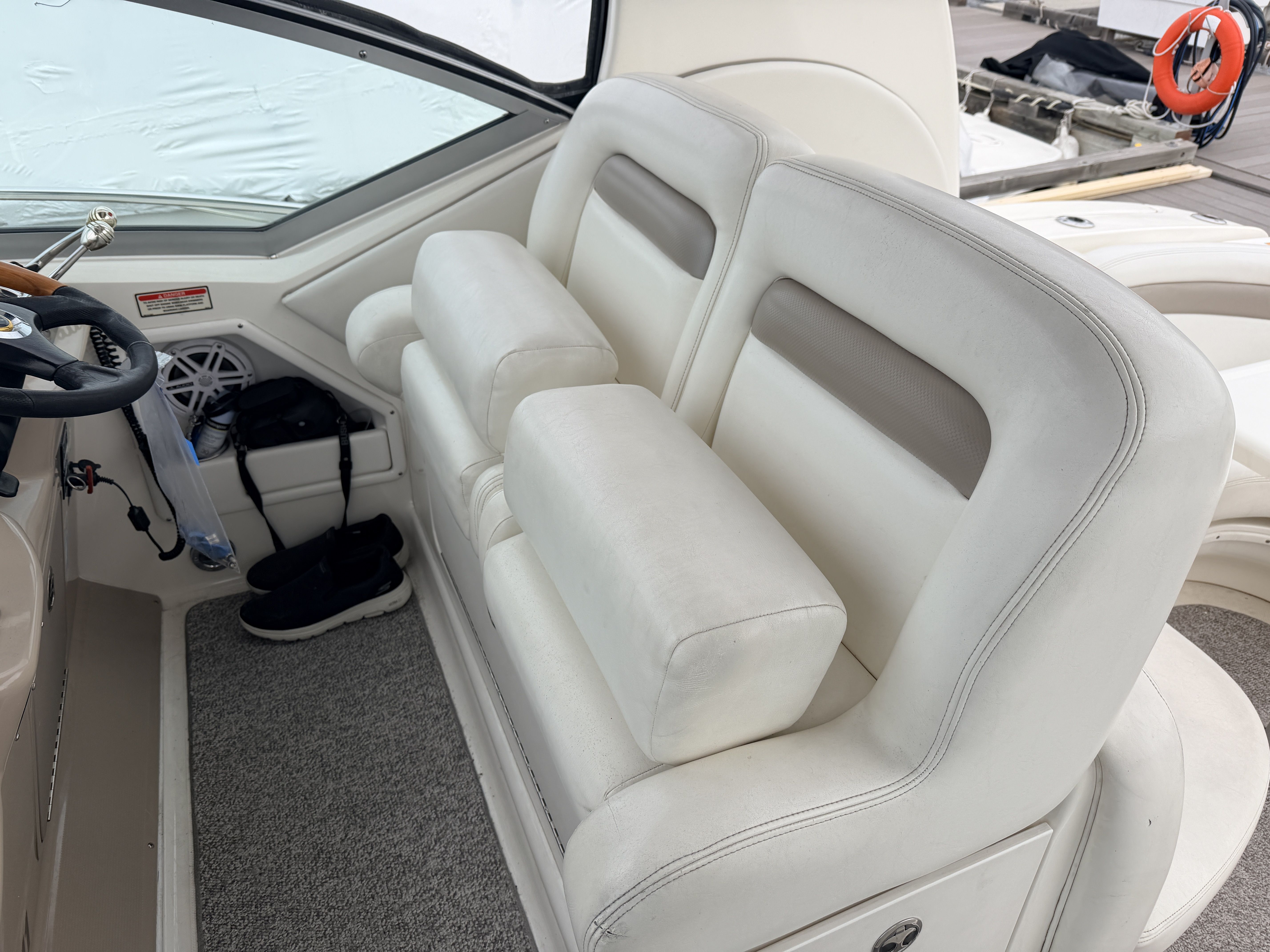 Featuring a striking black stripe down the sides and a sleek profile, this Sundancer stands out both in the marina and on the water. Full Enclosure, enhancing your onboard comfort during the shoulder seasons. Powered by a reliable engine paired with a Kohler generator, extended trips and onboard amenities are effortlessly supported.