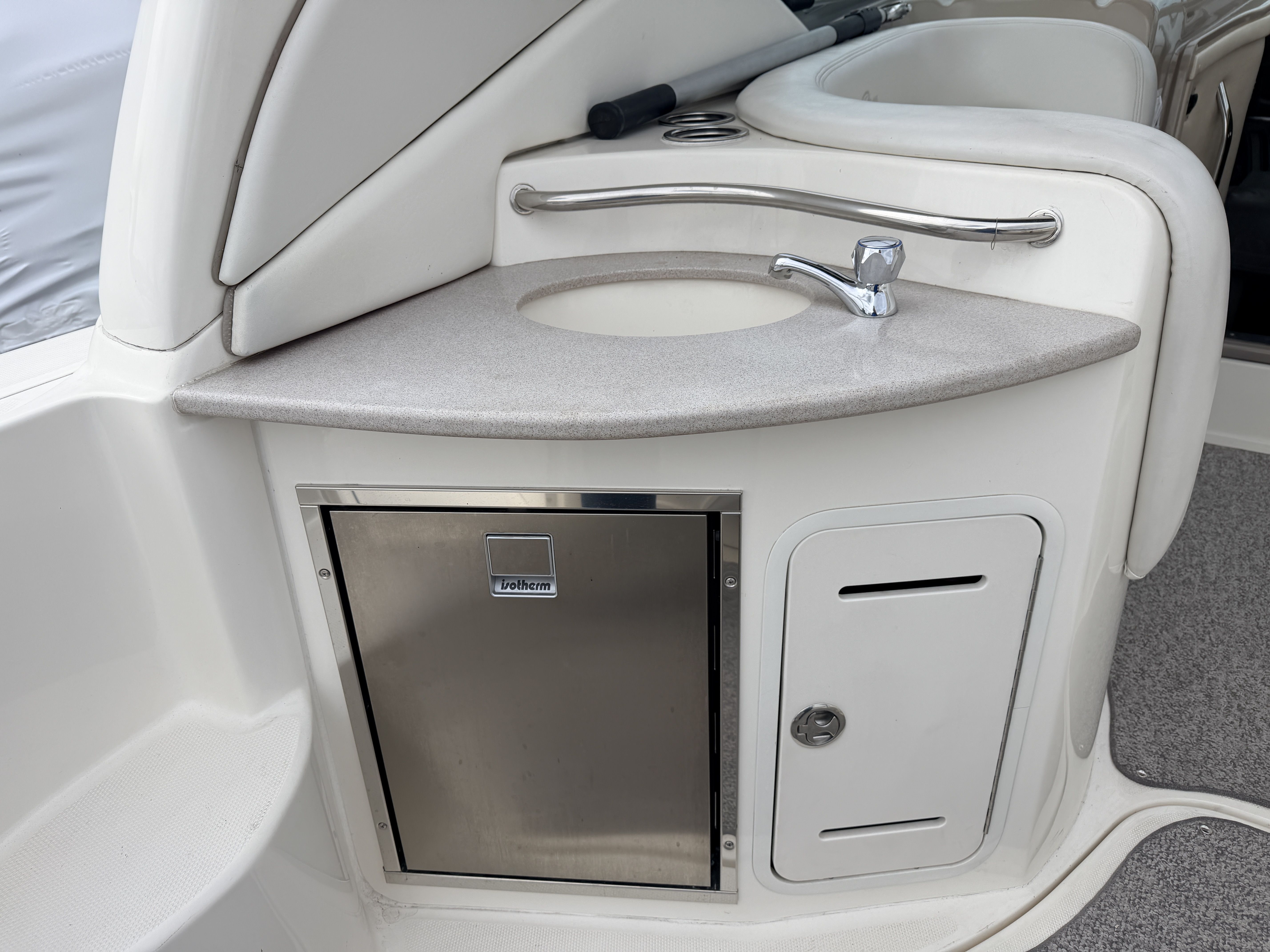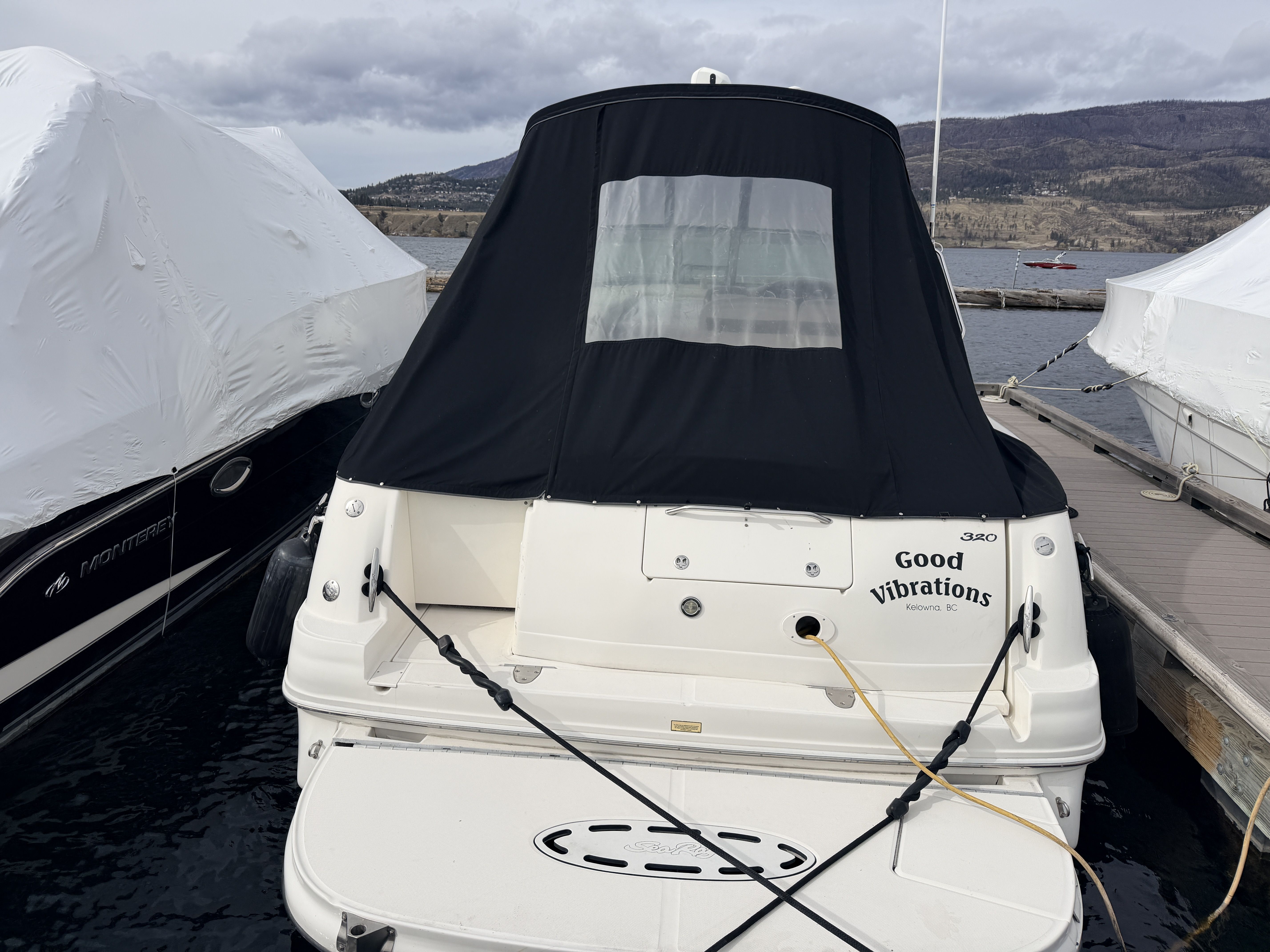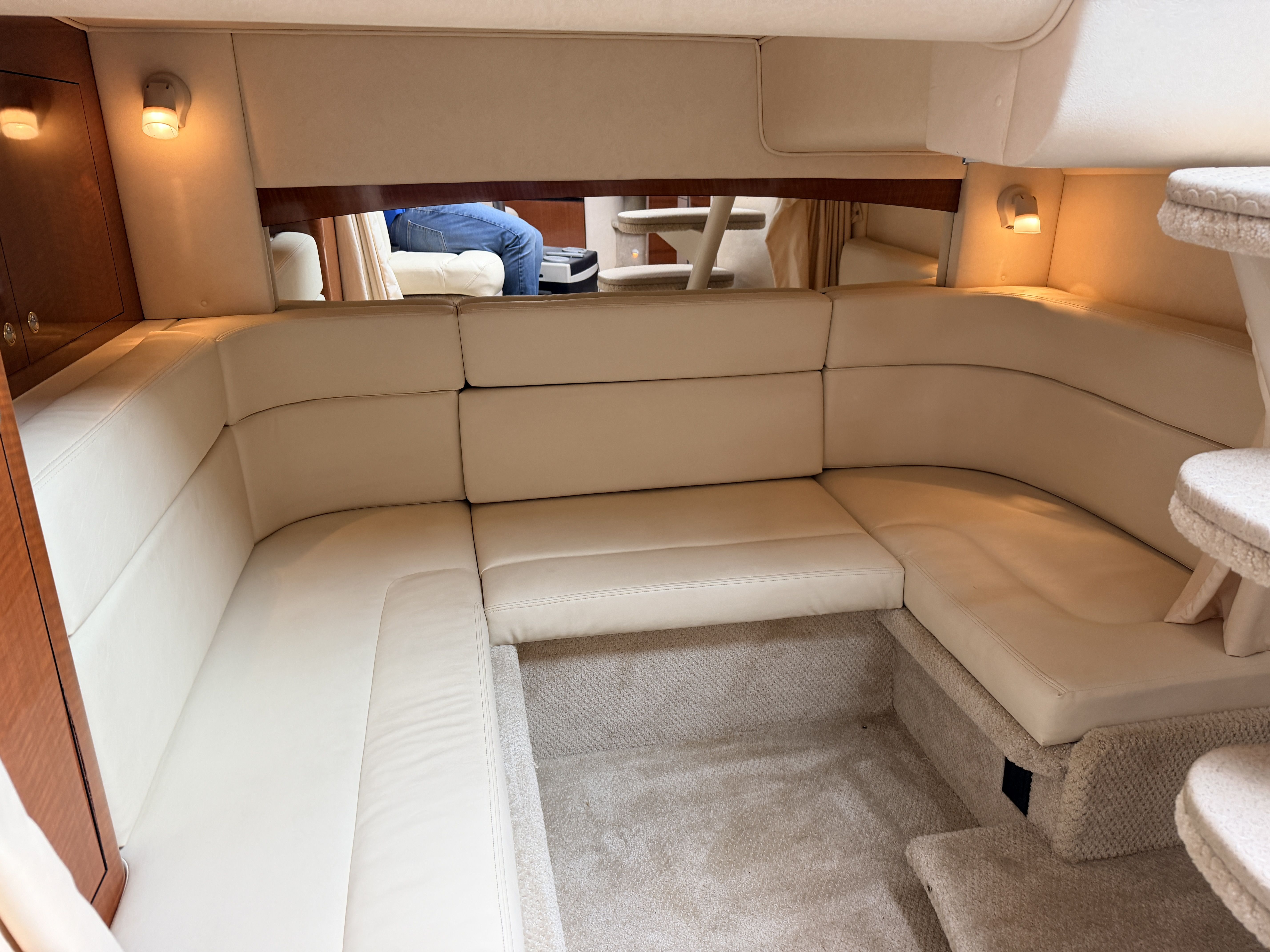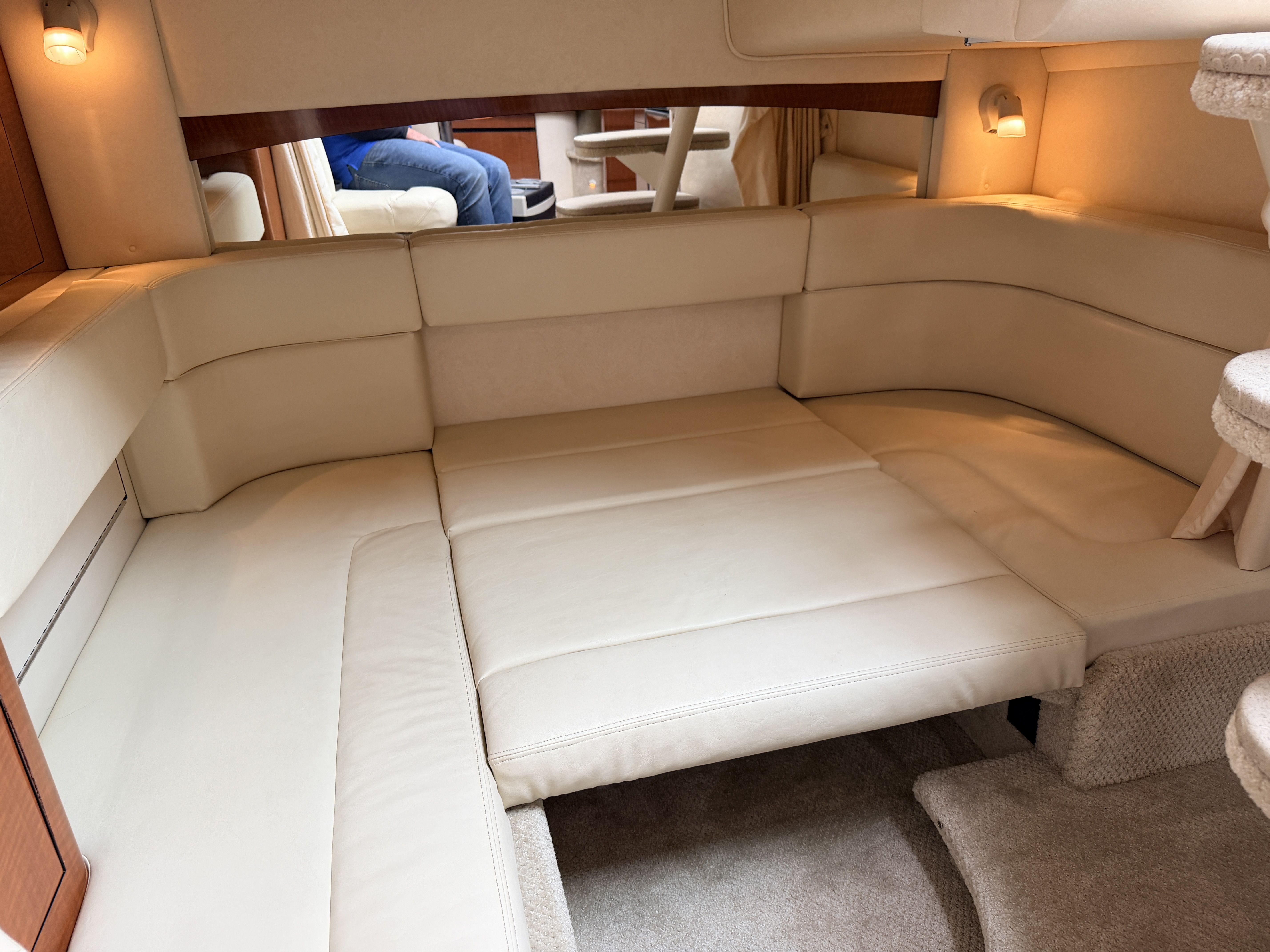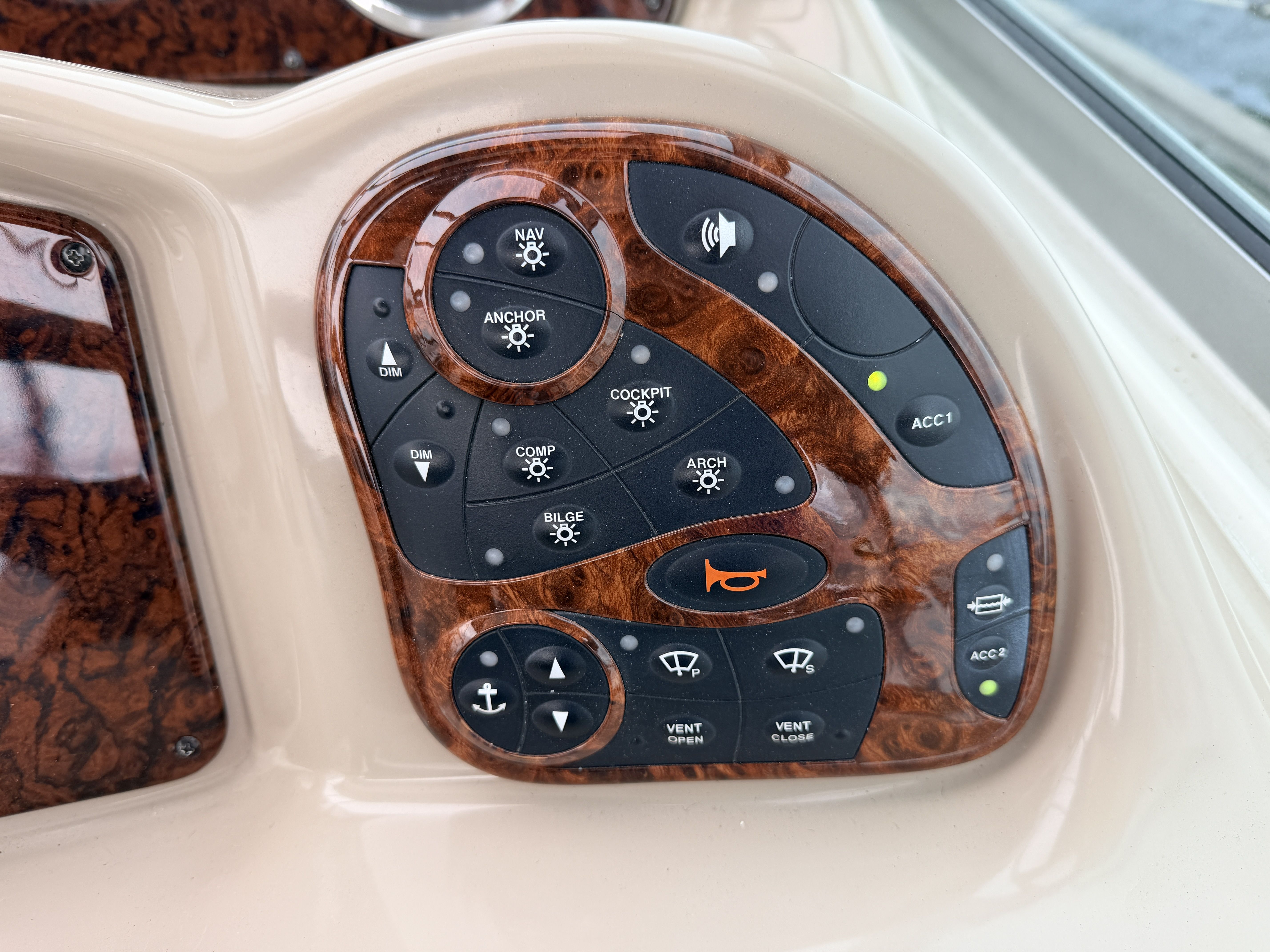 Featuring a striking black stripe down the sides and a sleek profile, this Sundancer stands out both in the marina and on the water. Full Enclosure, enhancing your onboard comfort during the shoulder seasons. Powered by a reliable engine paired with a Kohler generator, extended trips and onboard amenities are effortlessly supported.