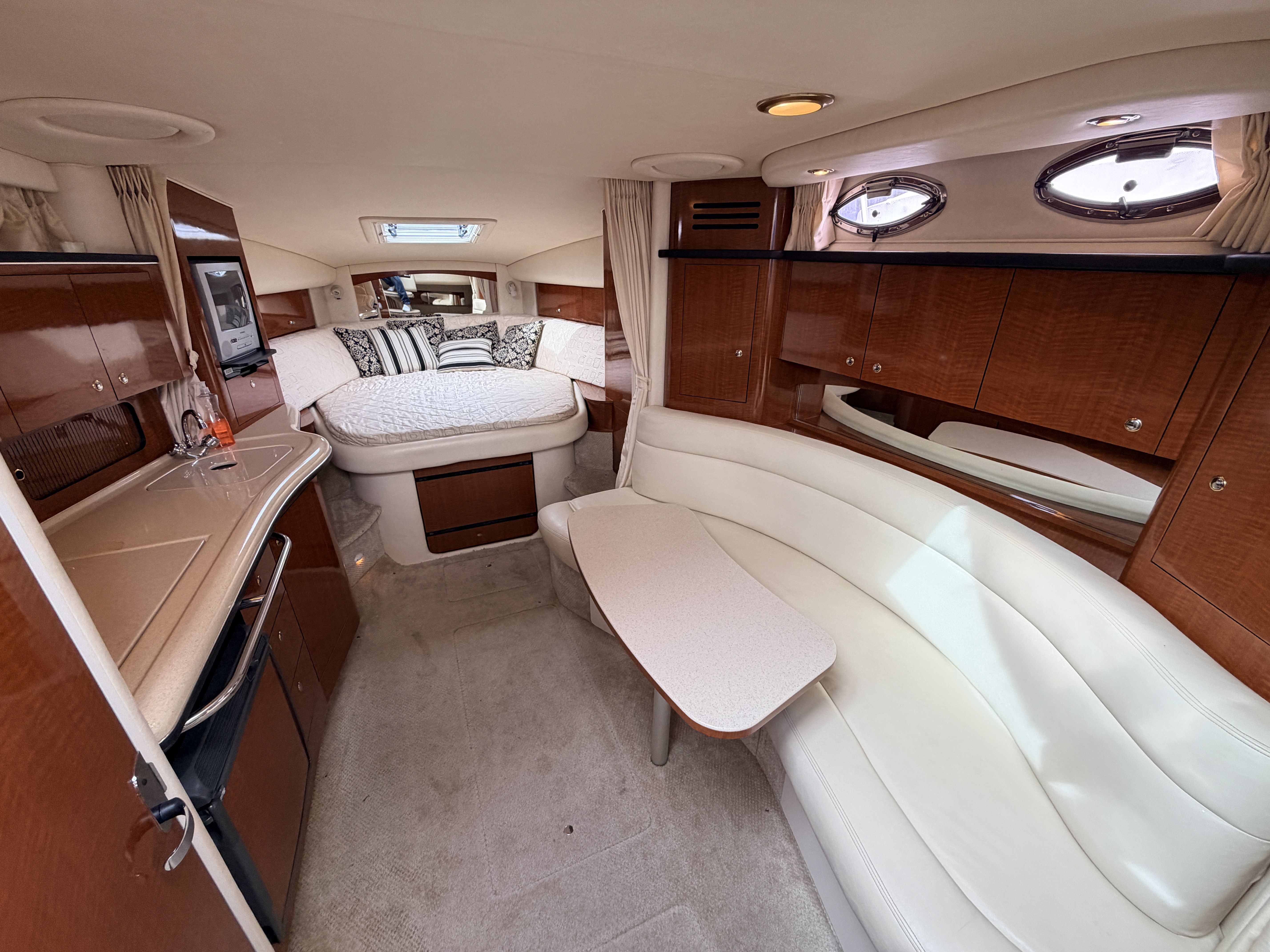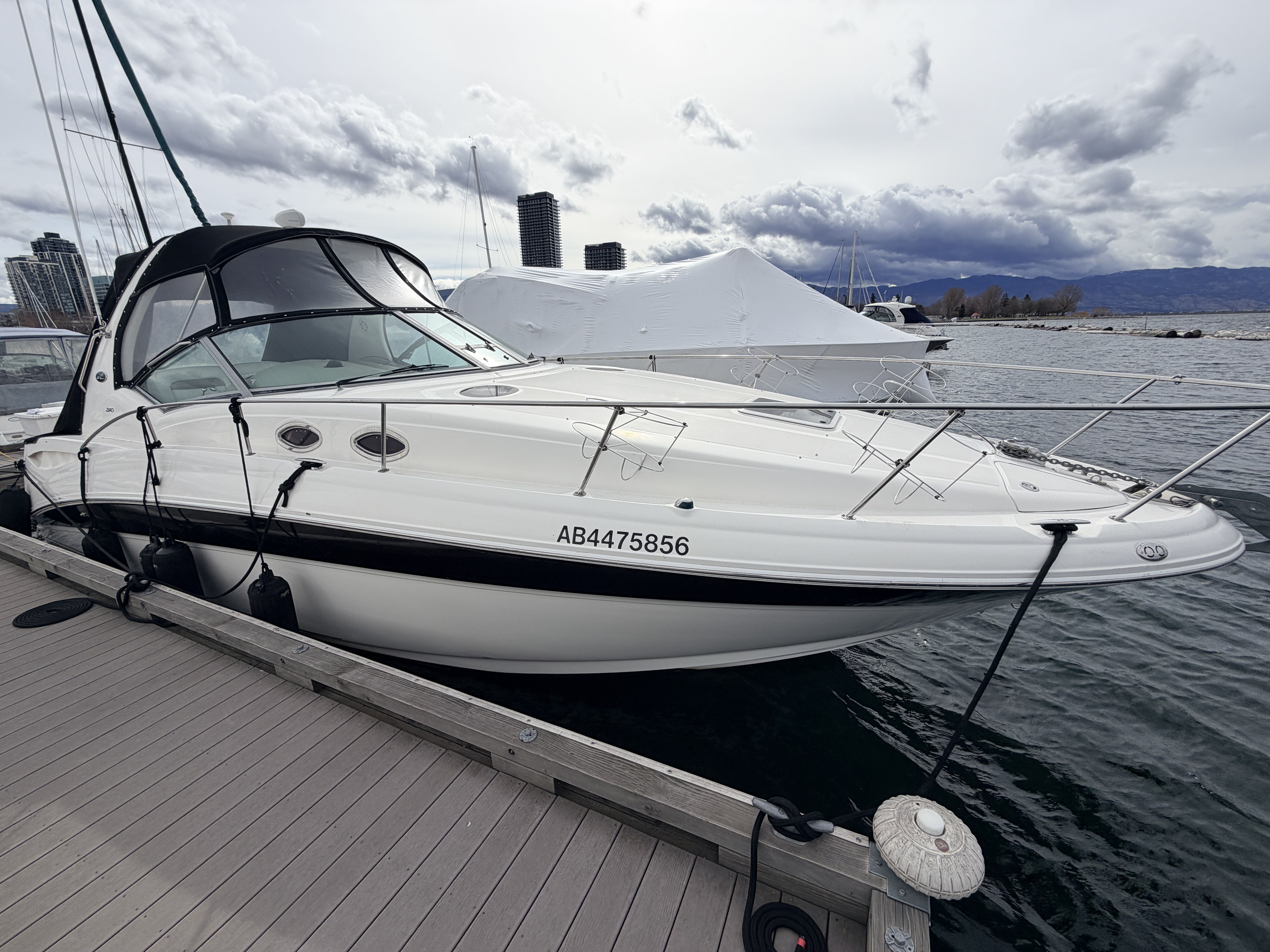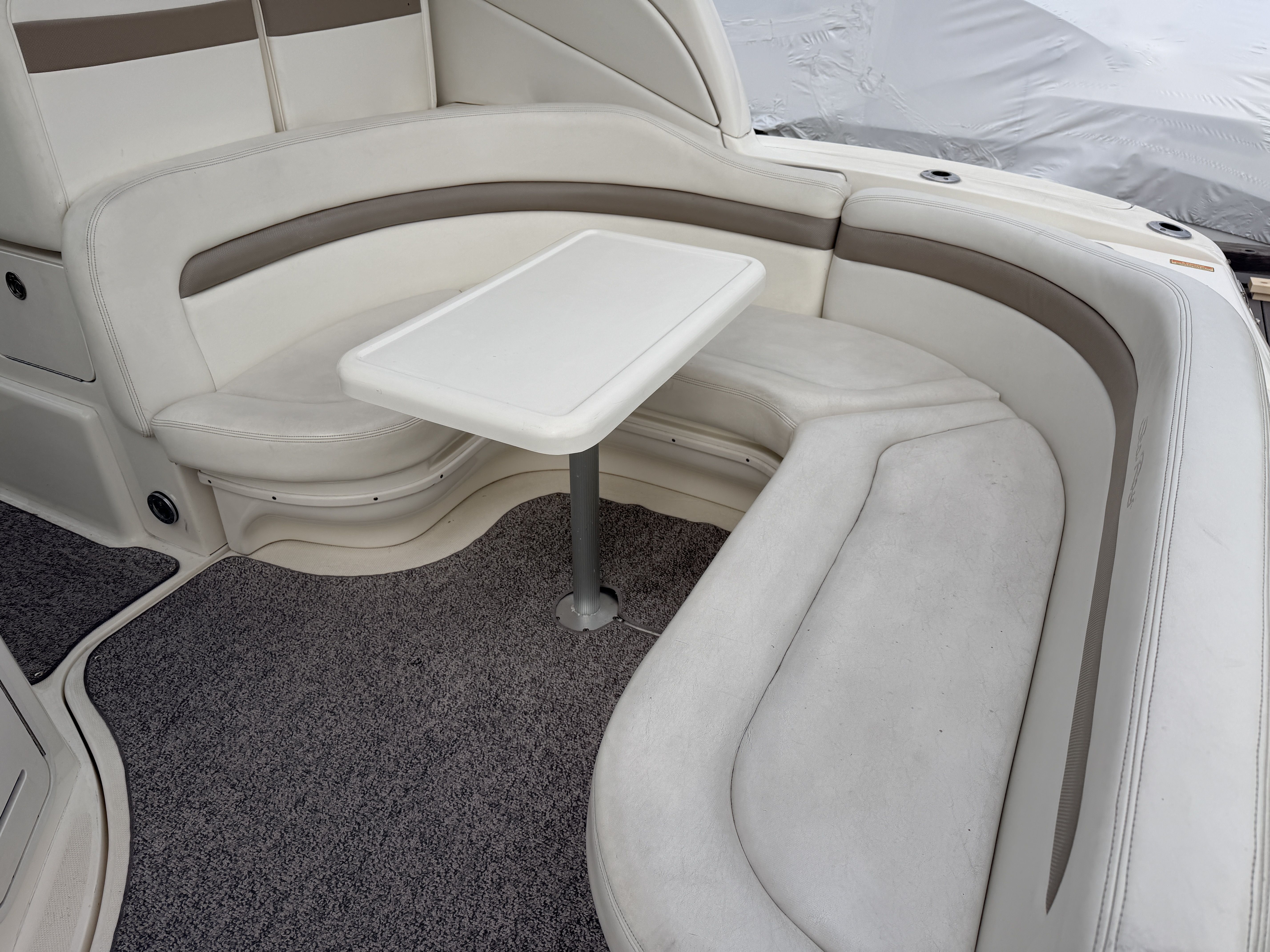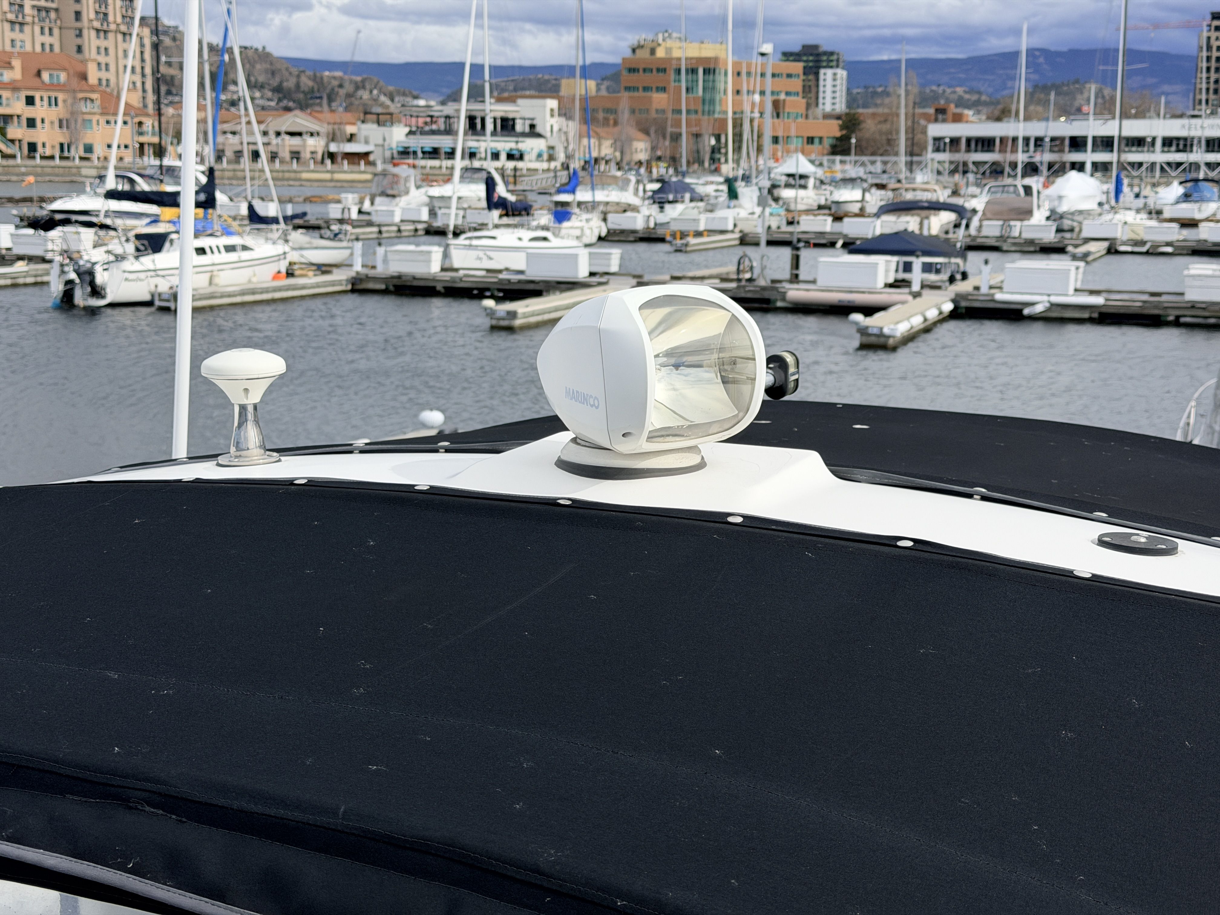 Featuring a striking black stripe down the sides and a sleek profile, this Sundancer stands out both in the marina and on the water. Full Enclosure, enhancing your onboard comfort during the shoulder seasons. Powered by a reliable engine paired with a Kohler generator, extended trips and onboard amenities are effortlessly supported.
