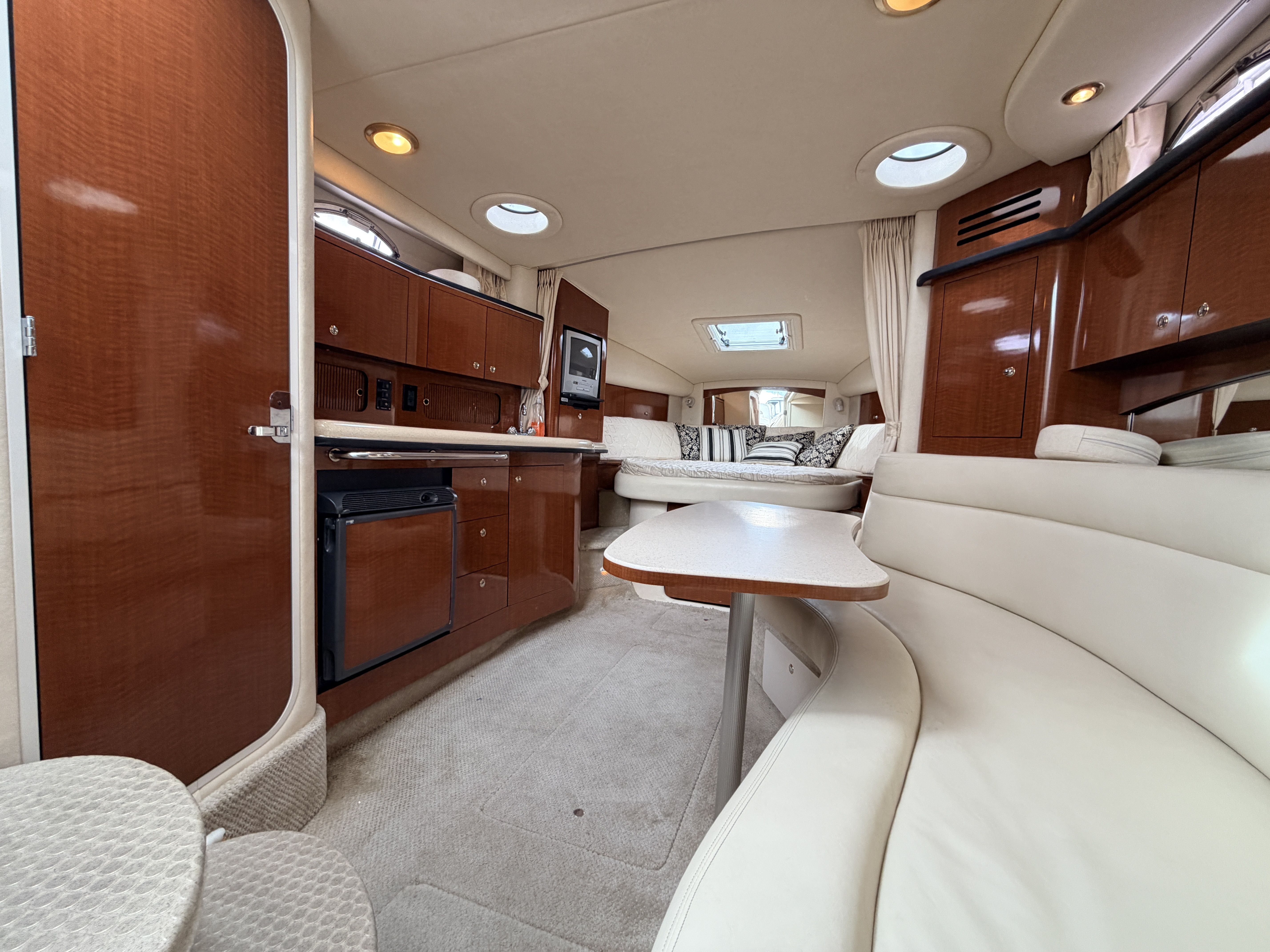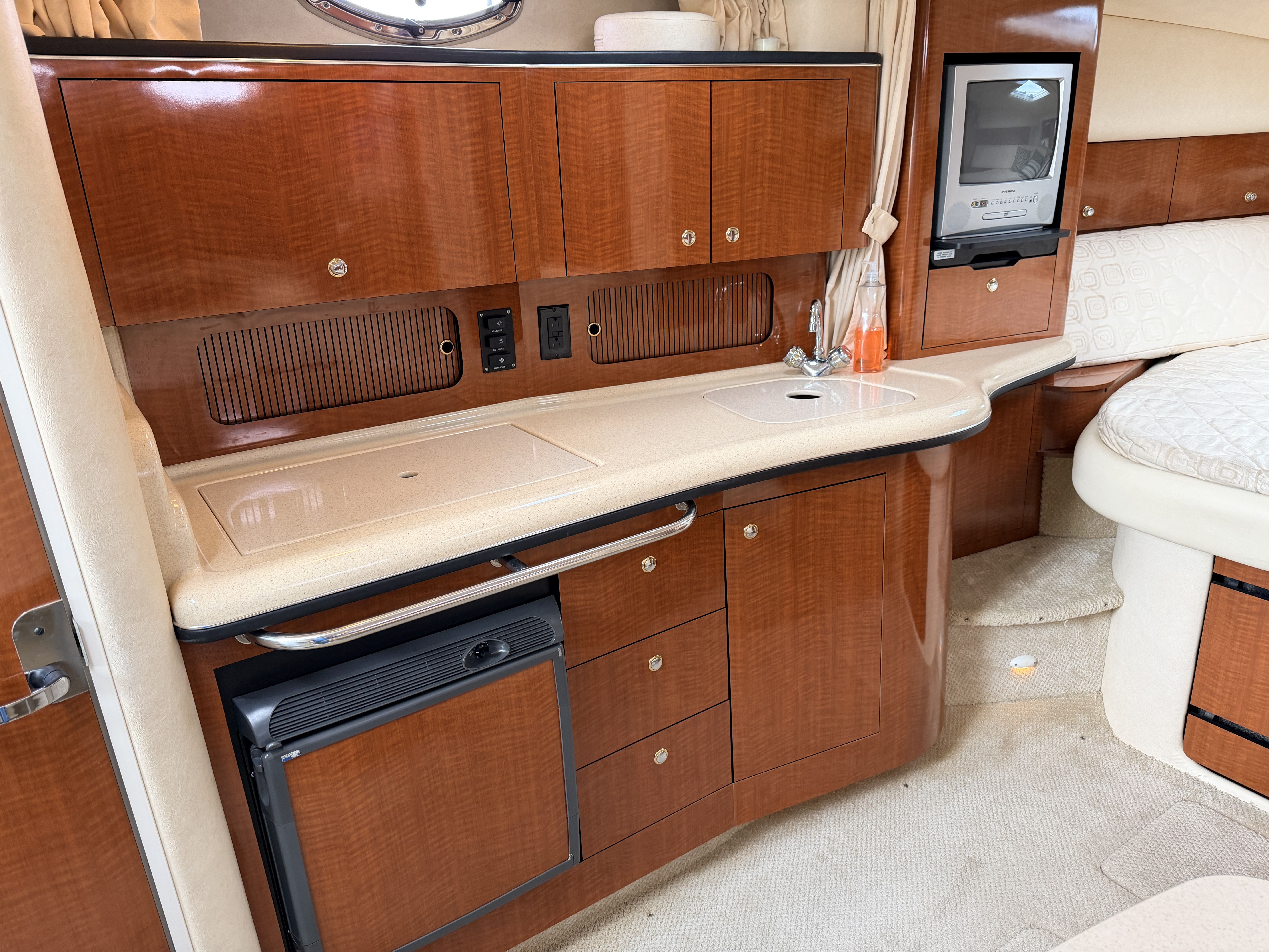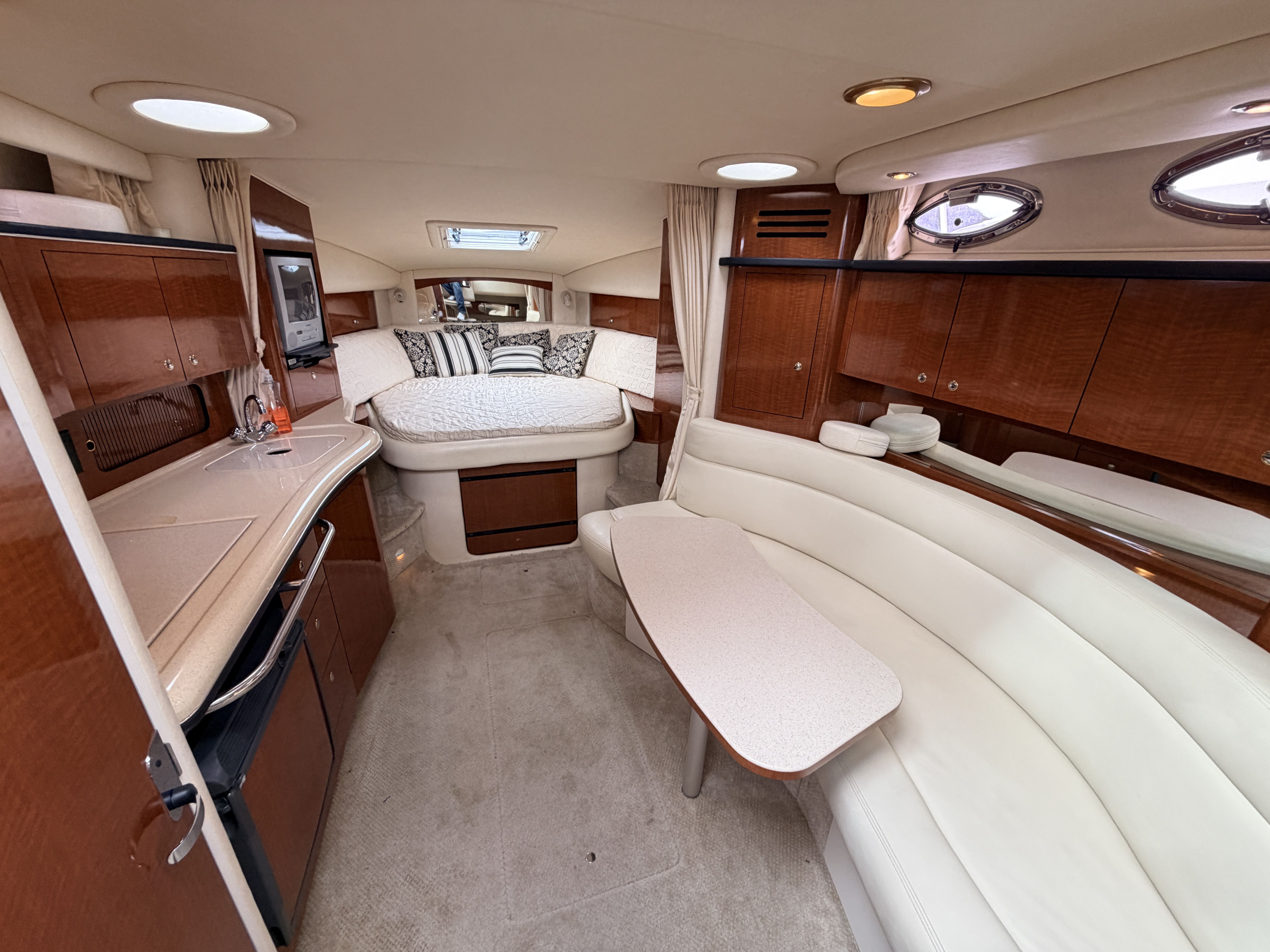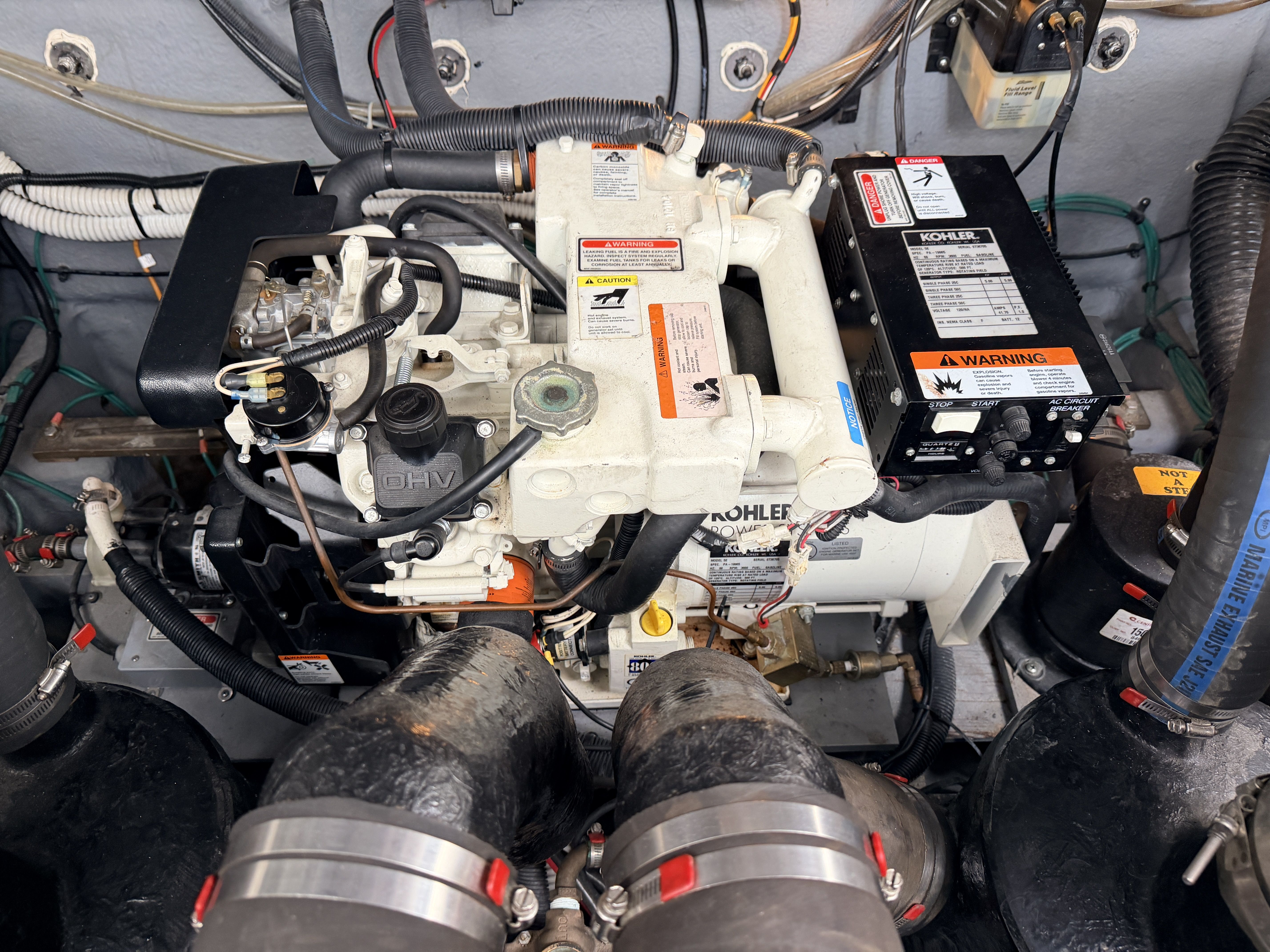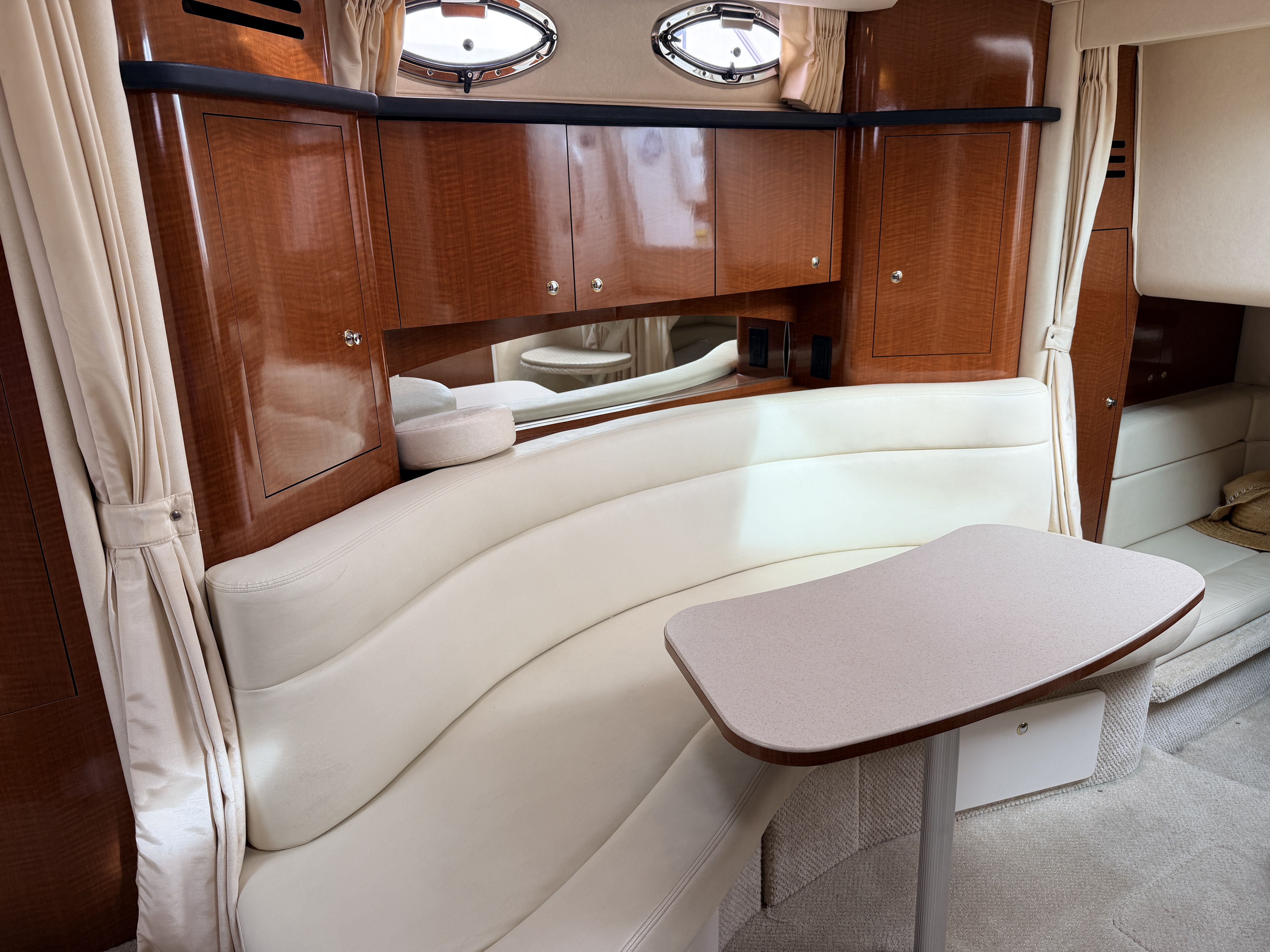 Featuring a striking black stripe down the sides and a sleek profile, this Sundancer stands out both in the marina and on the water. Full Enclosure, enhancing your onboard comfort during the shoulder seasons. Powered by a reliable engine paired with a Kohler generator, extended trips and onboard amenities are effortlessly supported.