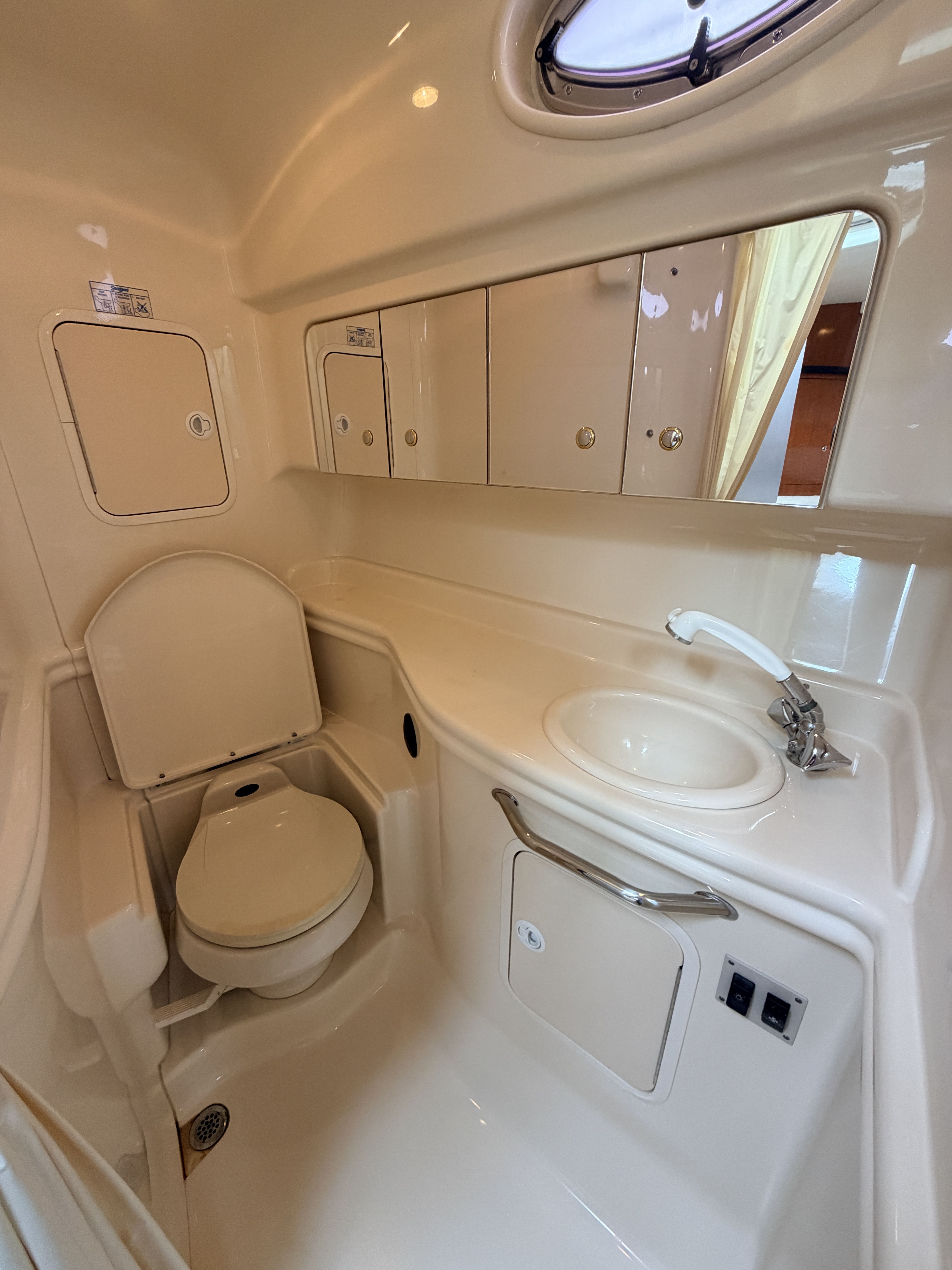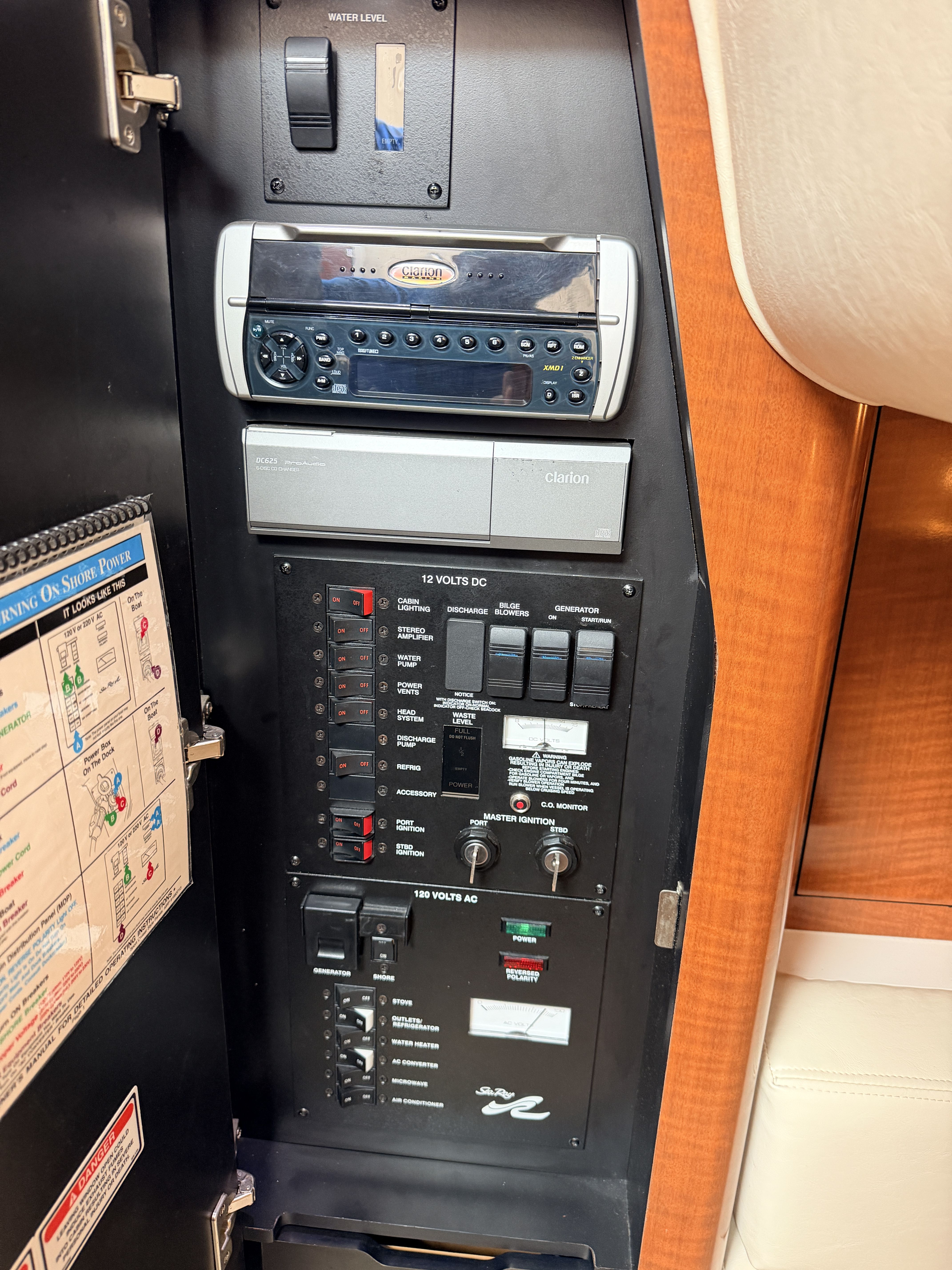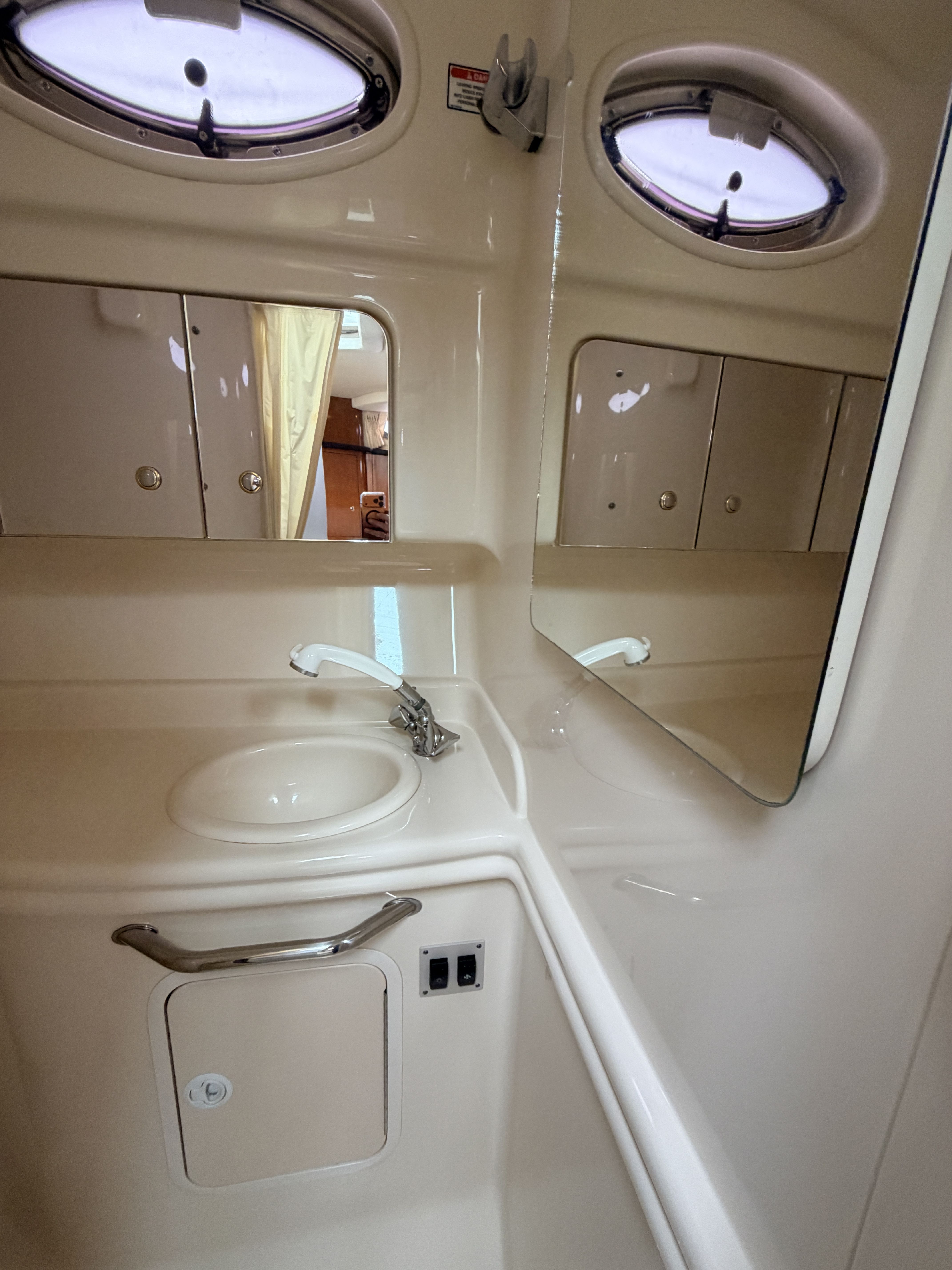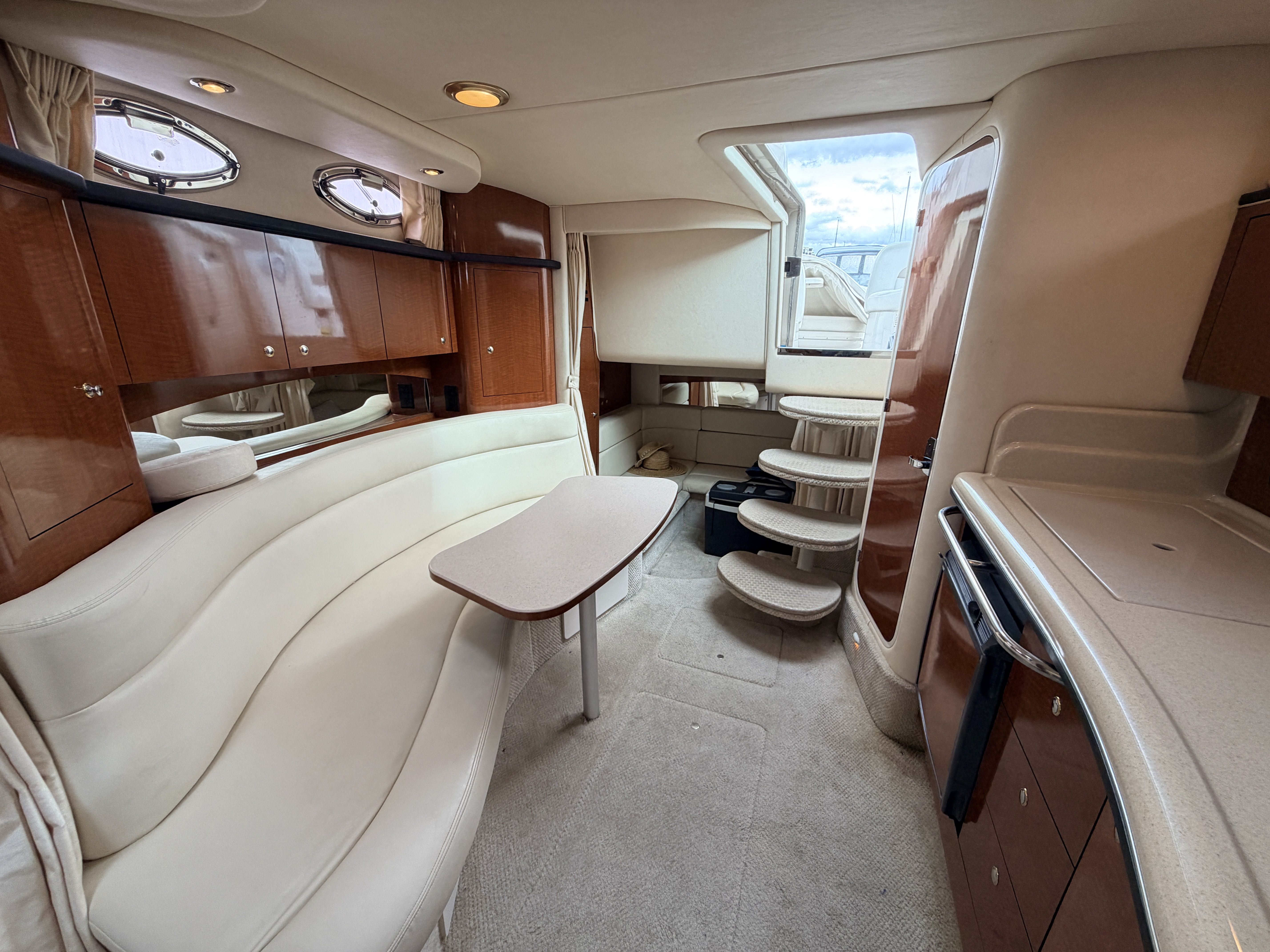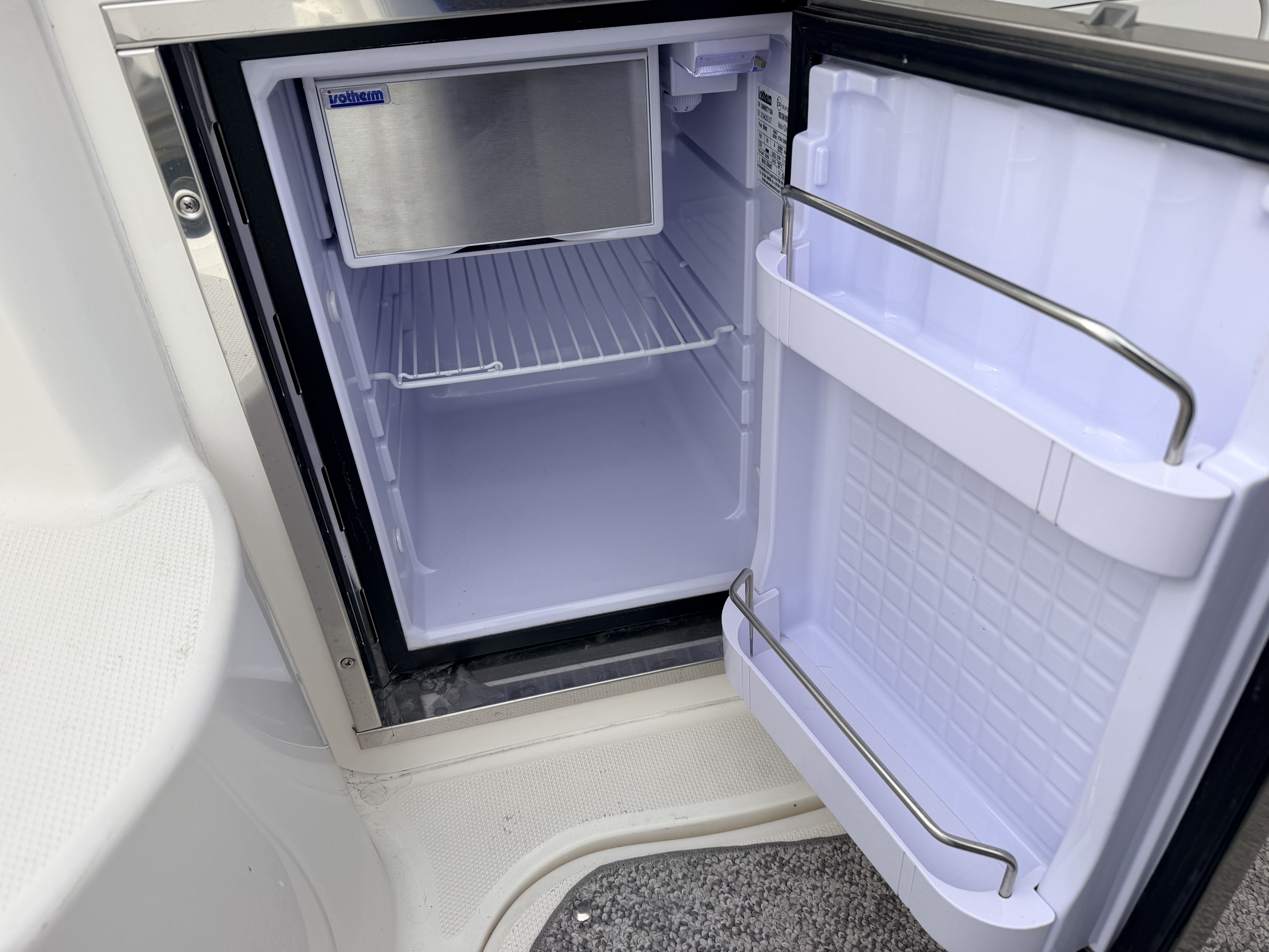 Featuring a striking black stripe down the sides and a sleek profile, this Sundancer stands out both in the marina and on the water. Full Enclosure, enhancing your onboard comfort during the shoulder seasons. Powered by a reliable engine paired with a Kohler generator, extended trips and onboard amenities are effortlessly supported.