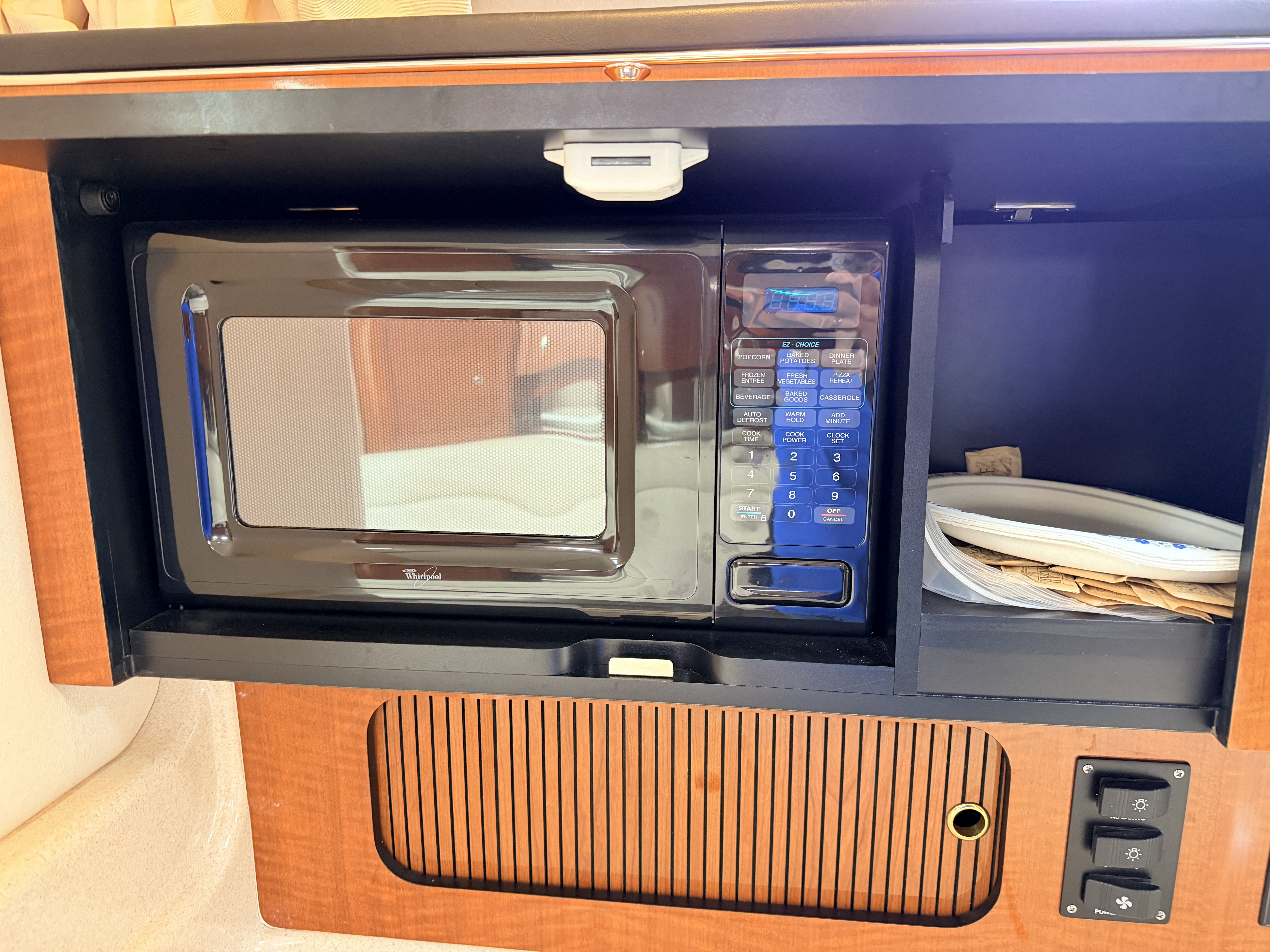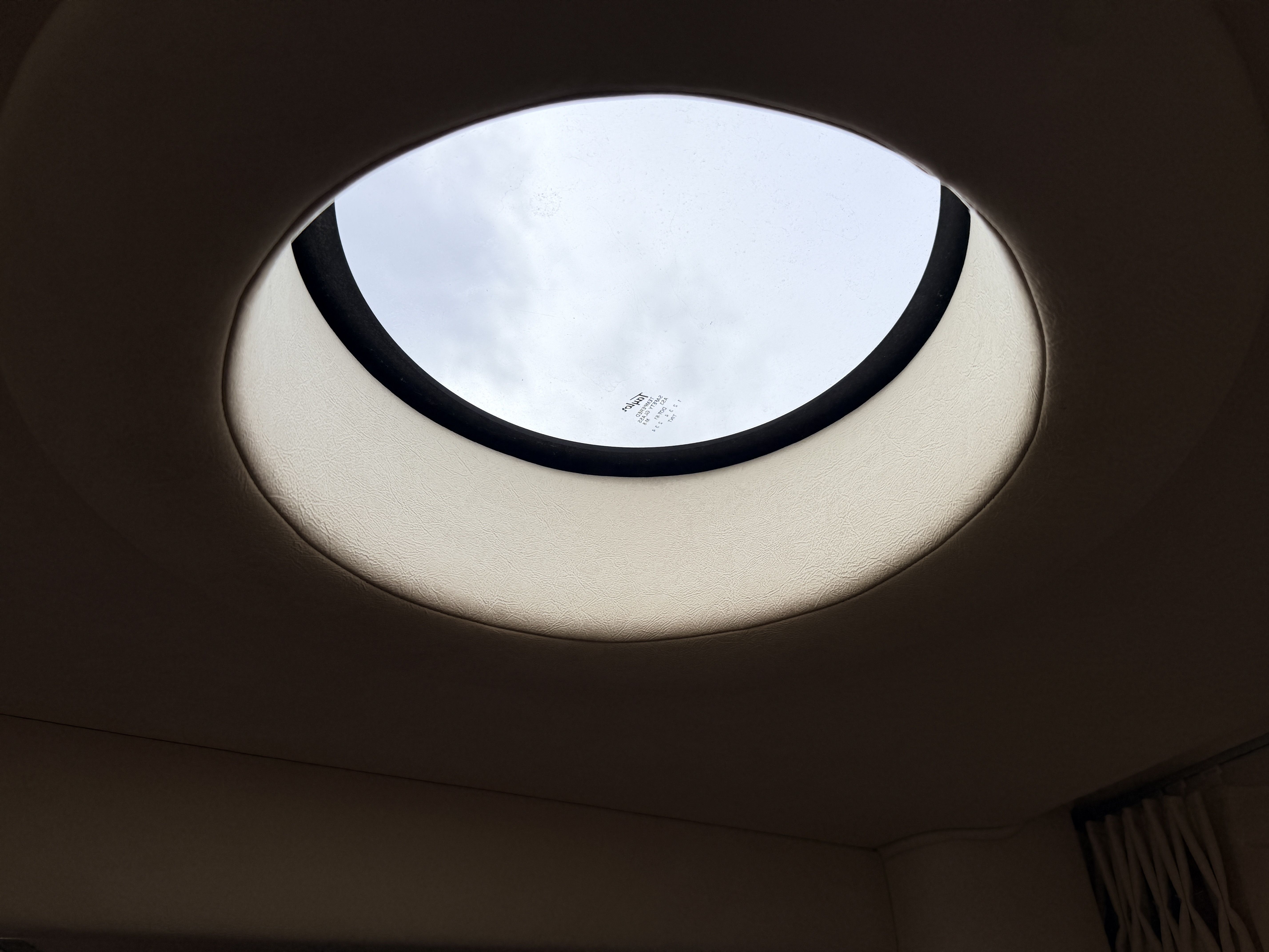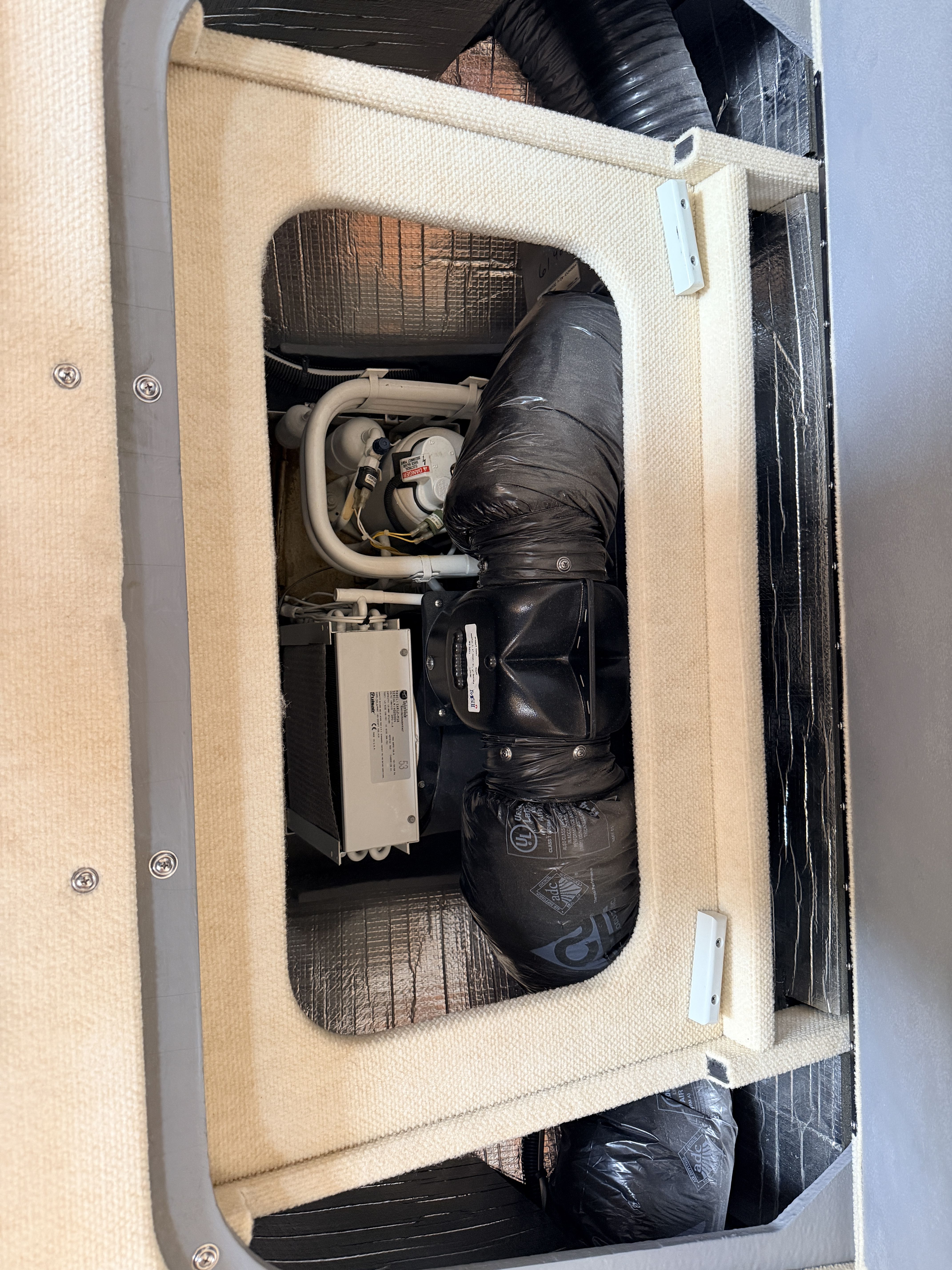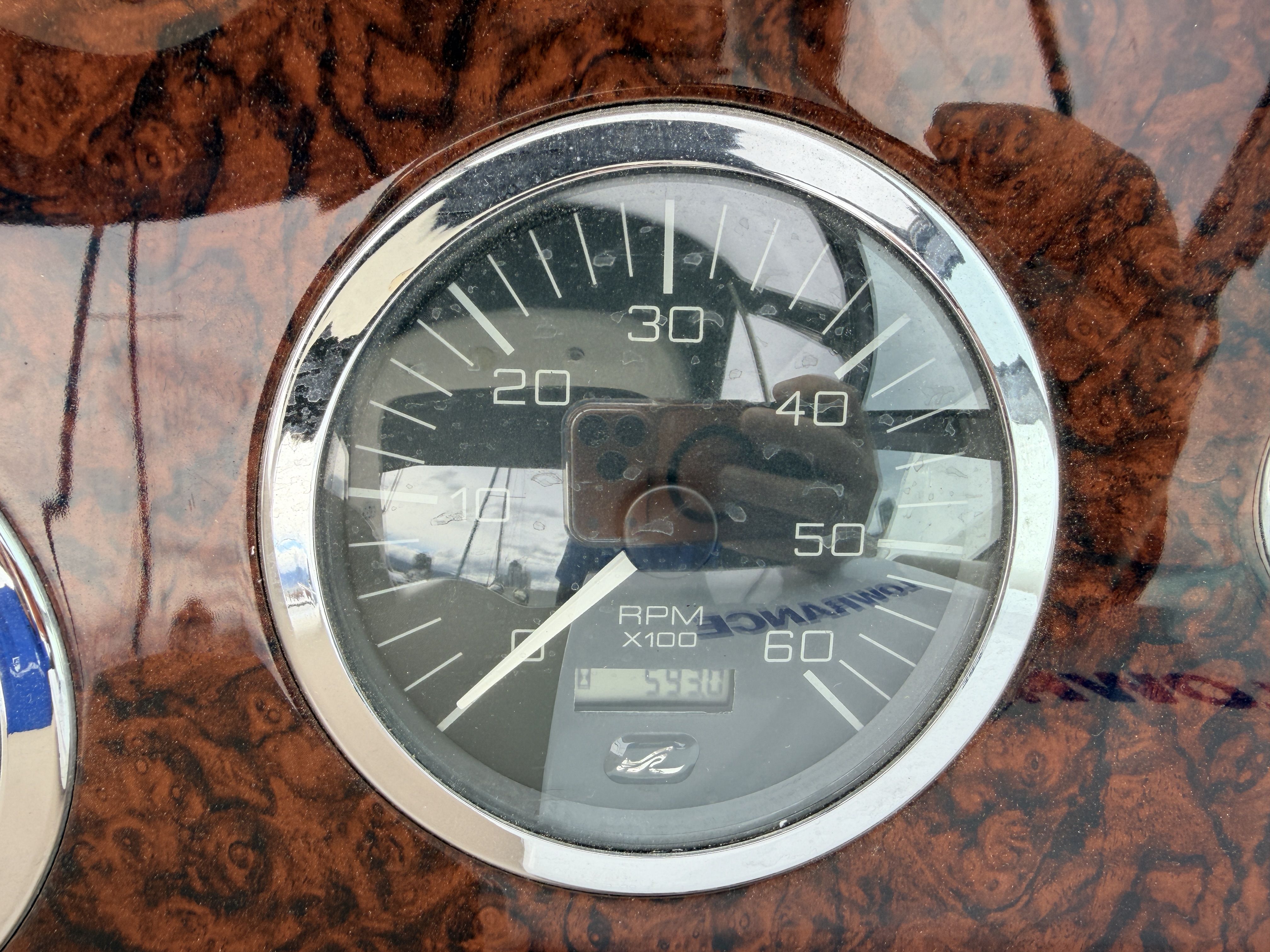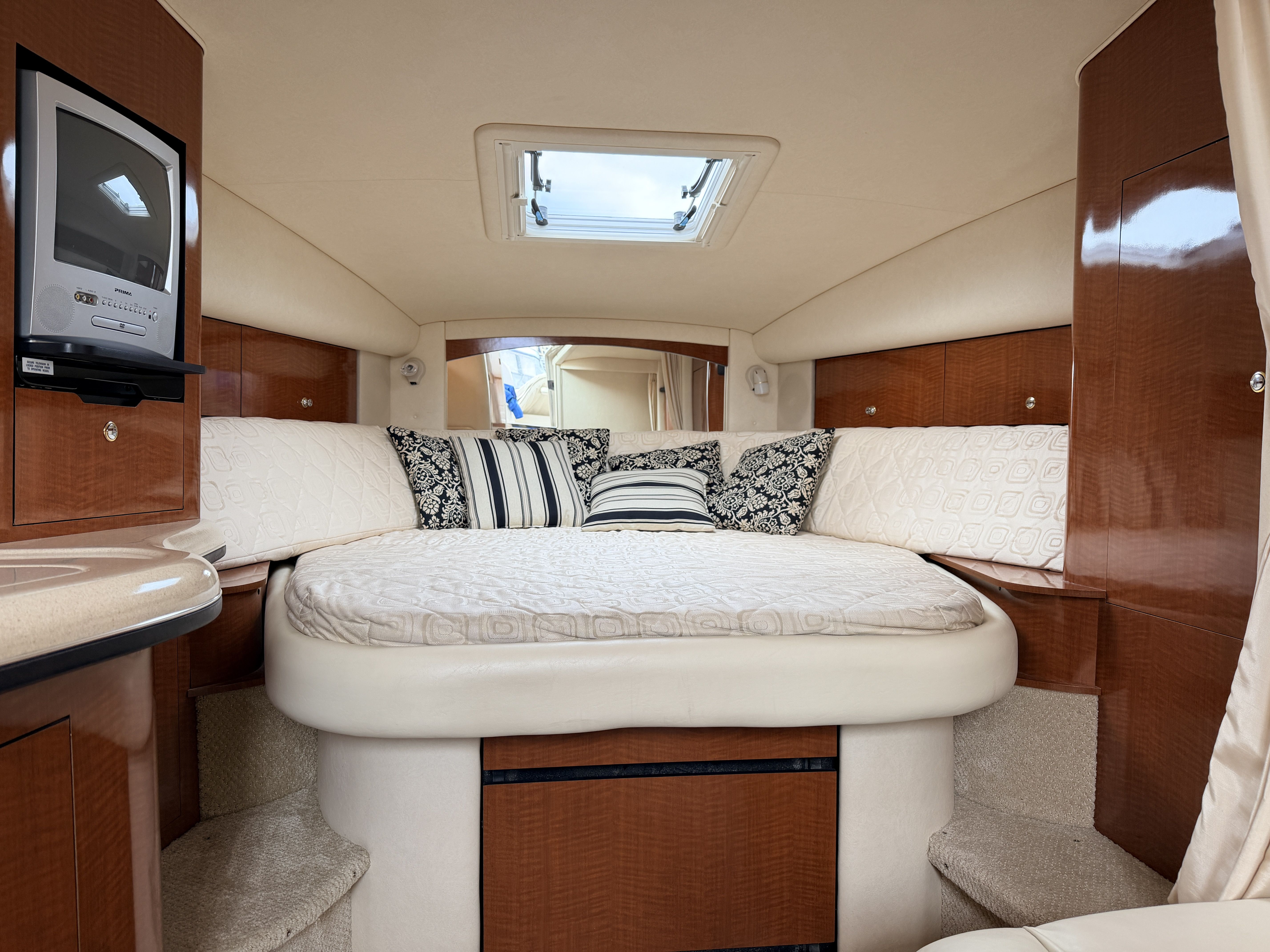 Featuring a striking black stripe down the sides and a sleek profile, this Sundancer stands out both in the marina and on the water. Full Enclosure, enhancing your onboard comfort during the shoulder seasons. Powered by a reliable engine paired with a Kohler generator, extended trips and onboard amenities are effortlessly supported.