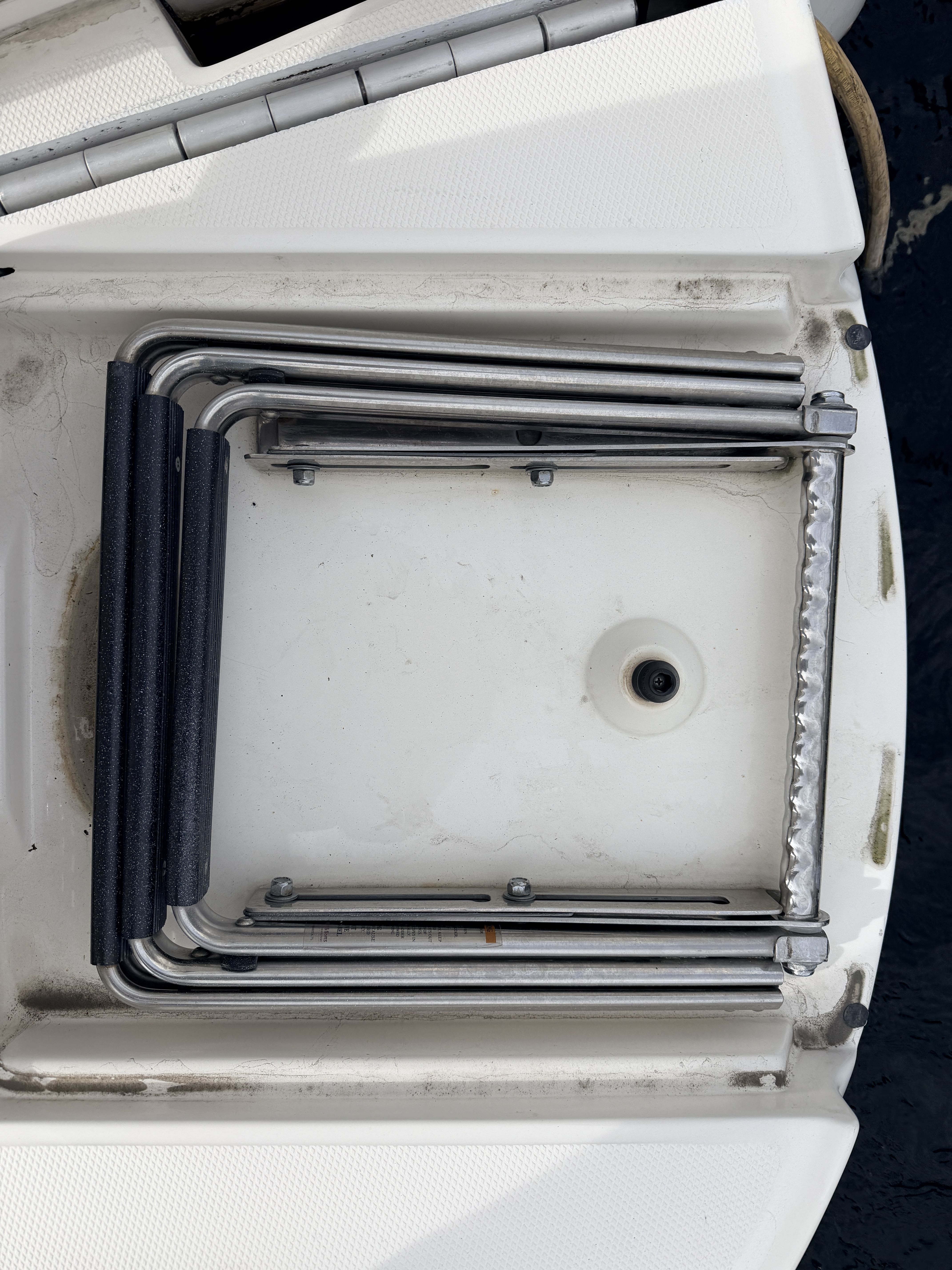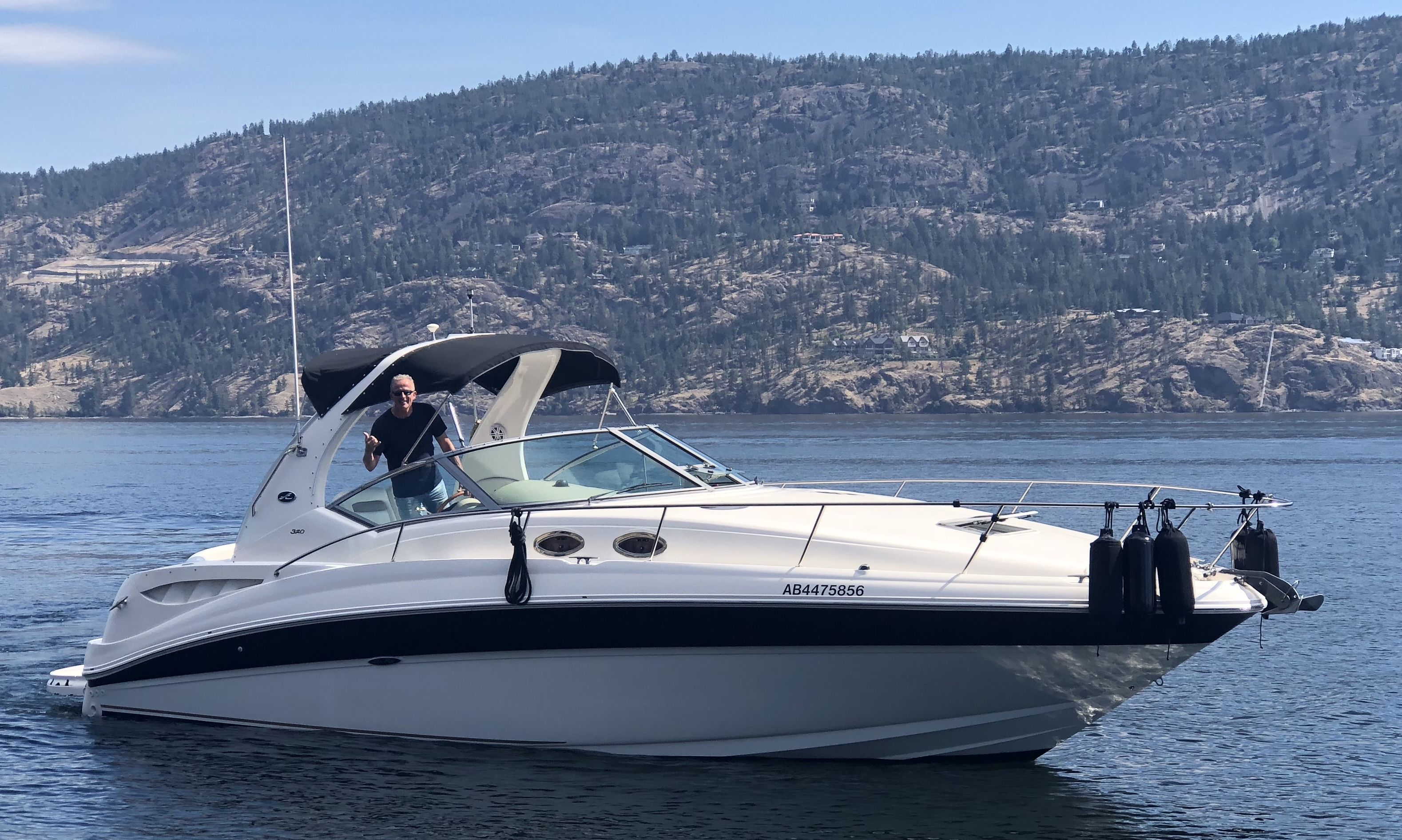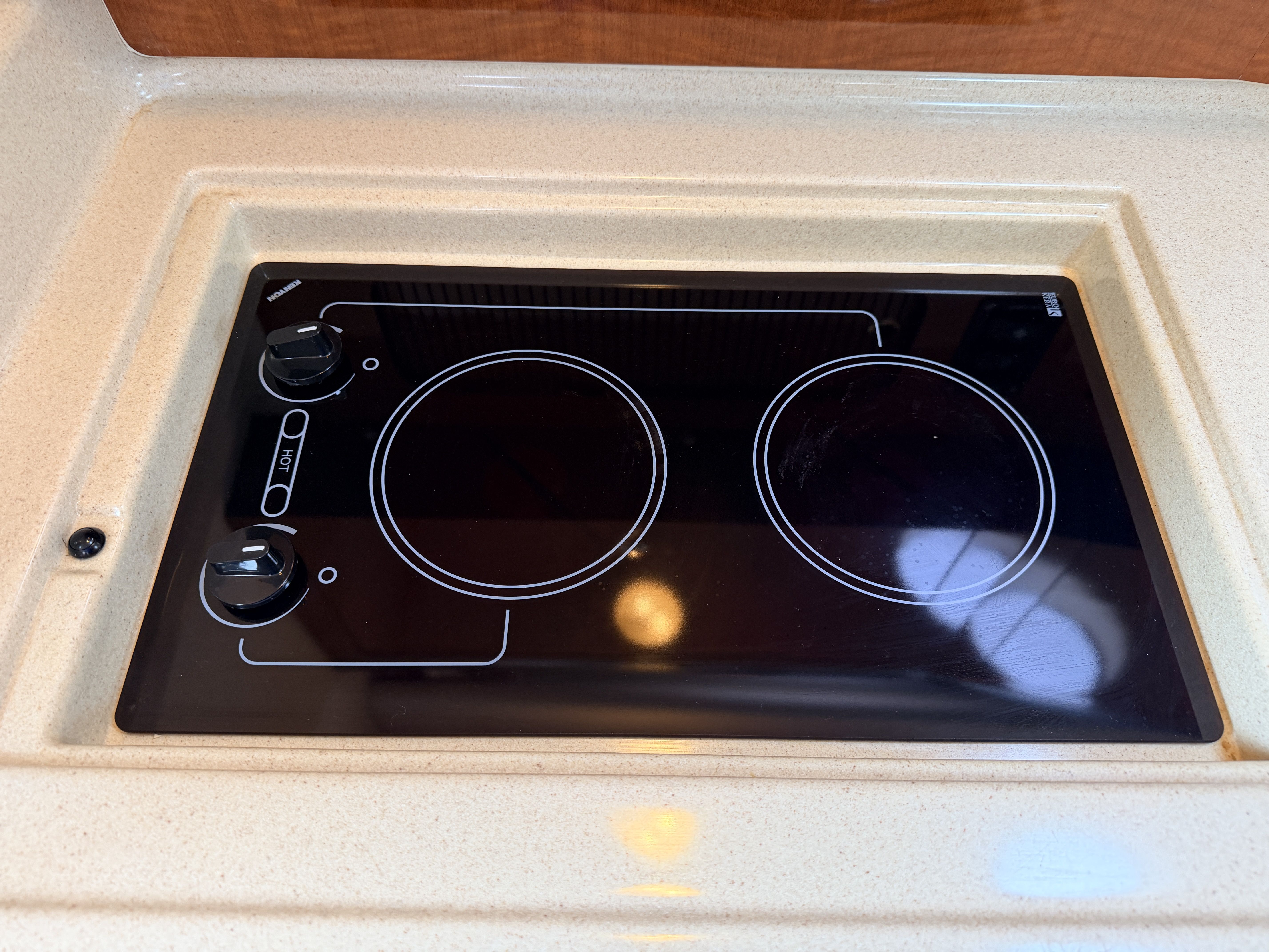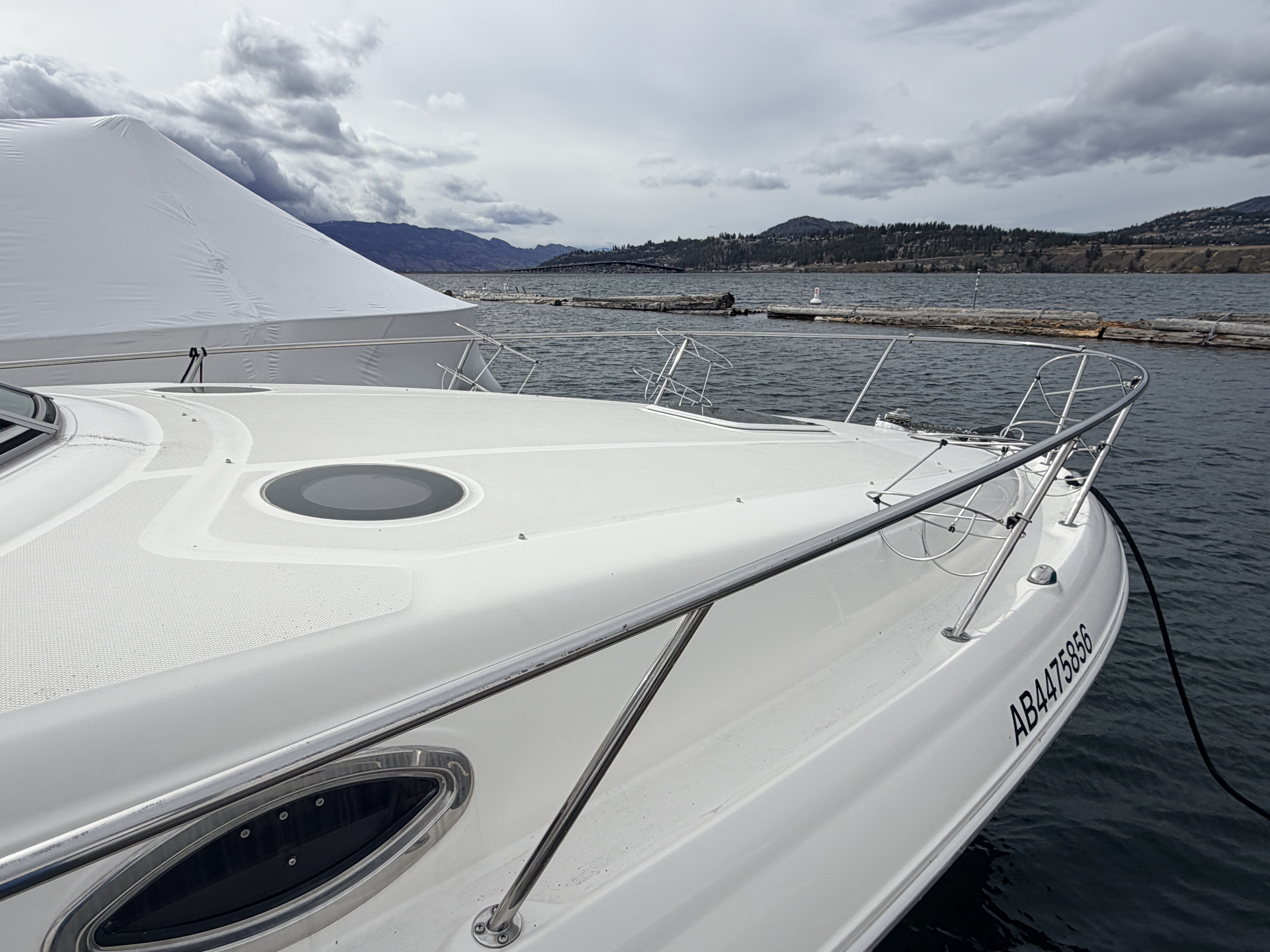 Featuring a striking black stripe down the sides and a sleek profile, this Sundancer stands out both in the marina and on the water. Full Enclosure, enhancing your onboard comfort during the shoulder seasons. Powered by a reliable engine paired with a Kohler generator, extended trips and onboard amenities are effortlessly supported.