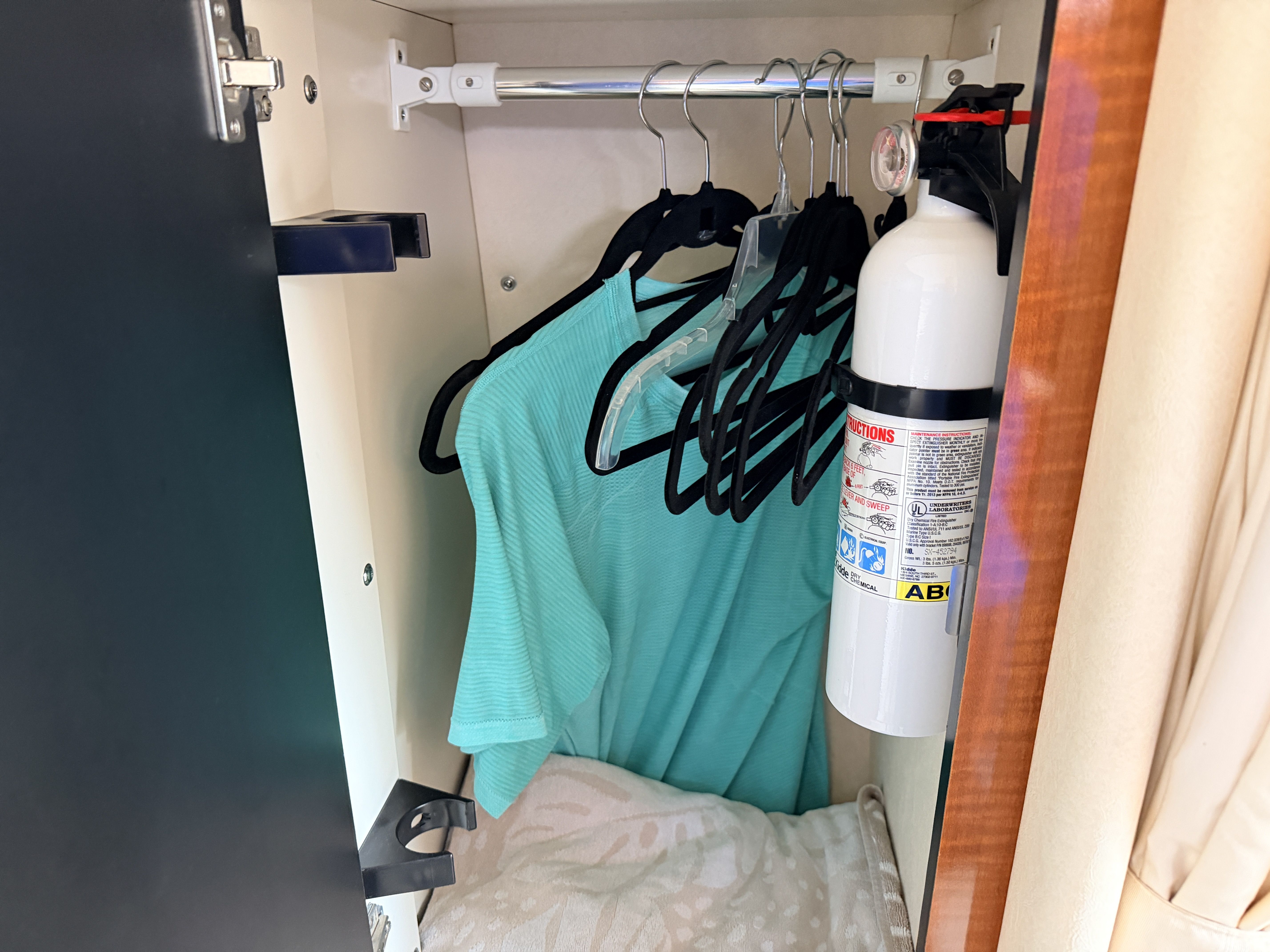 Queen sized walk-around v-birth with hanging lockers and privacy curtains