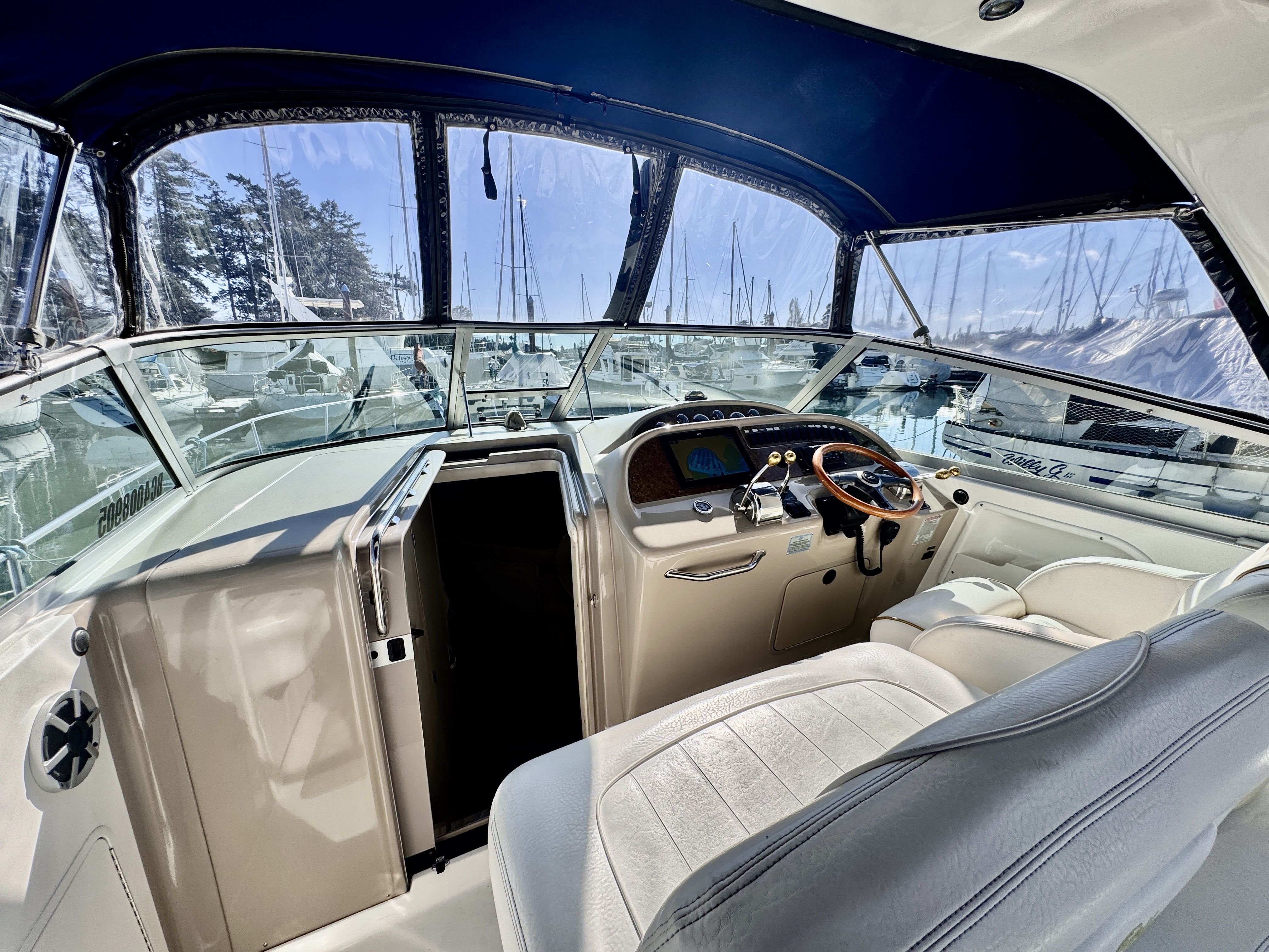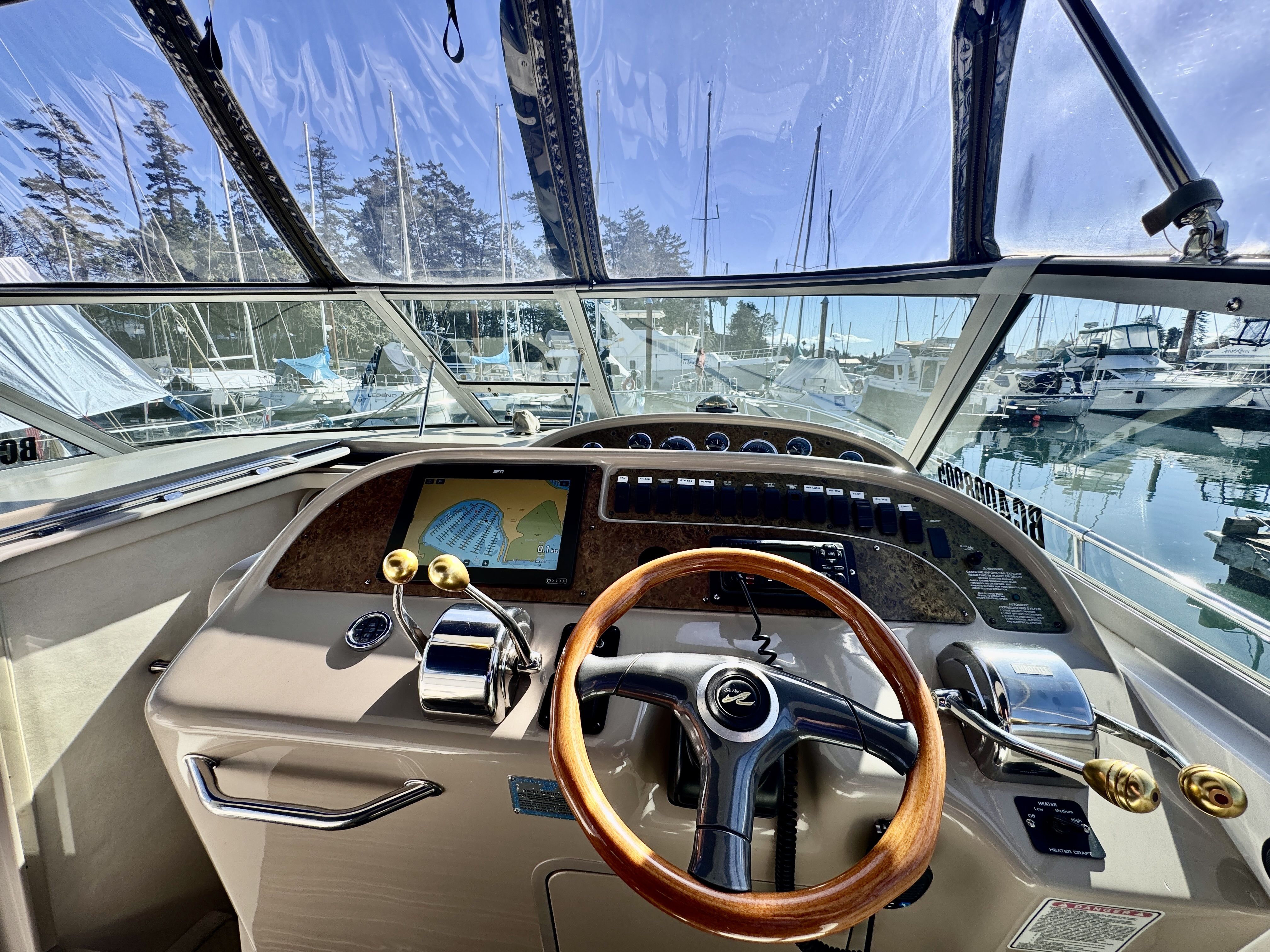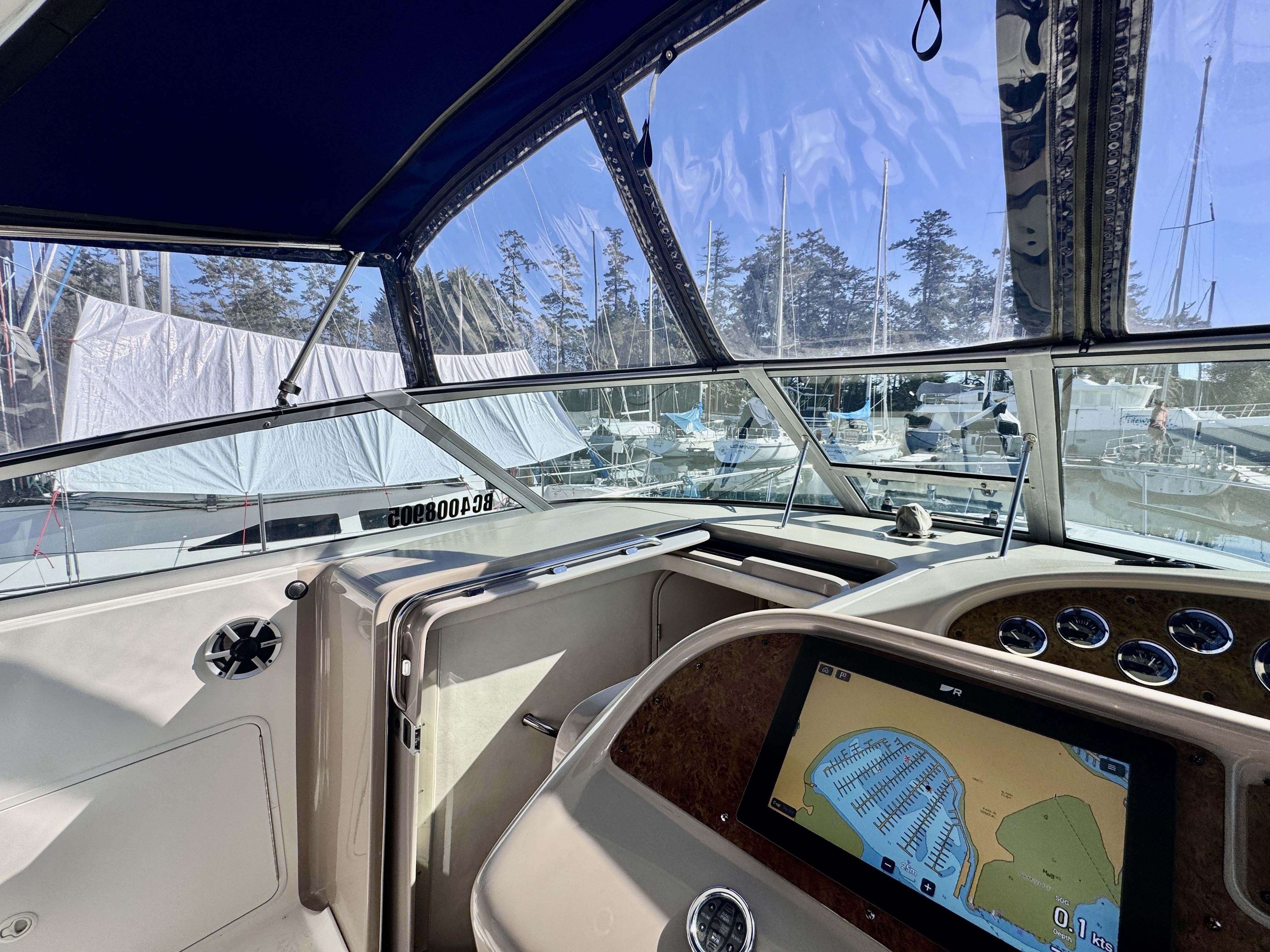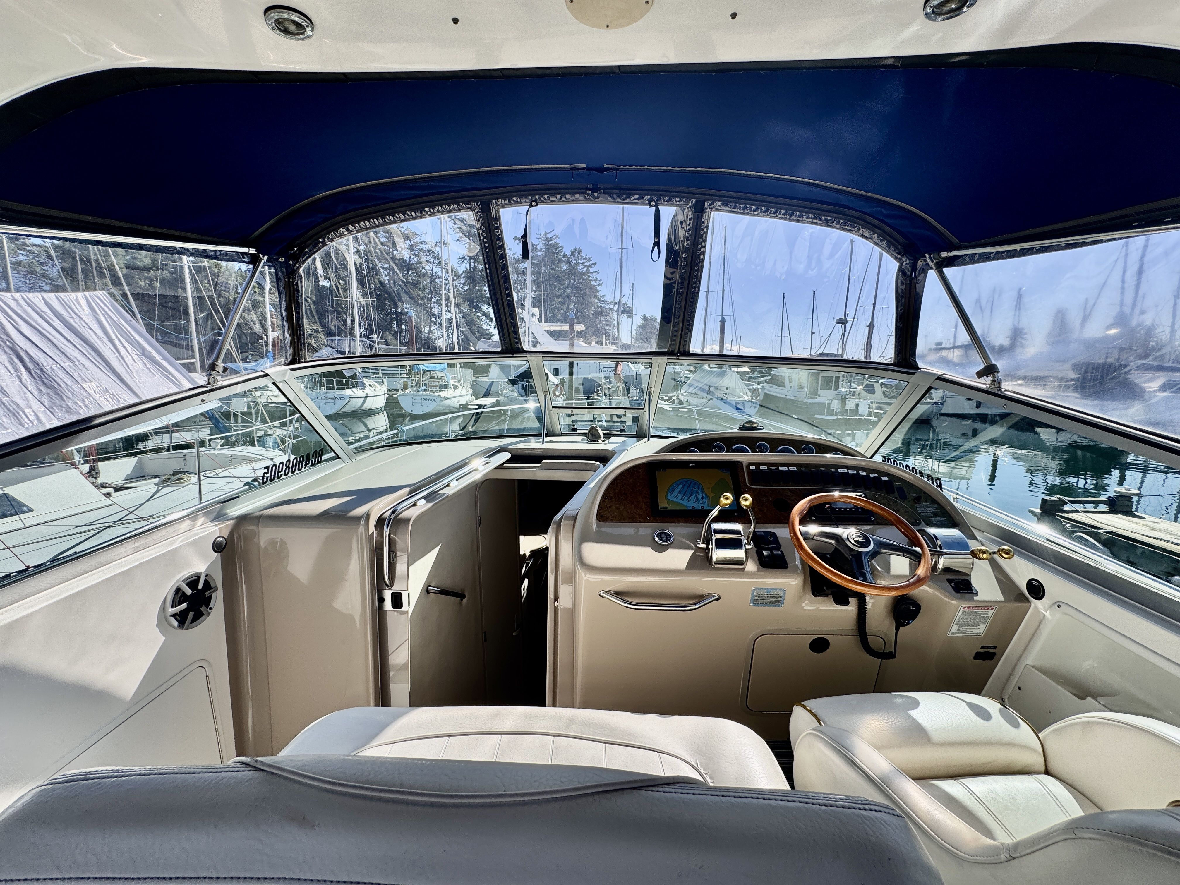 The twin MerCruiser 5.7L engines were professionally rebuilt in 2023 and have logged only 20 hours since. Freshwater cooling keeps those powerplants running at optimal temperature and adds long term reliability. A Raymarine multifunction display and radar were installed in 2022, giving you a current, capable helm.