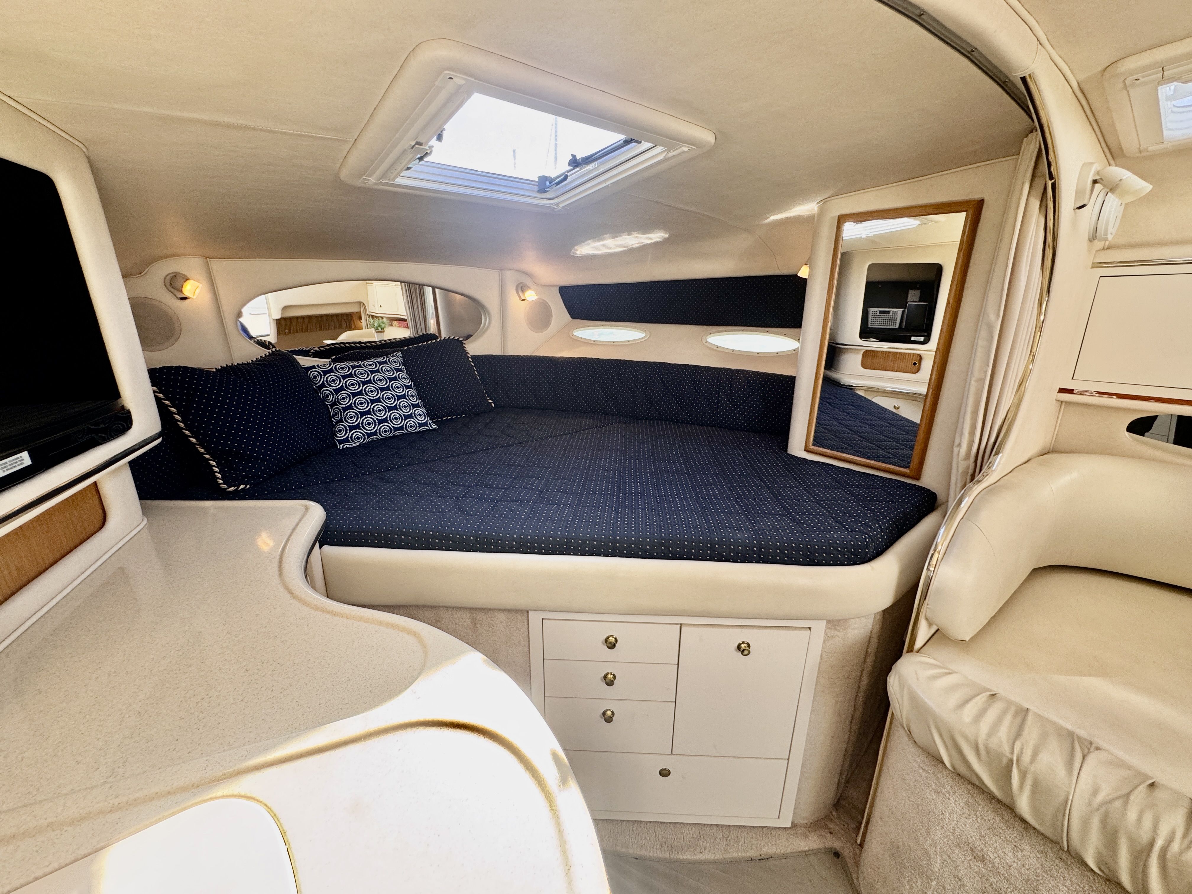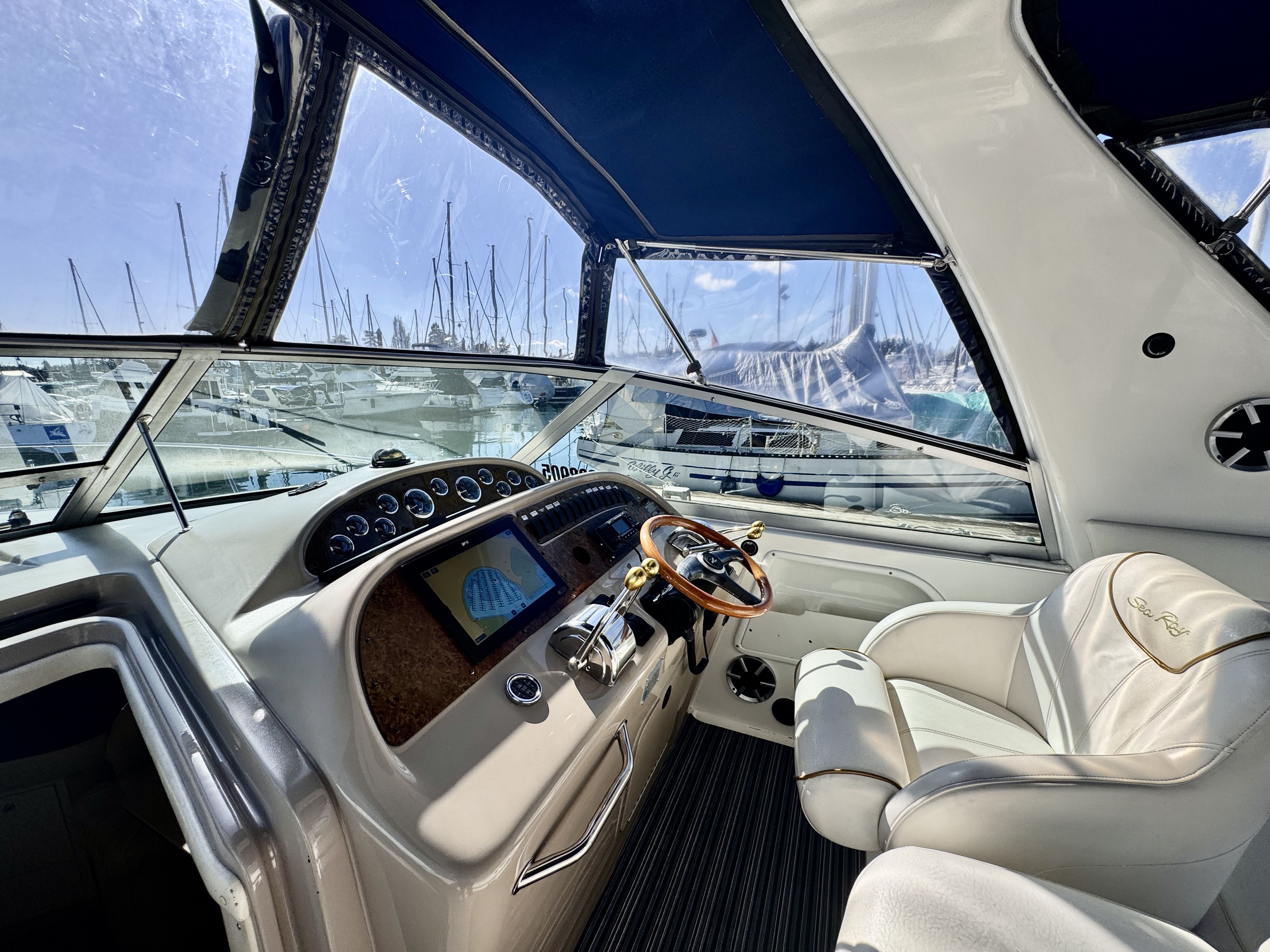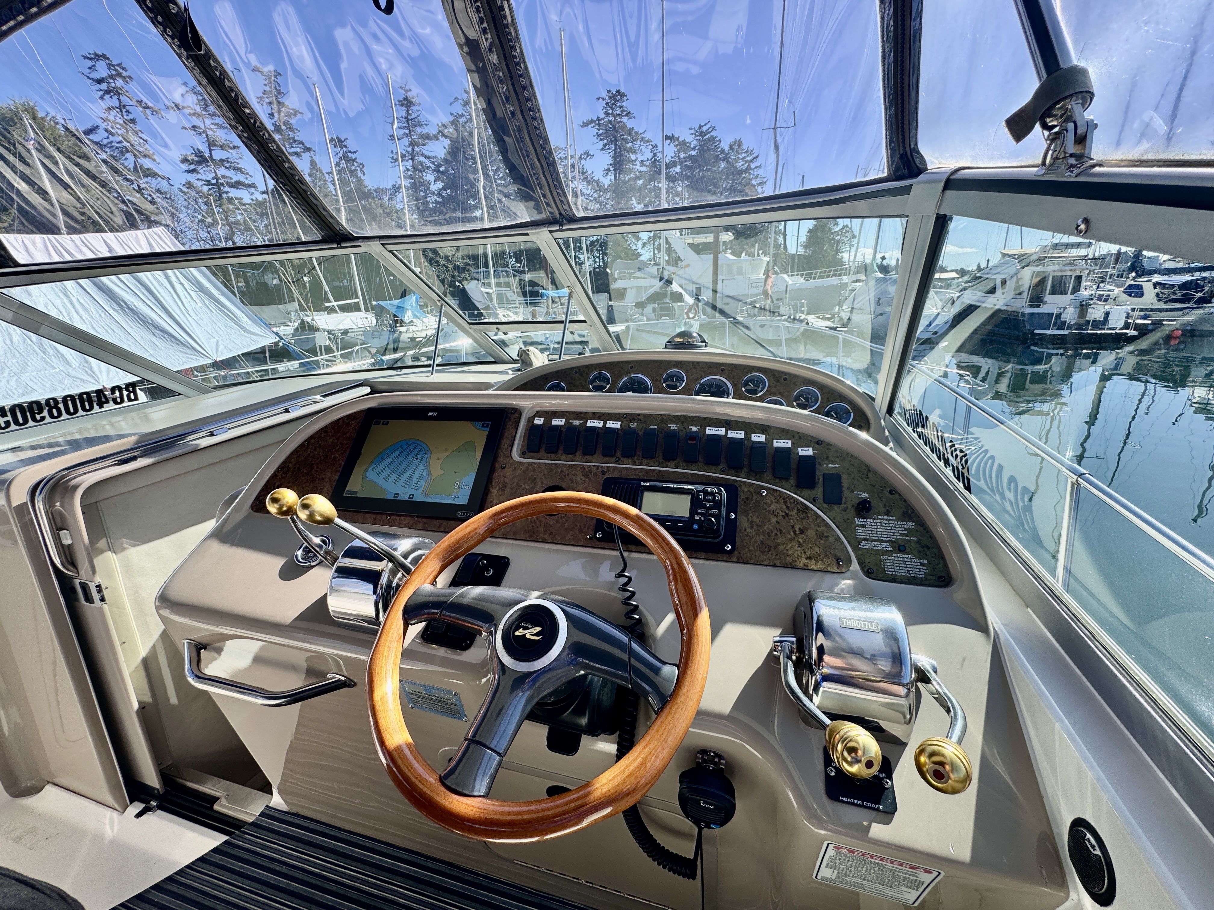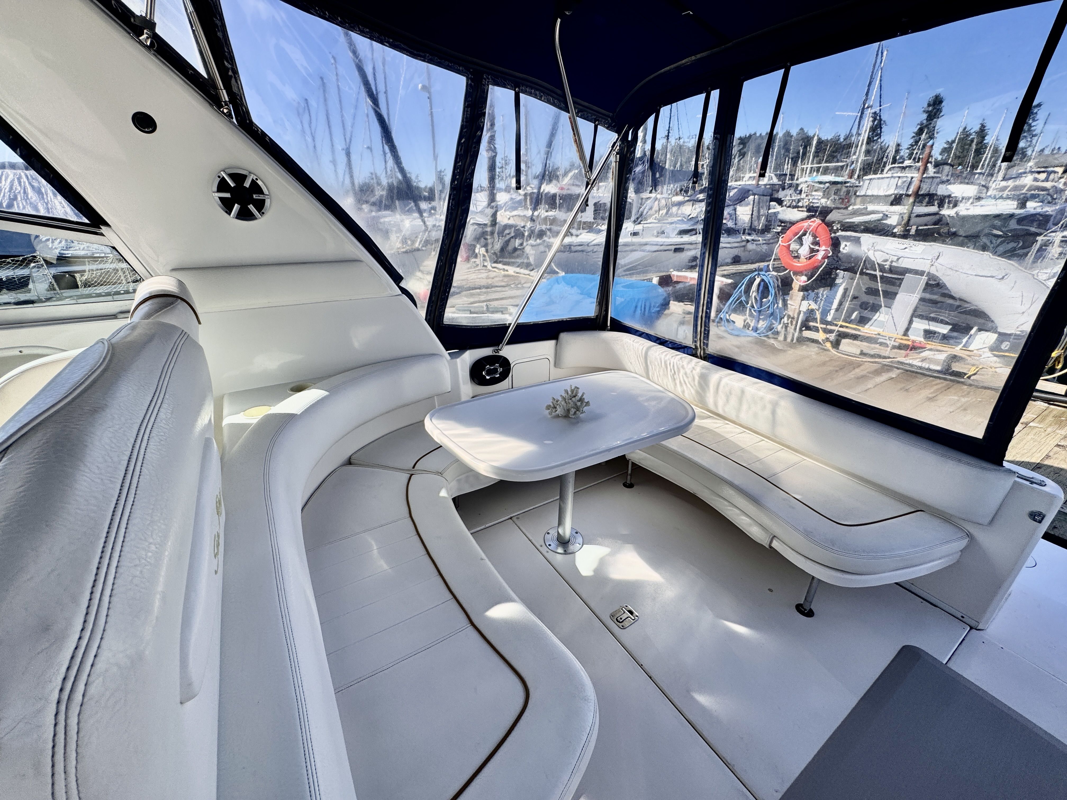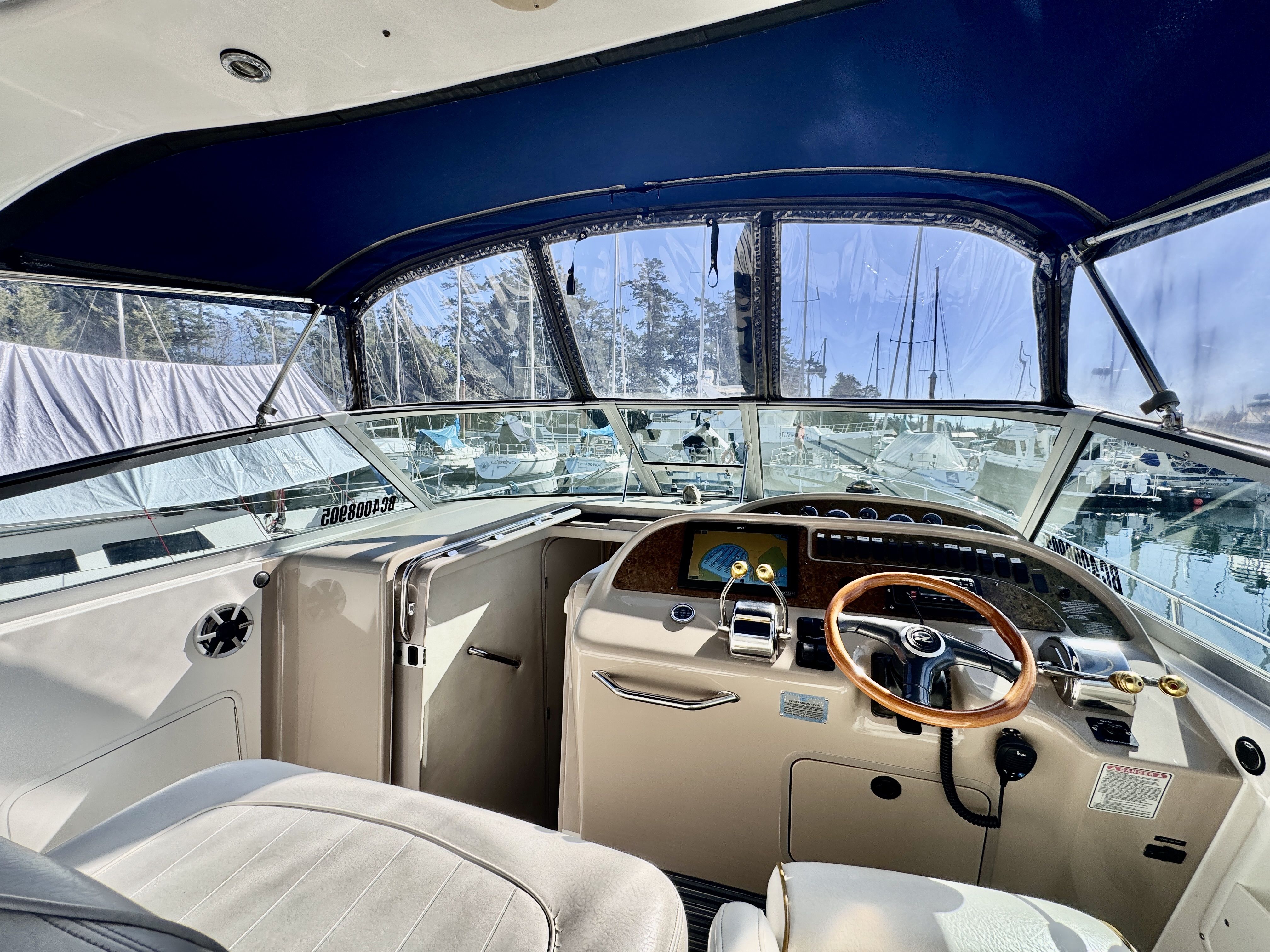 The twin MerCruiser 5.7L engines were professionally rebuilt in 2023 and have logged only 20 hours since. Freshwater cooling keeps those powerplants running at optimal temperature and adds long term reliability. A Raymarine multifunction display and radar were installed in 2022, giving you a current, capable helm.