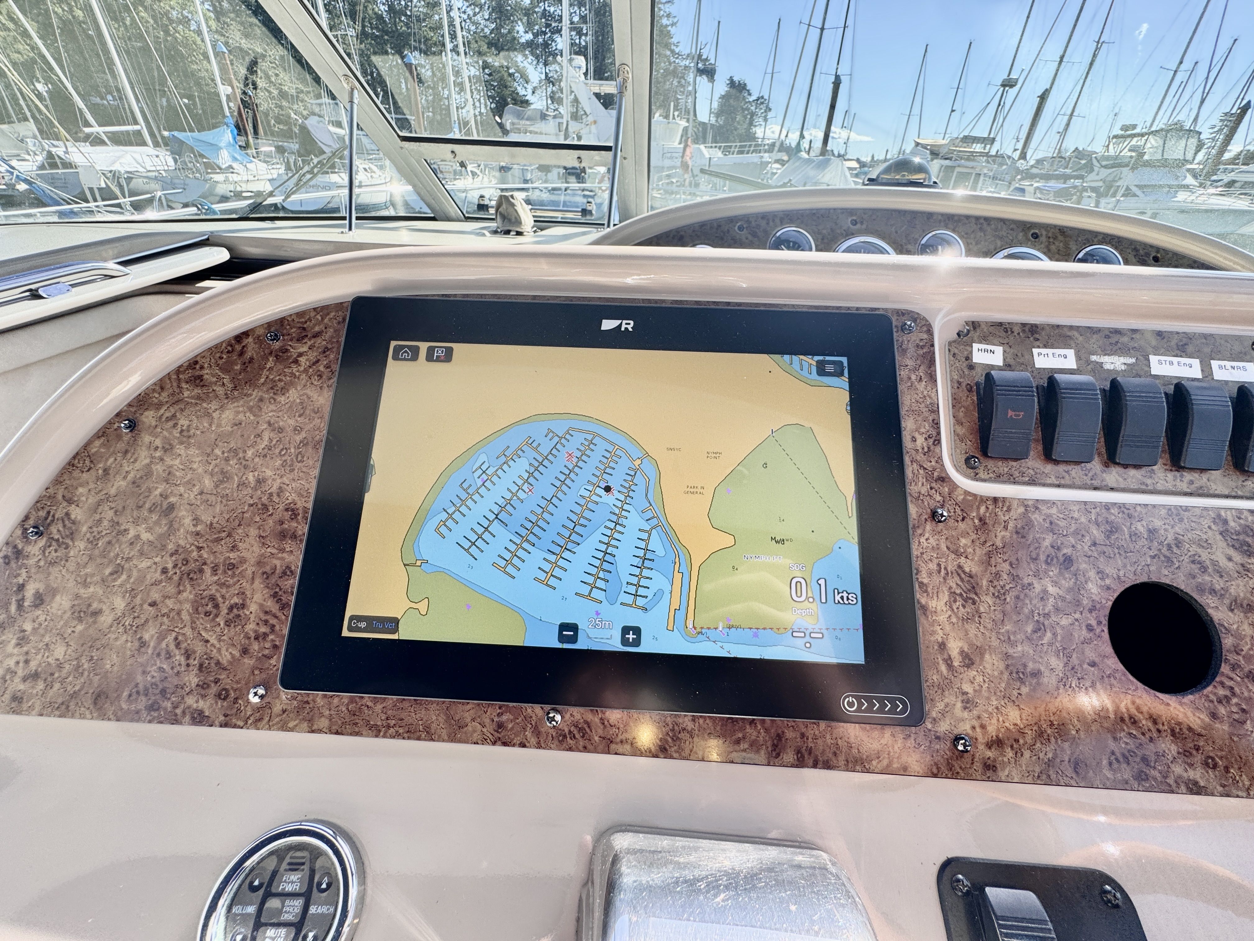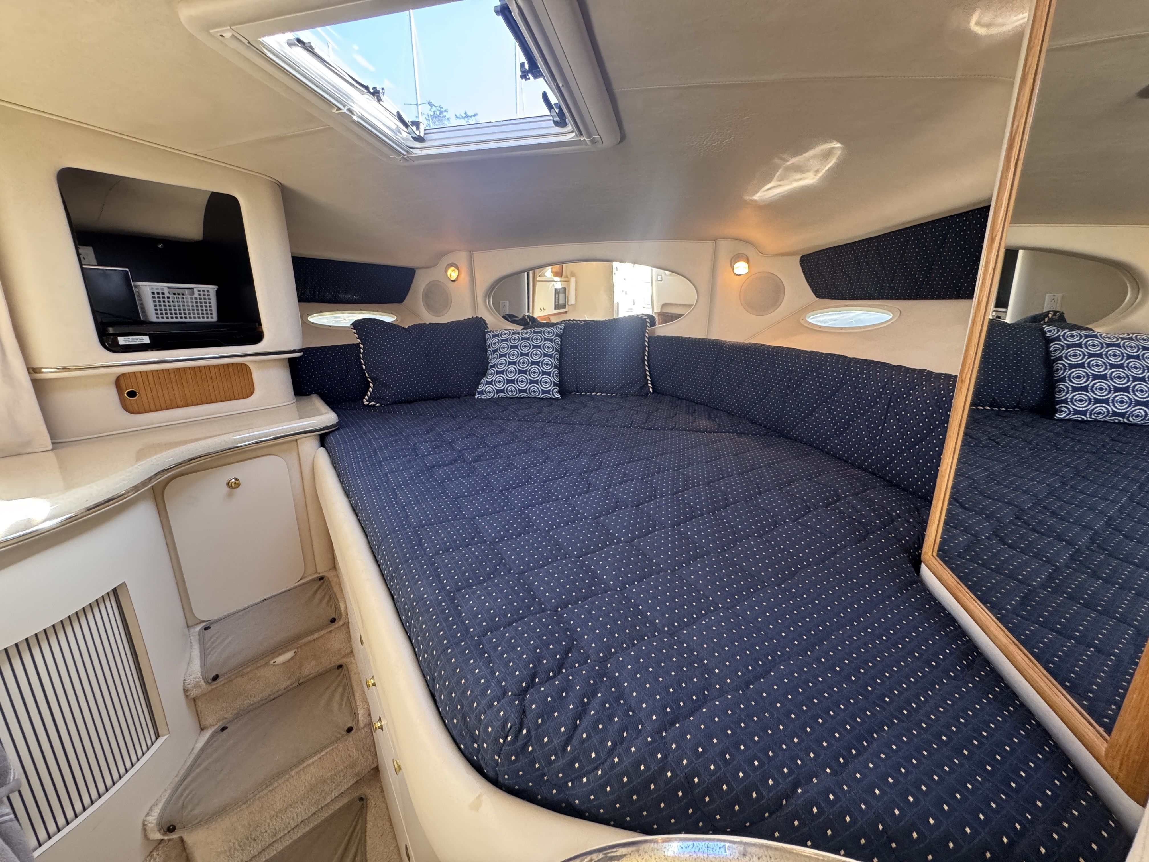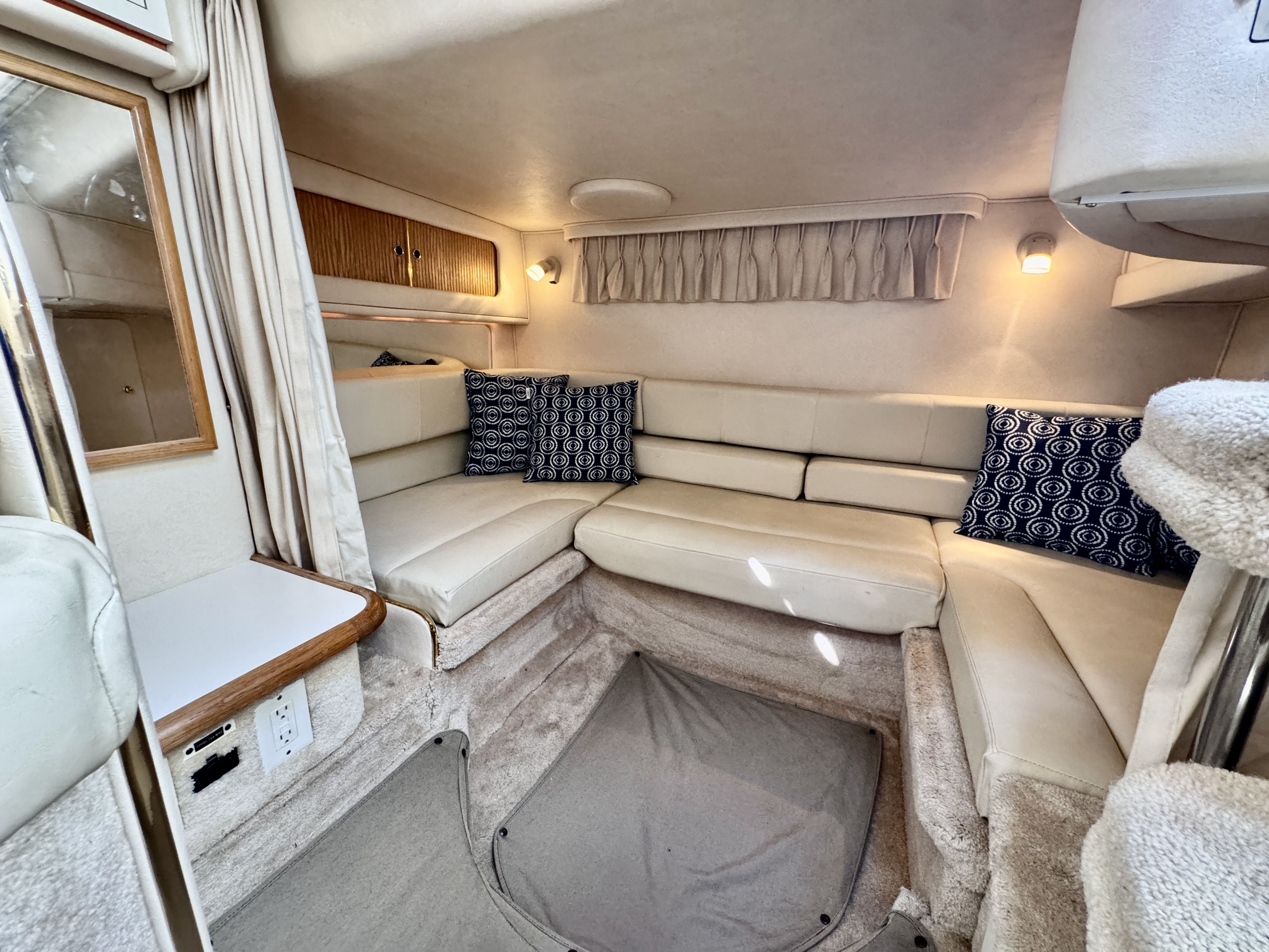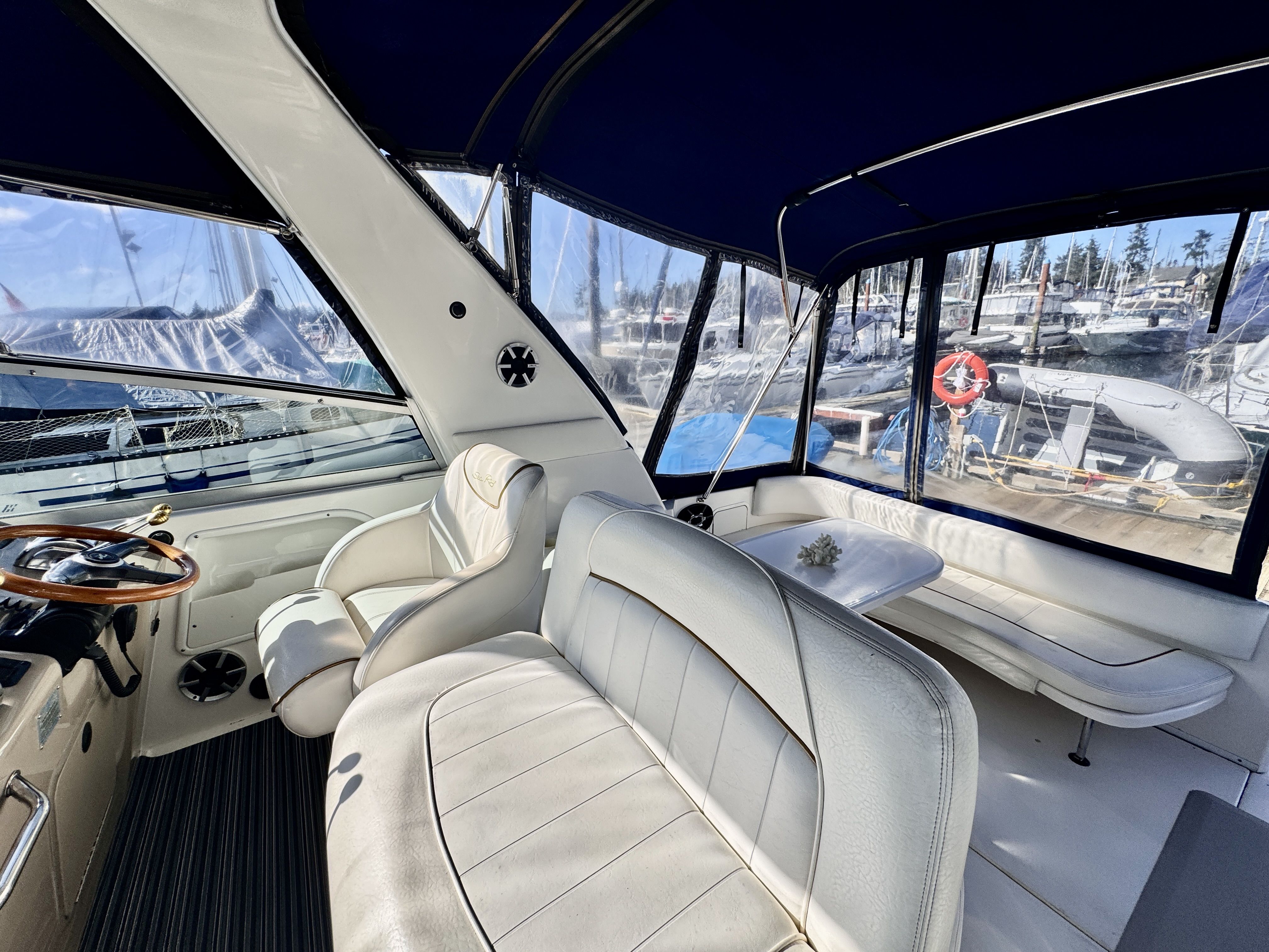 The twin MerCruiser 5.7L engines were professionally rebuilt in 2023 and have logged only 20 hours since. Freshwater cooling keeps those powerplants running at optimal temperature and adds long term reliability. A Raymarine multifunction display and radar were installed in 2022, giving you a current, capable helm.