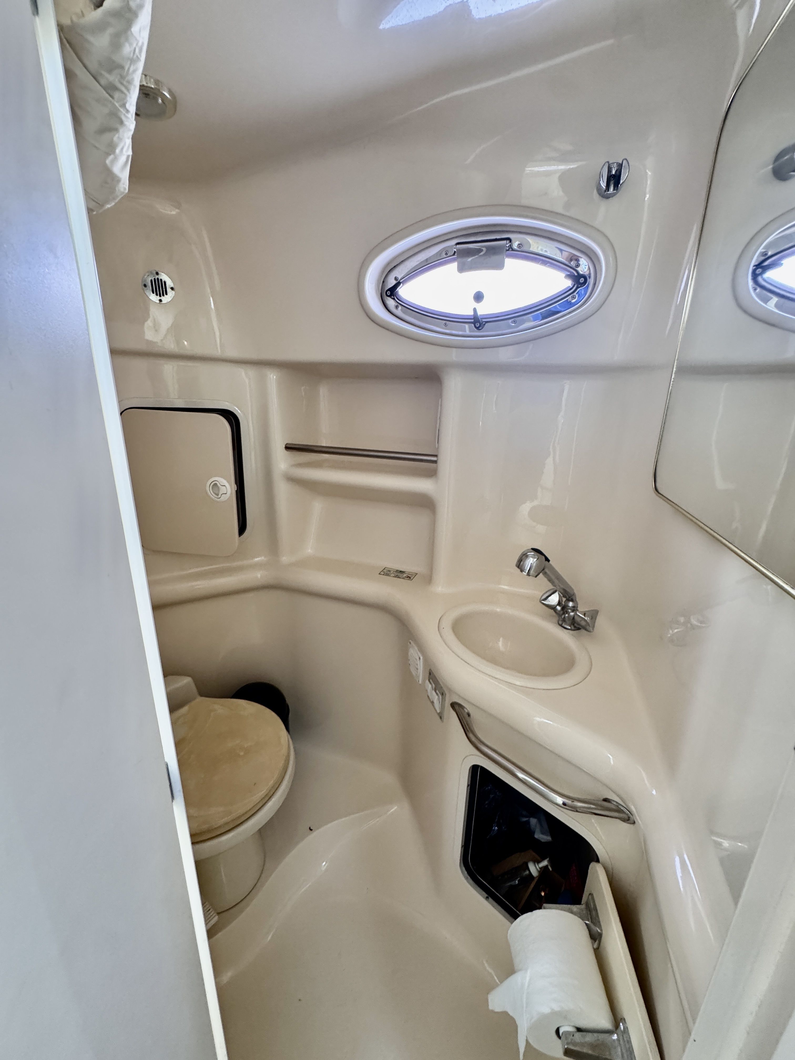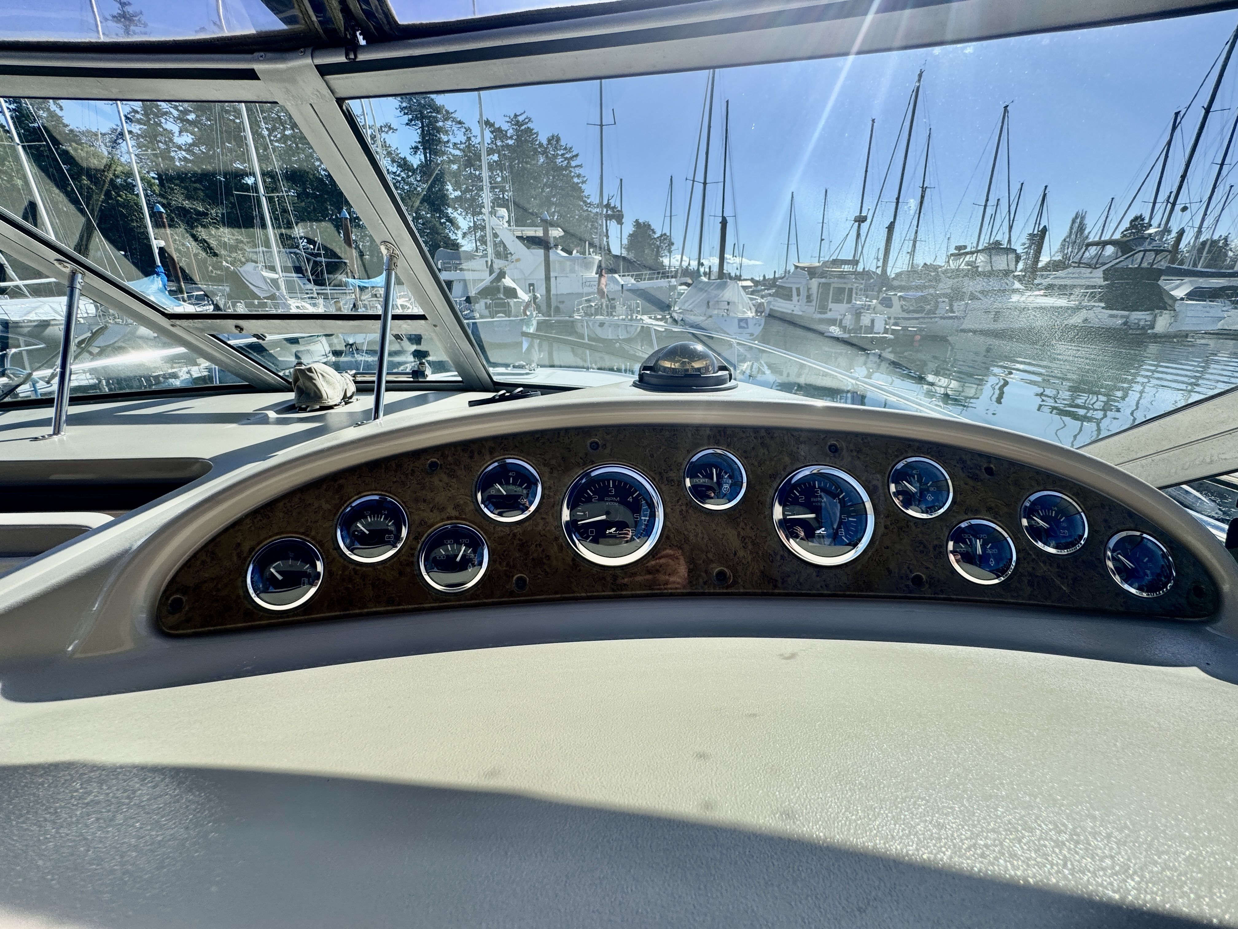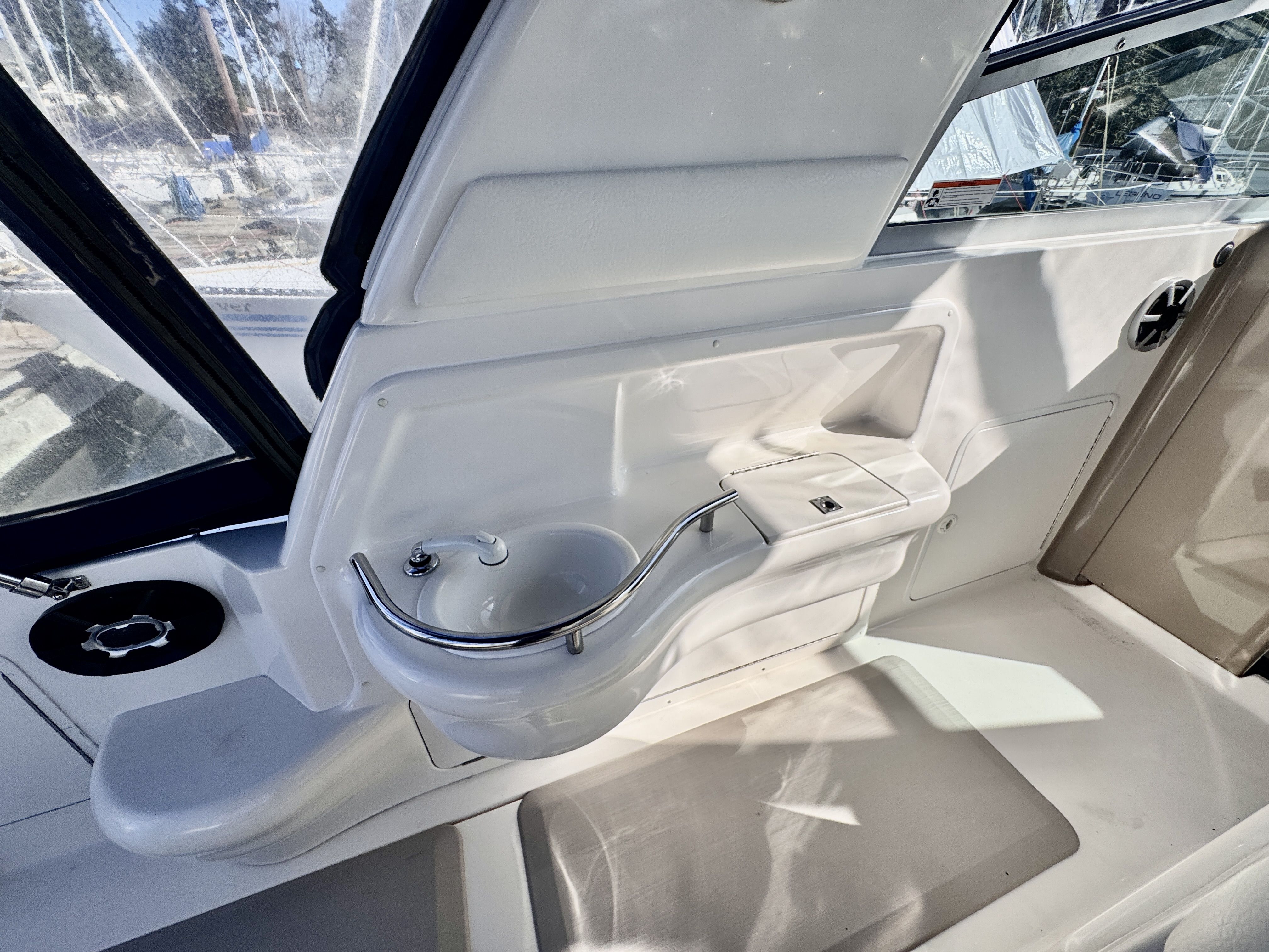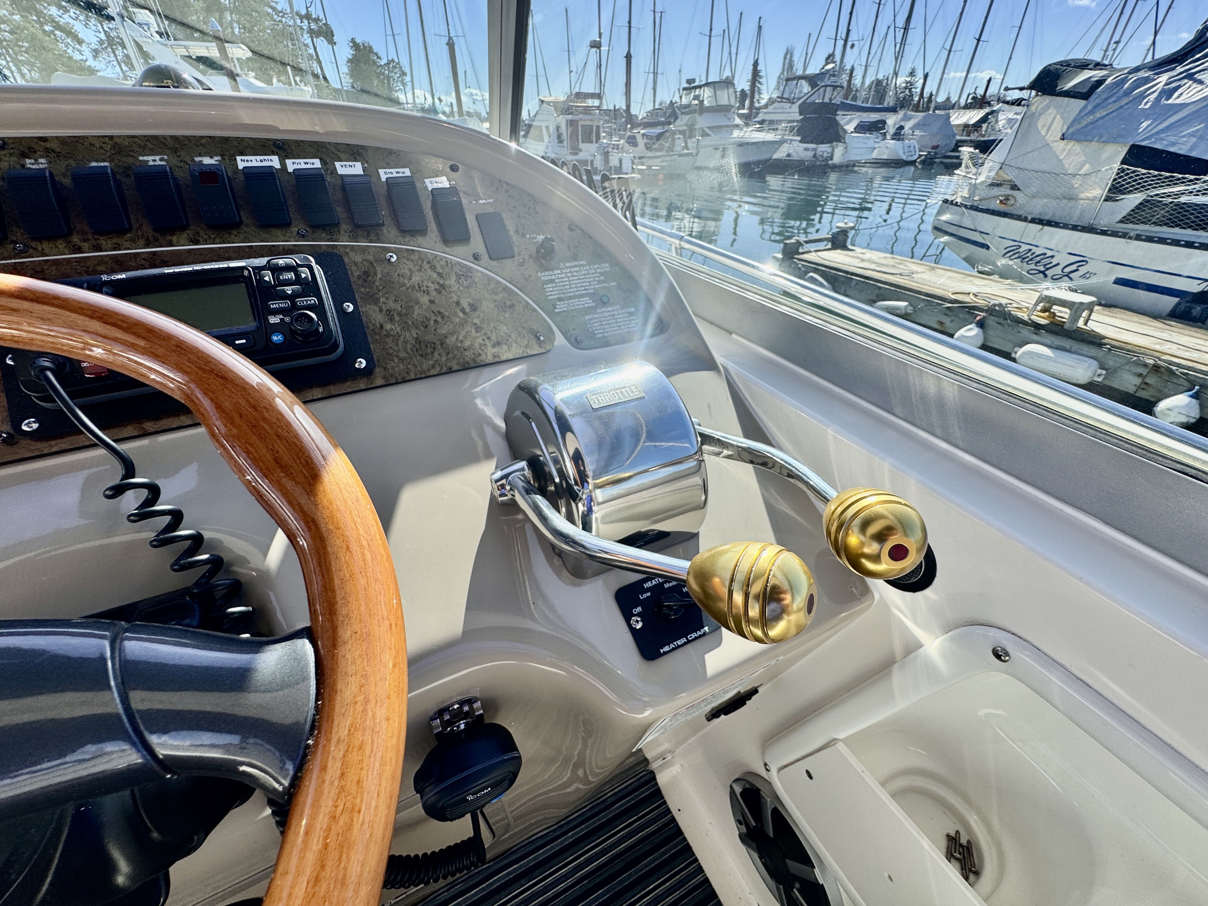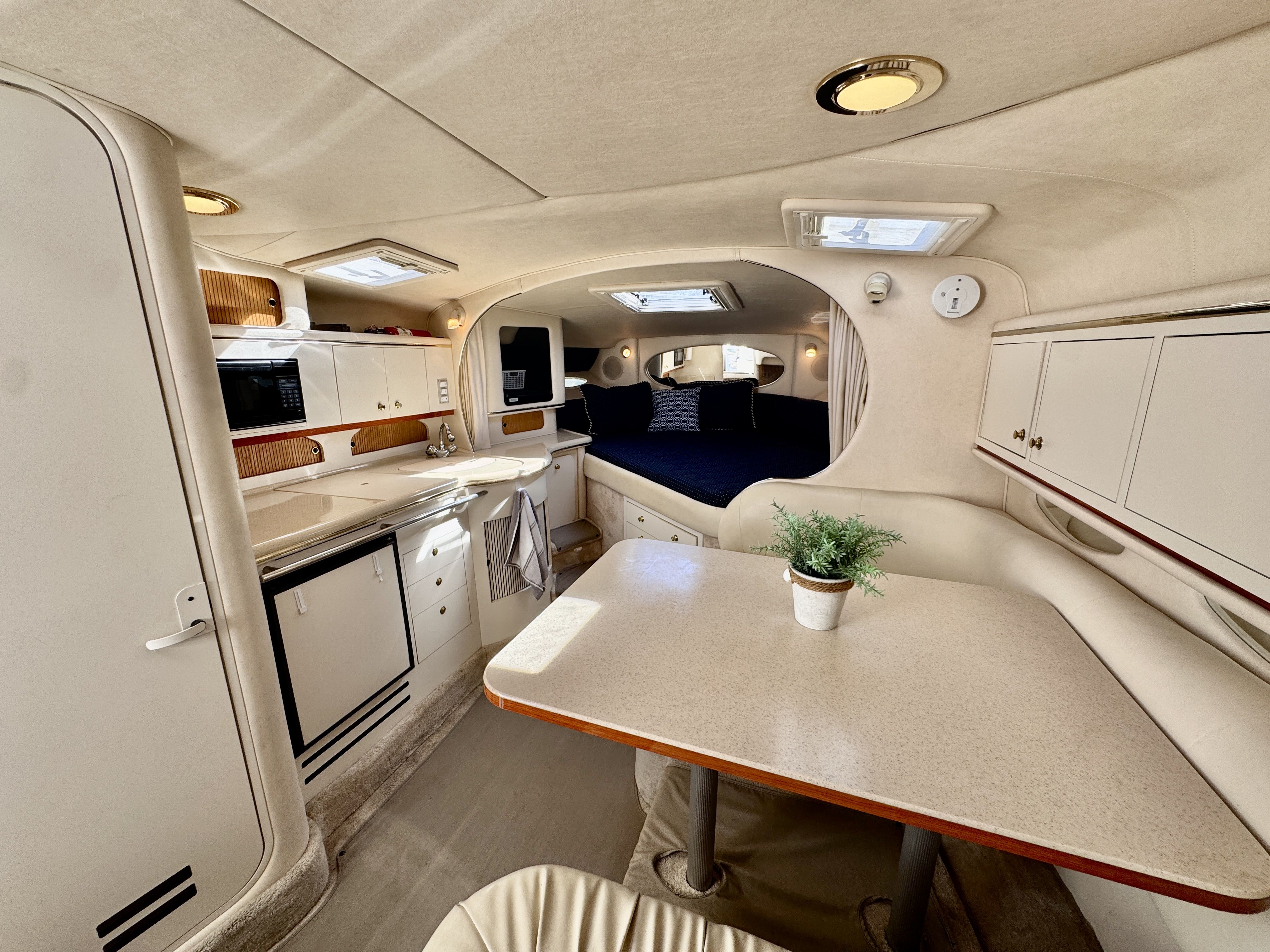 The twin MerCruiser 5.7L engines were professionally rebuilt in 2023 and have logged only 20 hours since. Freshwater cooling keeps those powerplants running at optimal temperature and adds long term reliability. A Raymarine multifunction display and radar were installed in 2022, giving you a current, capable helm.