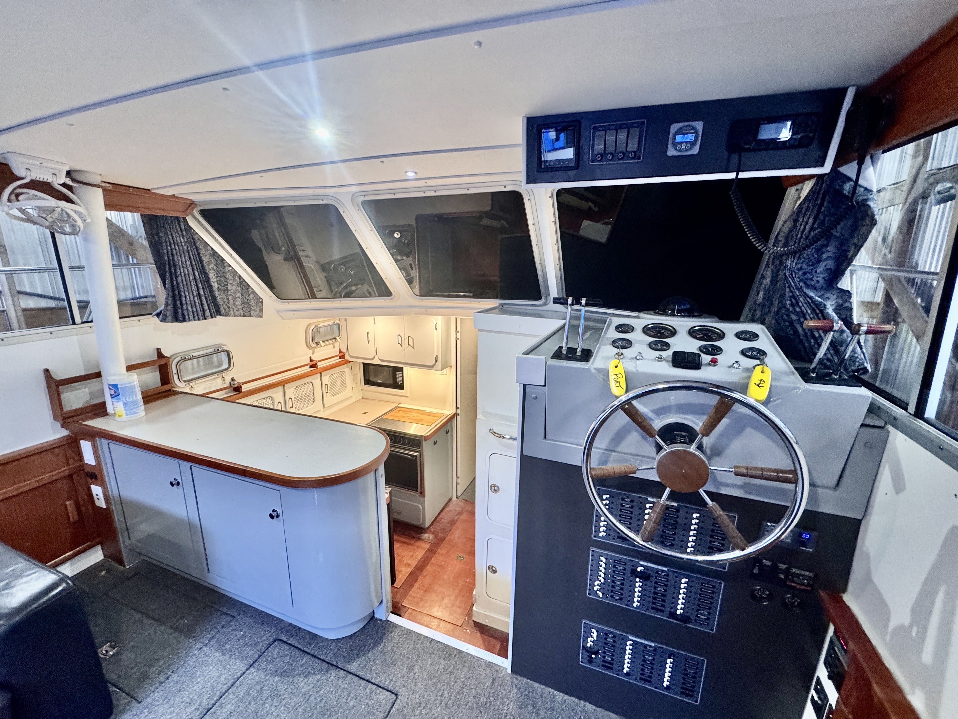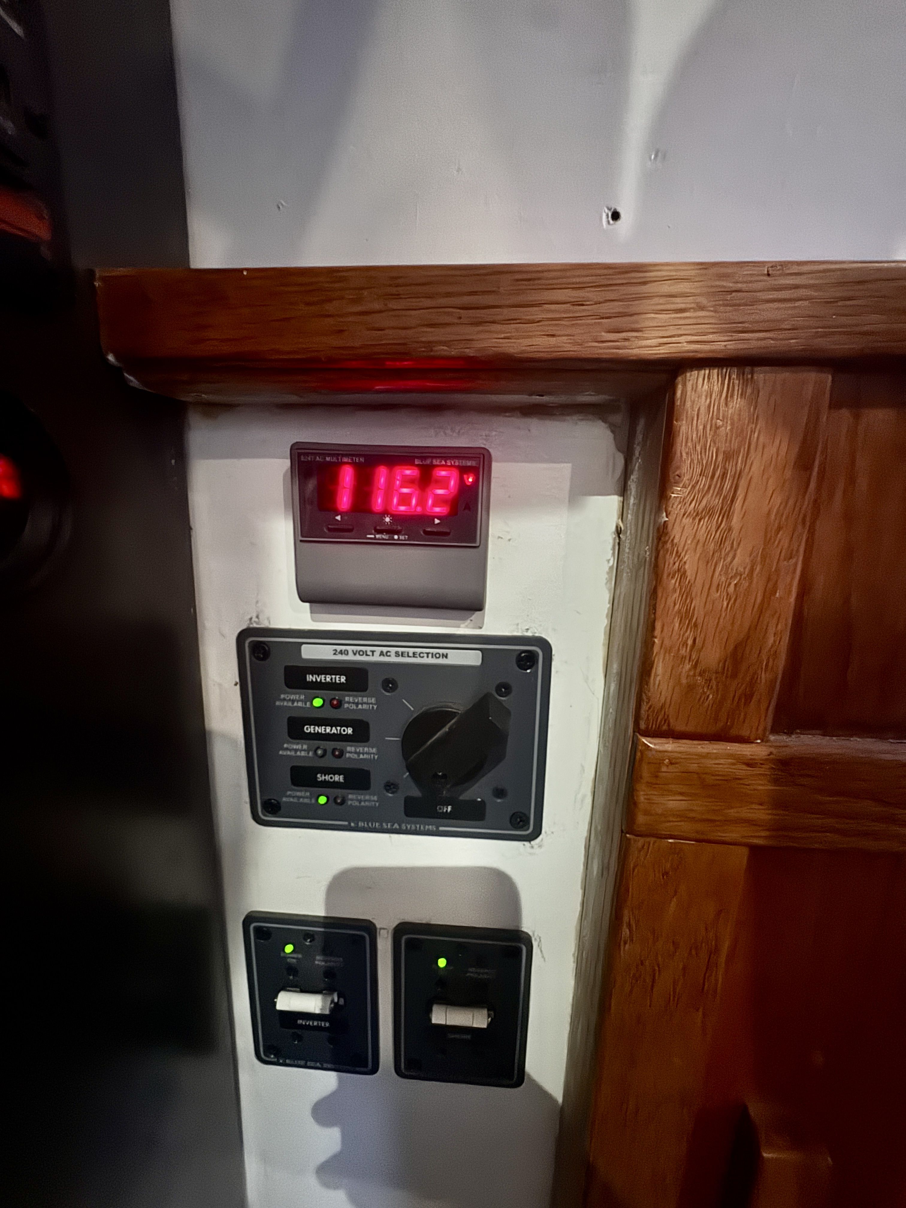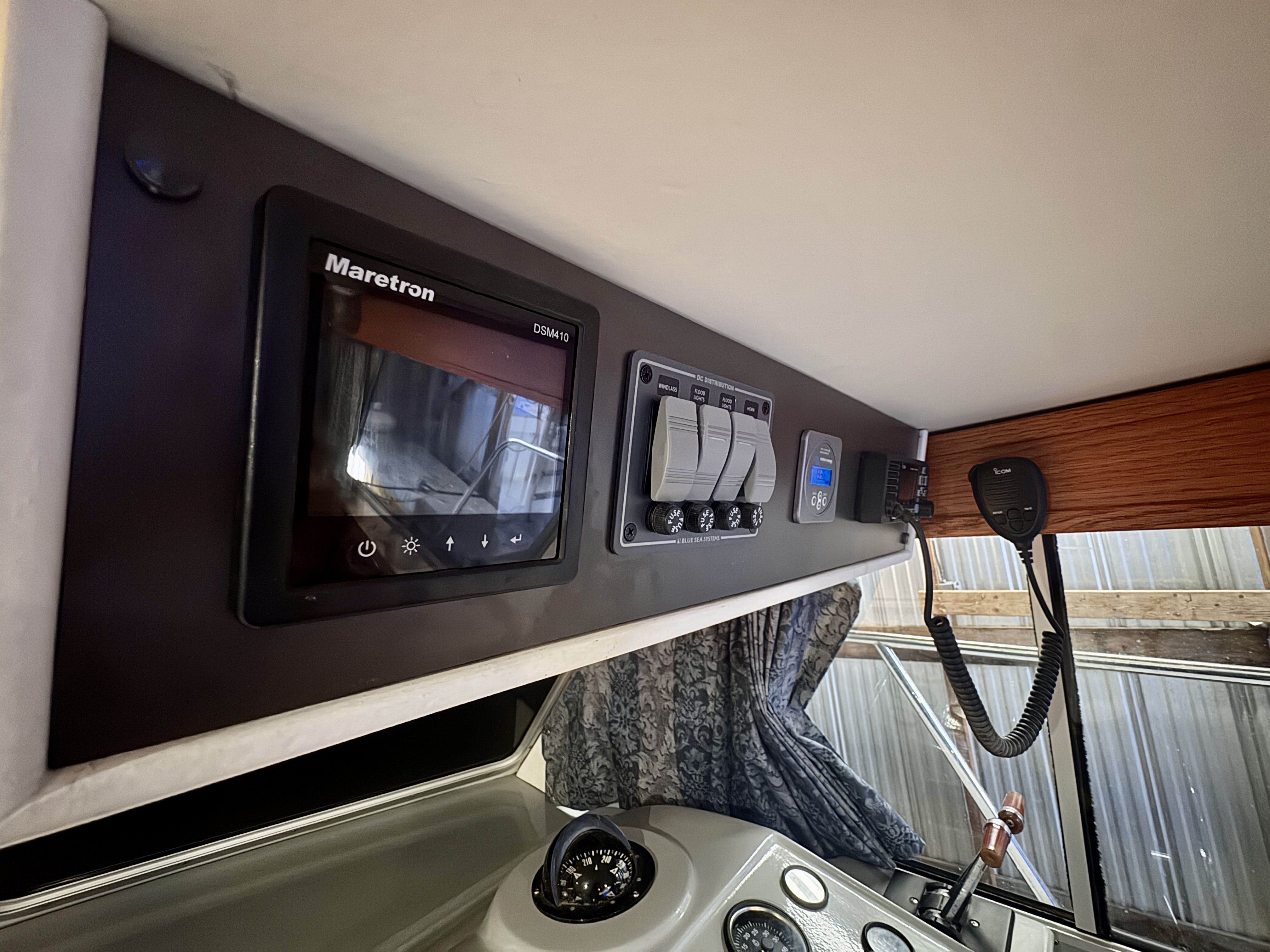 The electrical system has been rebuilt from the ground up with Victron components throughout, which is a meaningful departure from the jury-rigged 12V systems you typically find in a boat this vintage. Full Electronic Package completed with Maretron DSM 410 controller allowing any a full diagnostic outlook on all aspects of the boat during cruise.