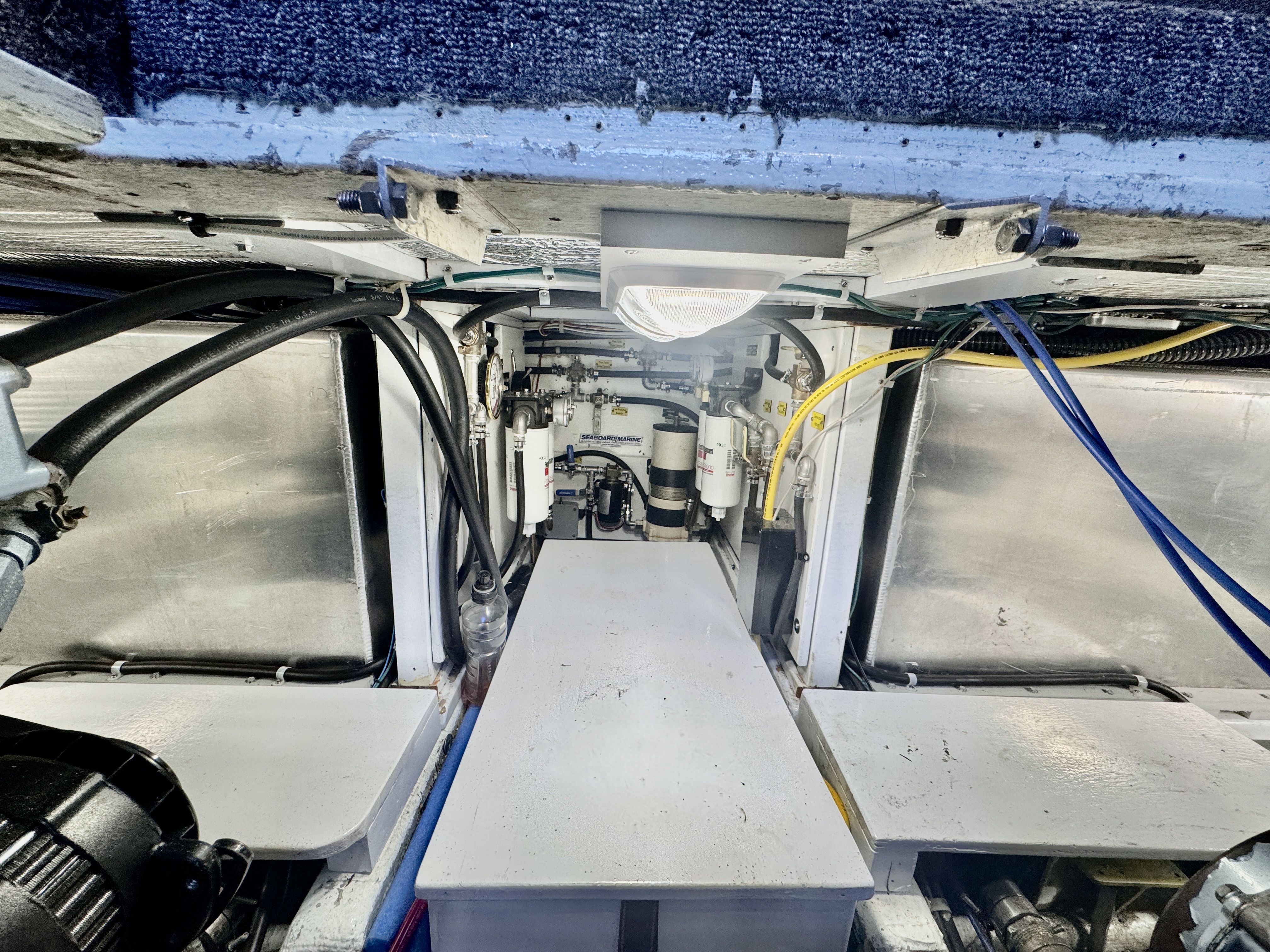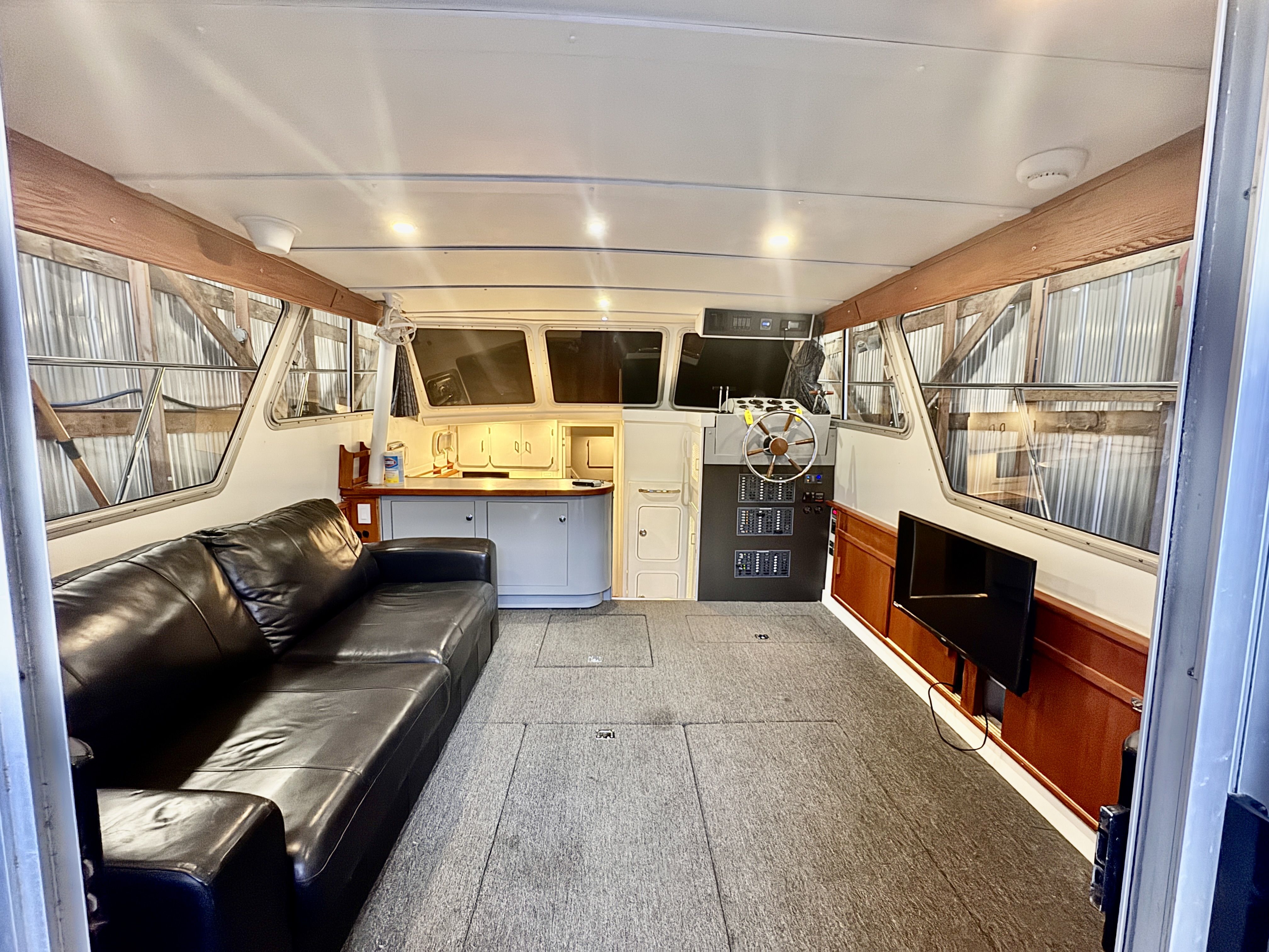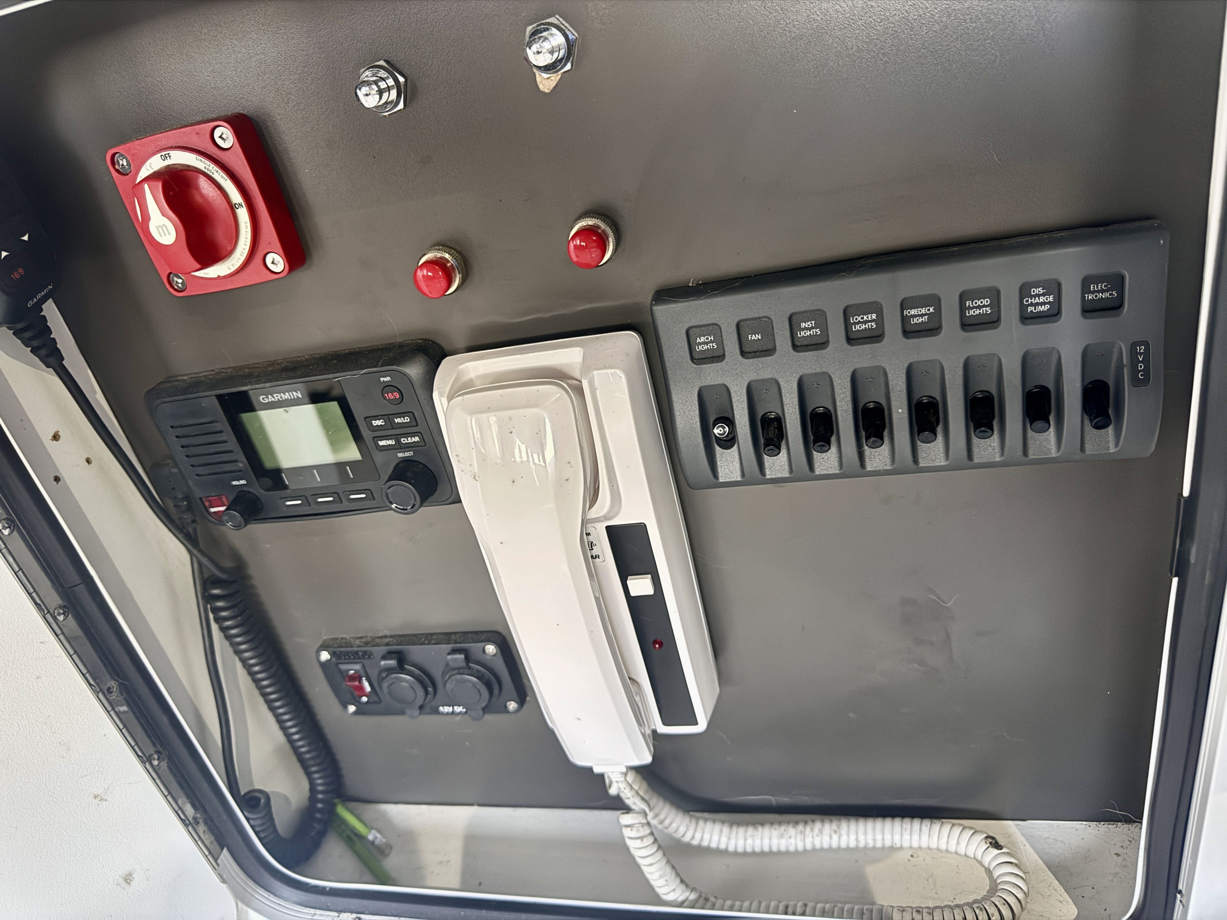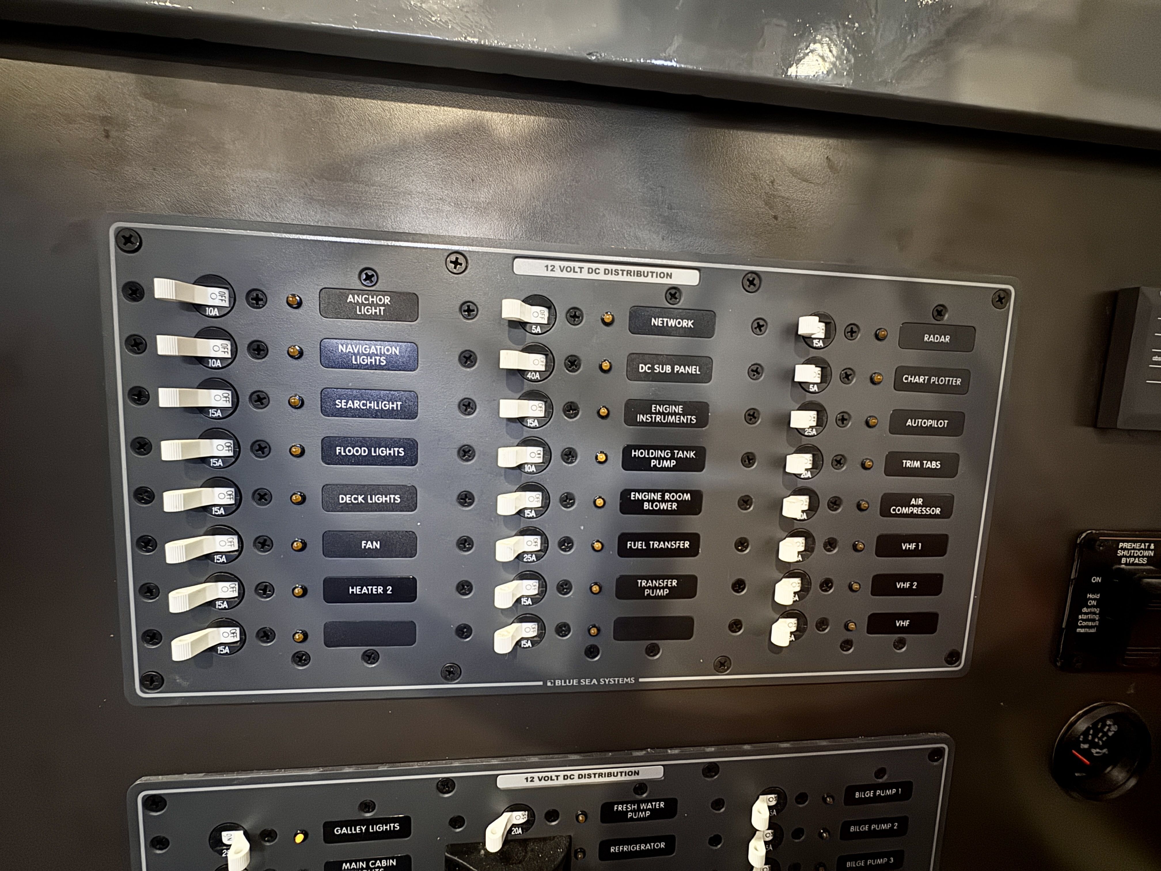 The electrical system has been rebuilt from the ground up with Victron components throughout, which is a meaningful departure from the jury-rigged 12V systems you typically find in a boat this vintage. Full Electronic Package completed with Maretron DSM 410 controller allowing any a full diagnostic outlook on all aspects of the boat during cruise.