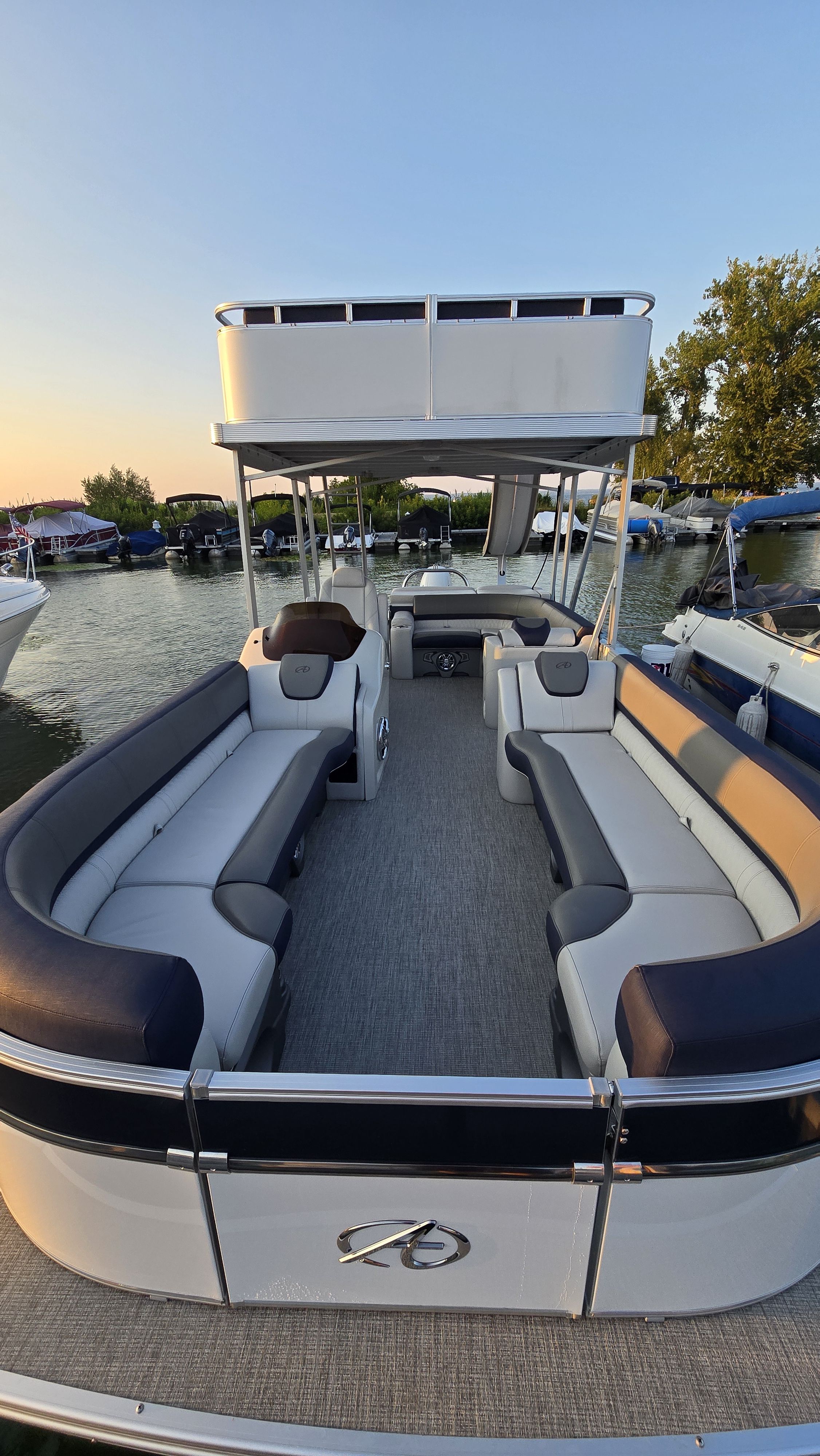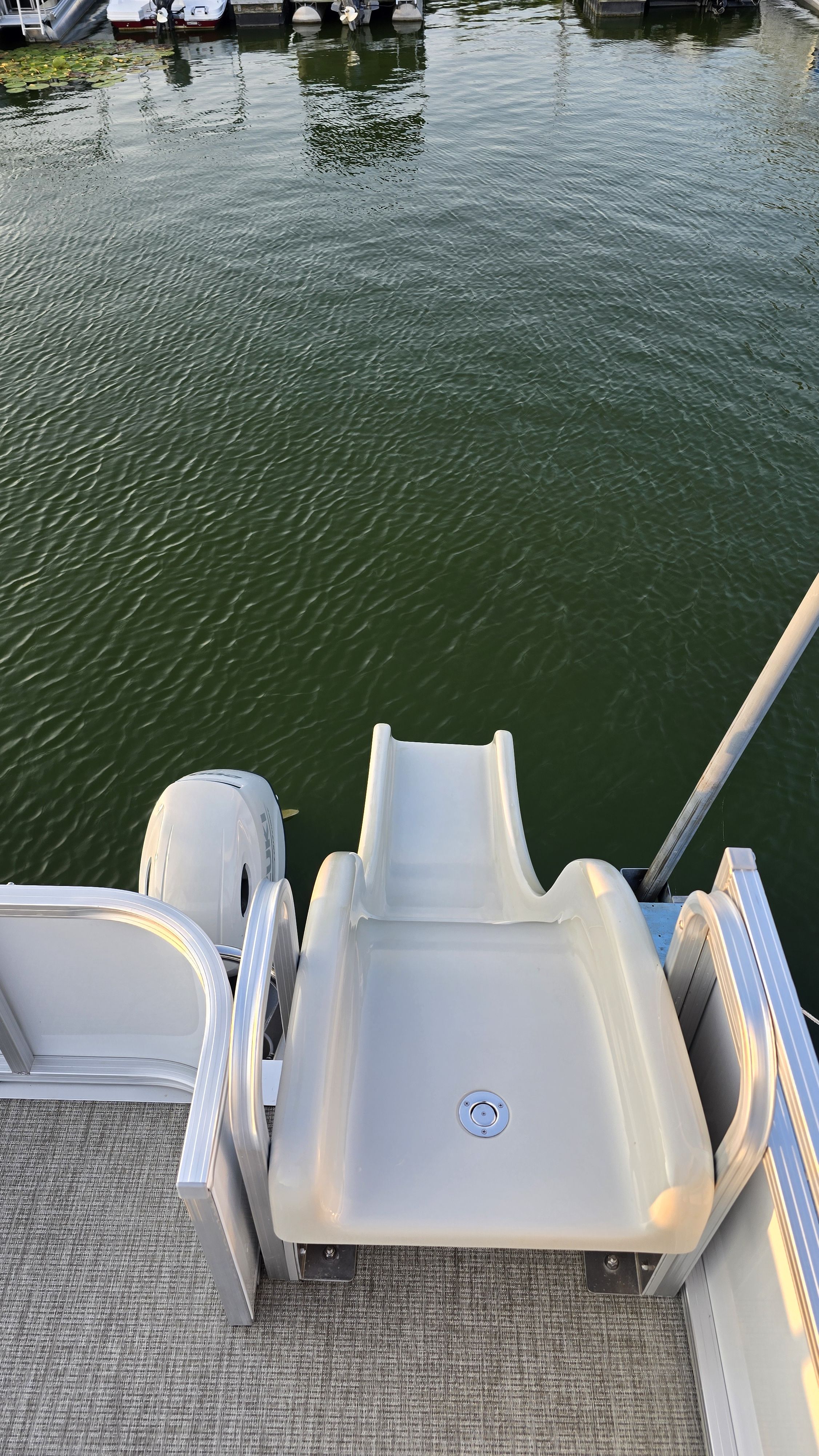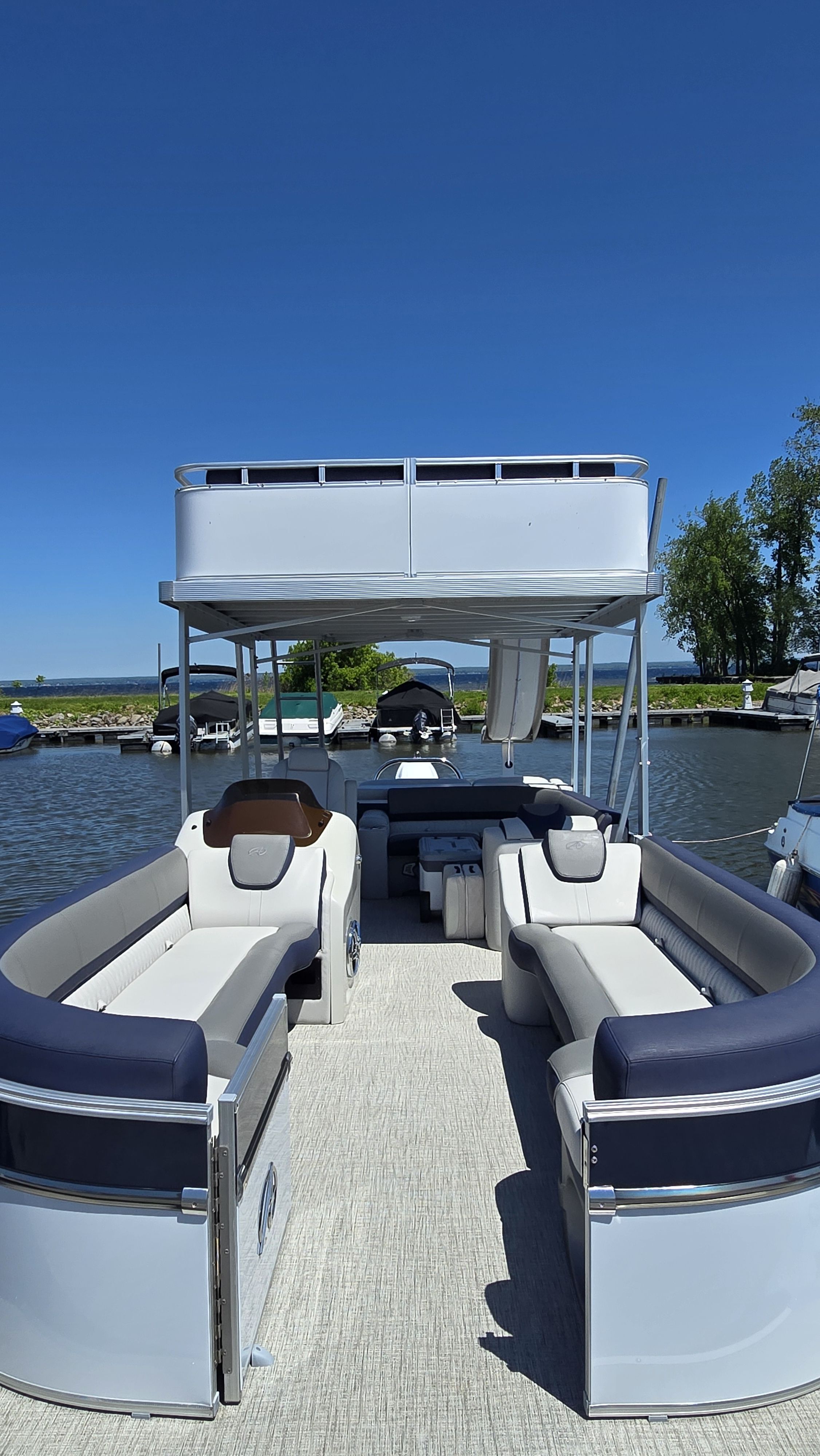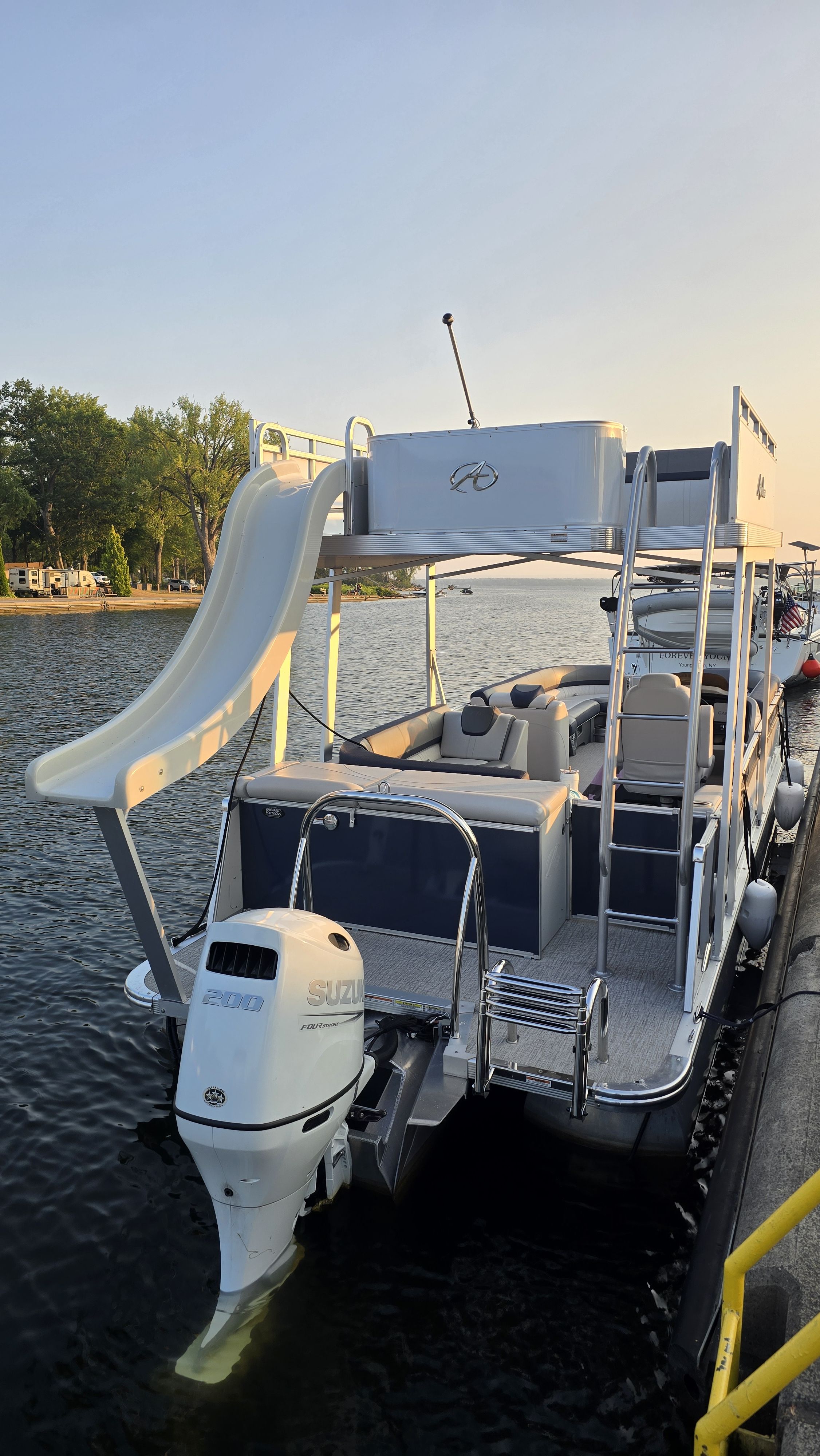 This particular double decker funship is practically brand new, loaded up from the factory, and is ready to be enjoyed all summer long! She is a one owner, fresh water vessel with only 25 hours on the 200hp Suzuki. Easily maneuverable thanks to the electric power assist steering, the 27" center tube system and the 6 high-performance lifting fins/strakes. Along with maneuverability, find your way safely with the built in Garmin 73CV chartplotter/GPS. Once you've arrived to your destination, crank up the high performance Fusion sound package, complete with speakers, amp and subwoofer, turn on your custom LED lighting throughout the entire boat, and enjoy the waterslide, top deck sun bathing/lounge pad, and all the space that this boat has to offer for entertaining! Fully equipped with upgraded interior, full coverage bimini, privacy station with curtain, and washdown system. She even comes with a mint condition Genesis tri-axle trailer, 2 anchors, 4 fenders, dock lines, and more. Come check this beauty out today and secure your summer oasis now for endless water fun!