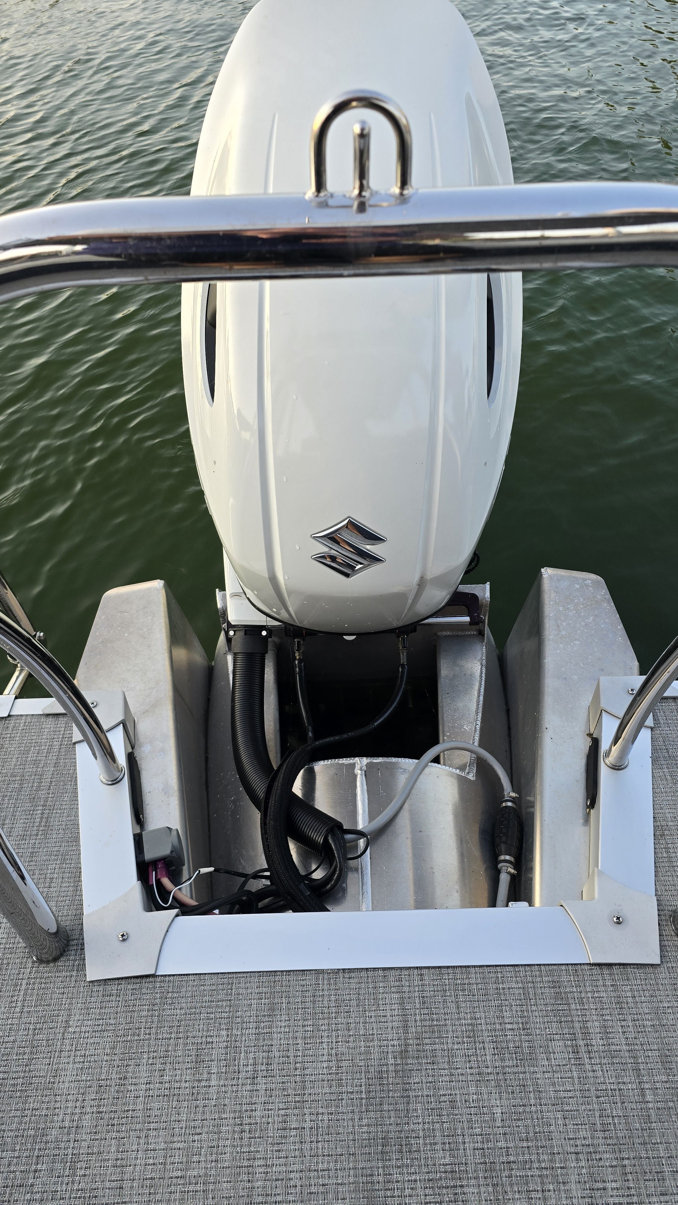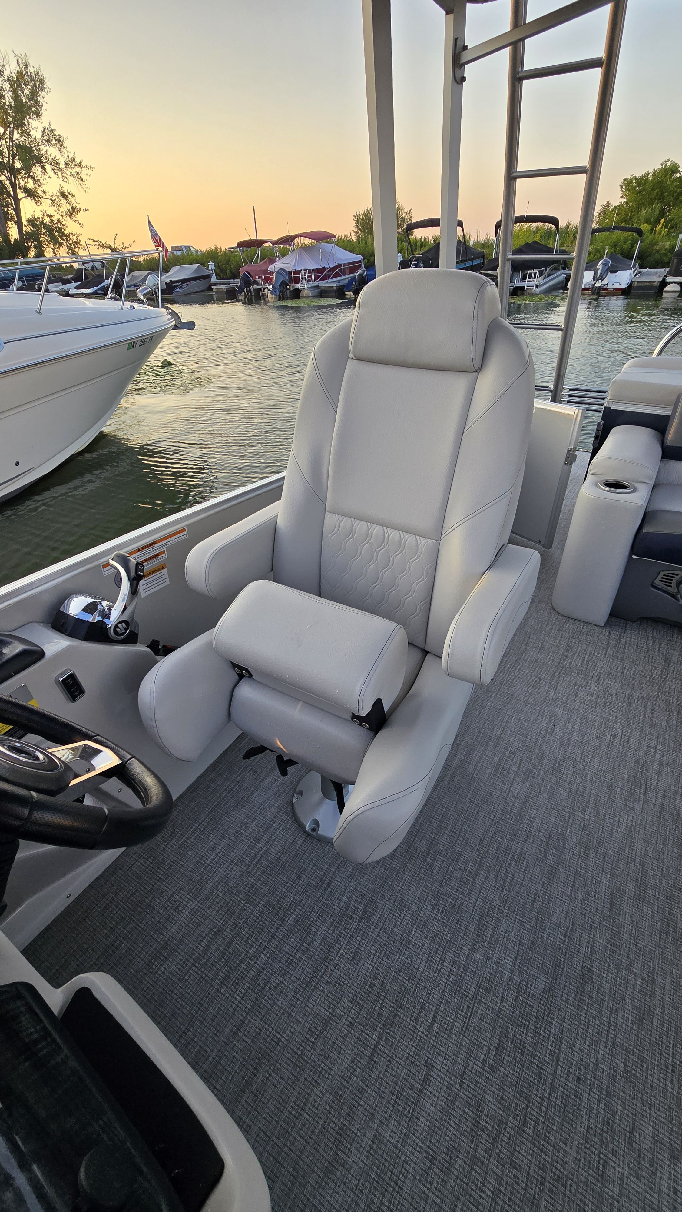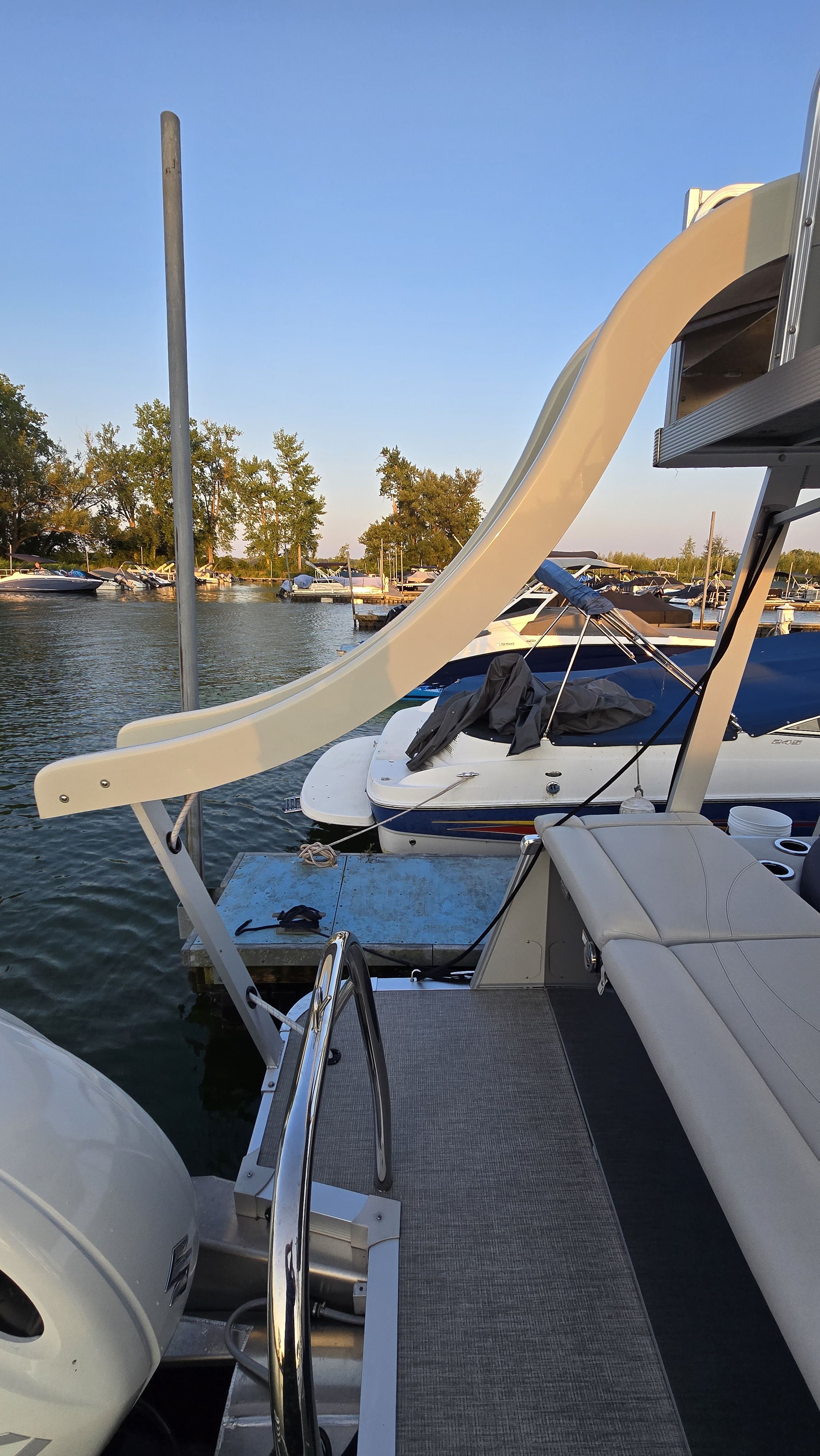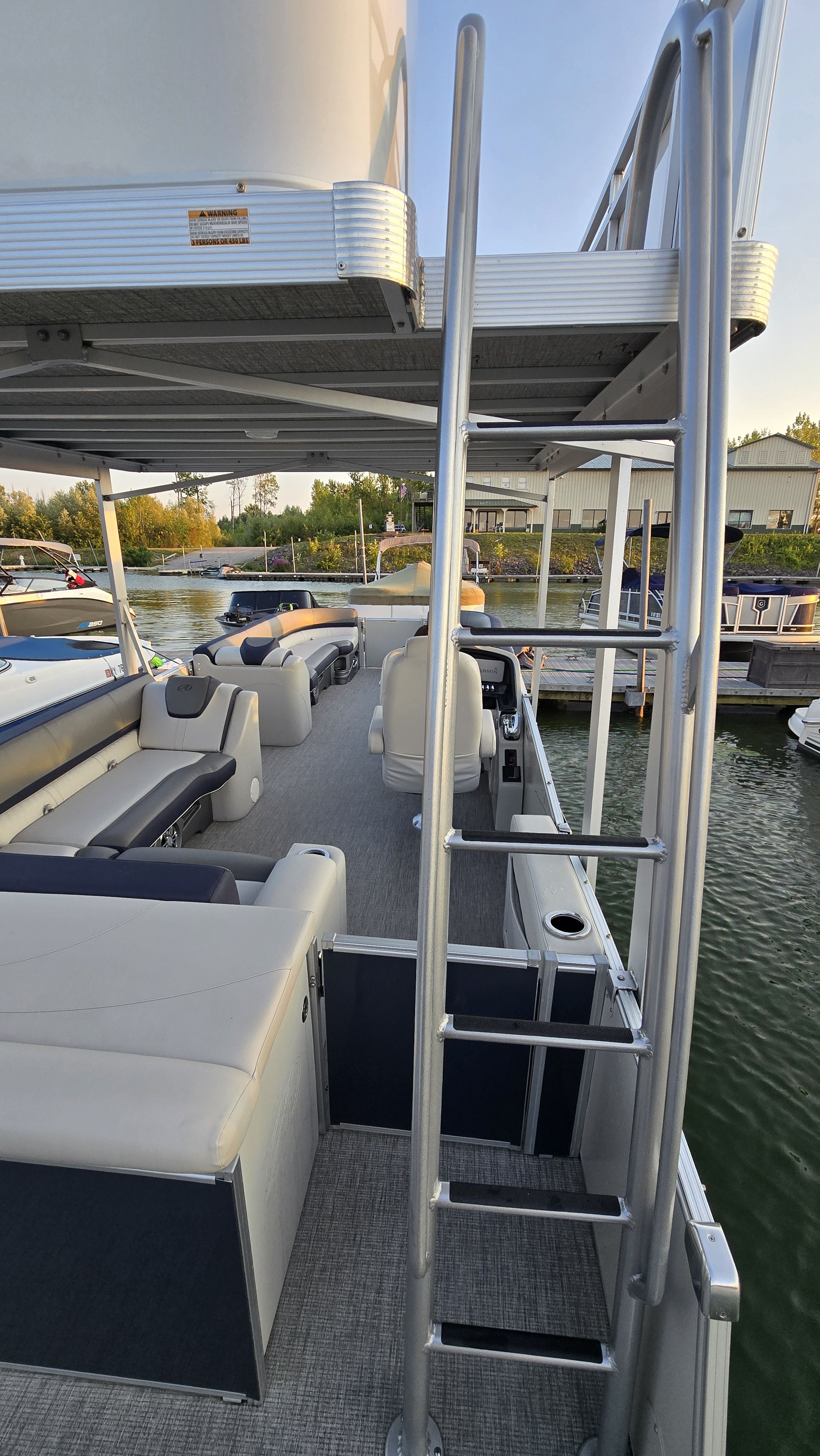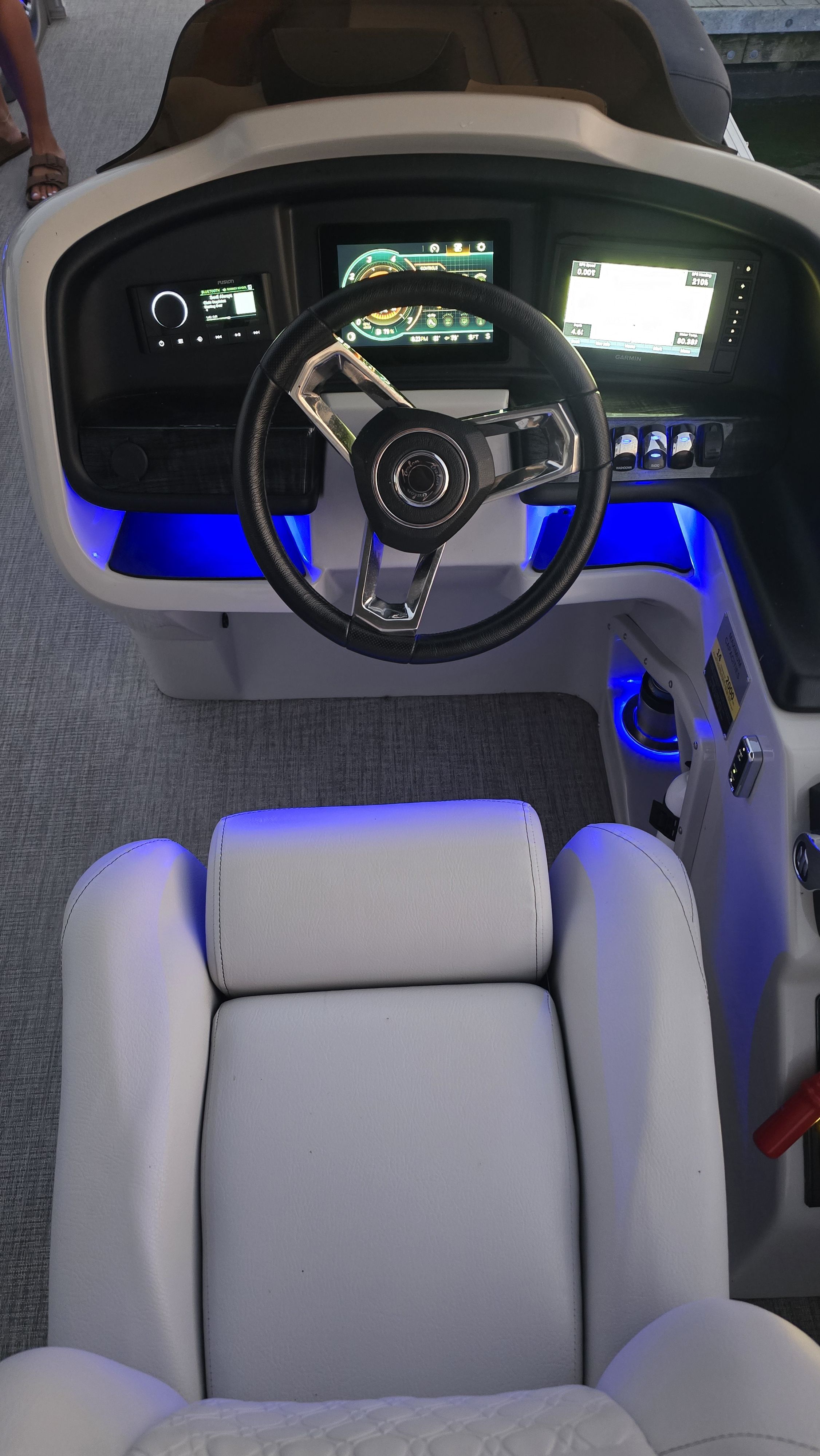 This particular double decker funship is practically brand new, loaded up from the factory, and is ready to be enjoyed all summer long! She is a one owner, fresh water vessel with only 25 hours on the 200hp Suzuki. Easily maneuverable thanks to the electric power assist steering, the 27" center tube system and the 6 high-performance lifting fins/strakes. Along with maneuverability, find your way safely with the built in Garmin 73CV chartplotter/GPS. Once you've arrived to your destination, crank up the high performance Fusion sound package, complete with speakers, amp and subwoofer, turn on your custom LED lighting throughout the entire boat, and enjoy the waterslide, top deck sun bathing/lounge pad, and all the space that this boat has to offer for entertaining! Fully equipped with upgraded interior, full coverage bimini, privacy station with curtain, and washdown system. She even comes with a mint condition Genesis tri-axle trailer, 2 anchors, 4 fenders, dock lines, and more. Come check this beauty out today and secure your summer oasis now for endless water fun!