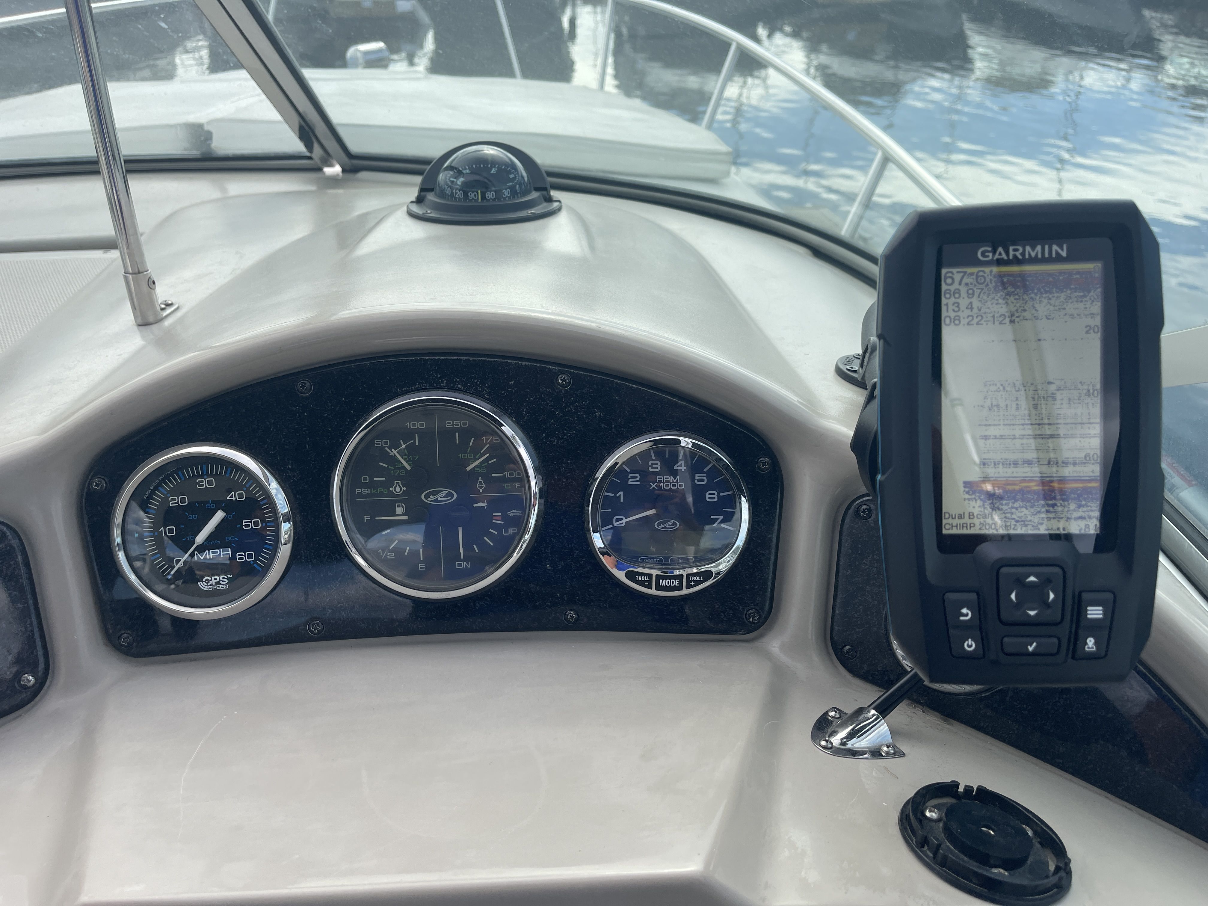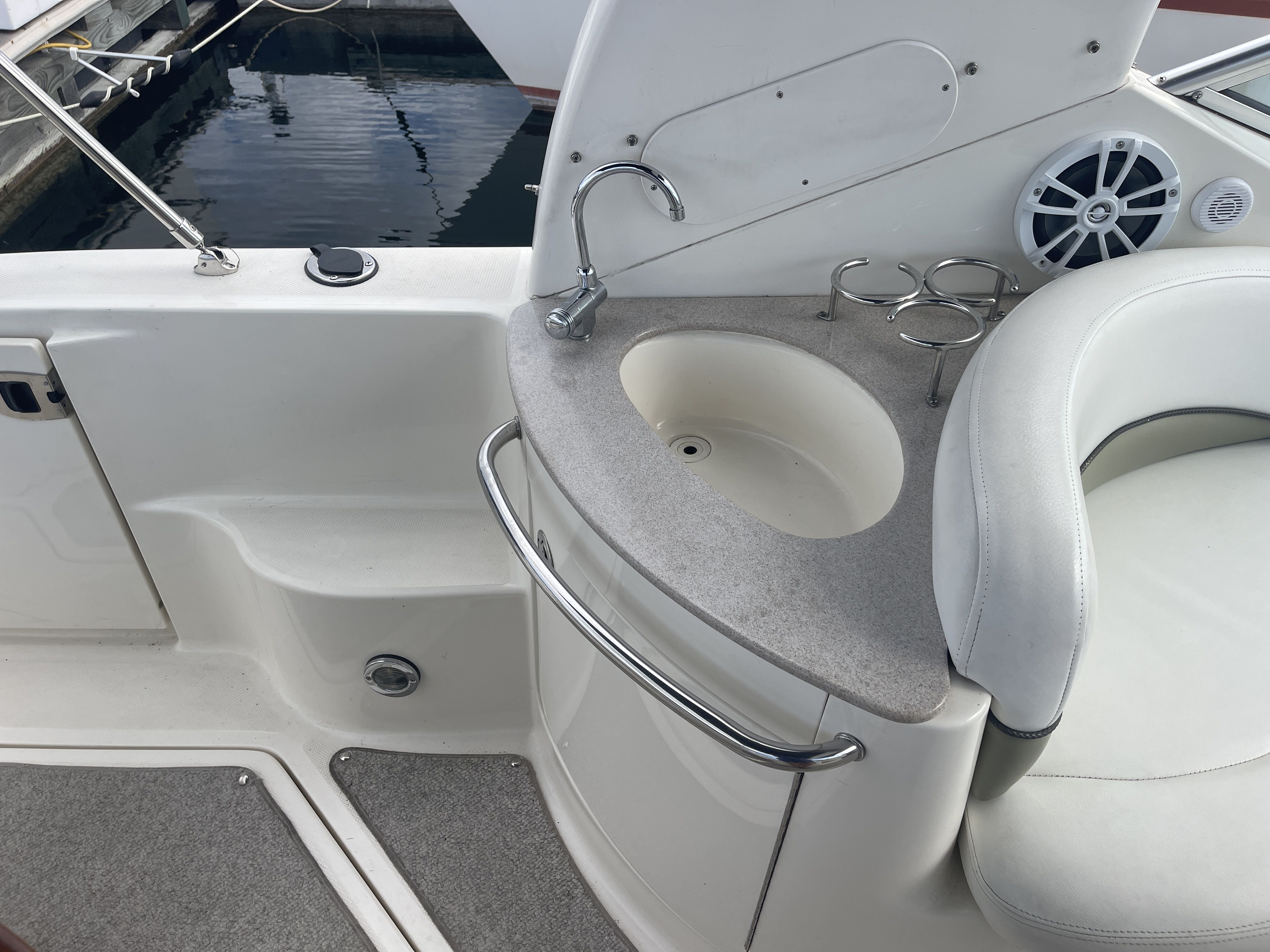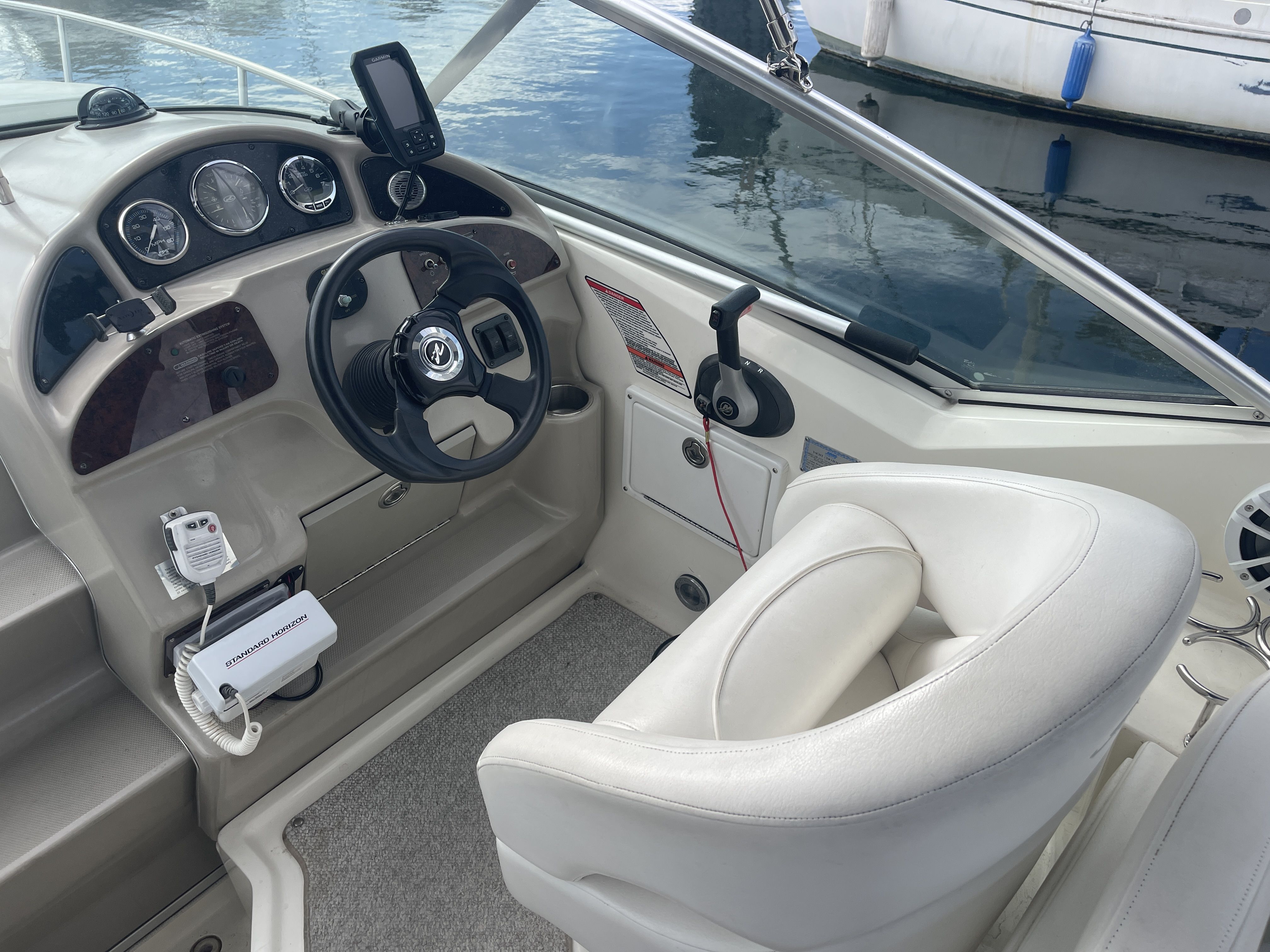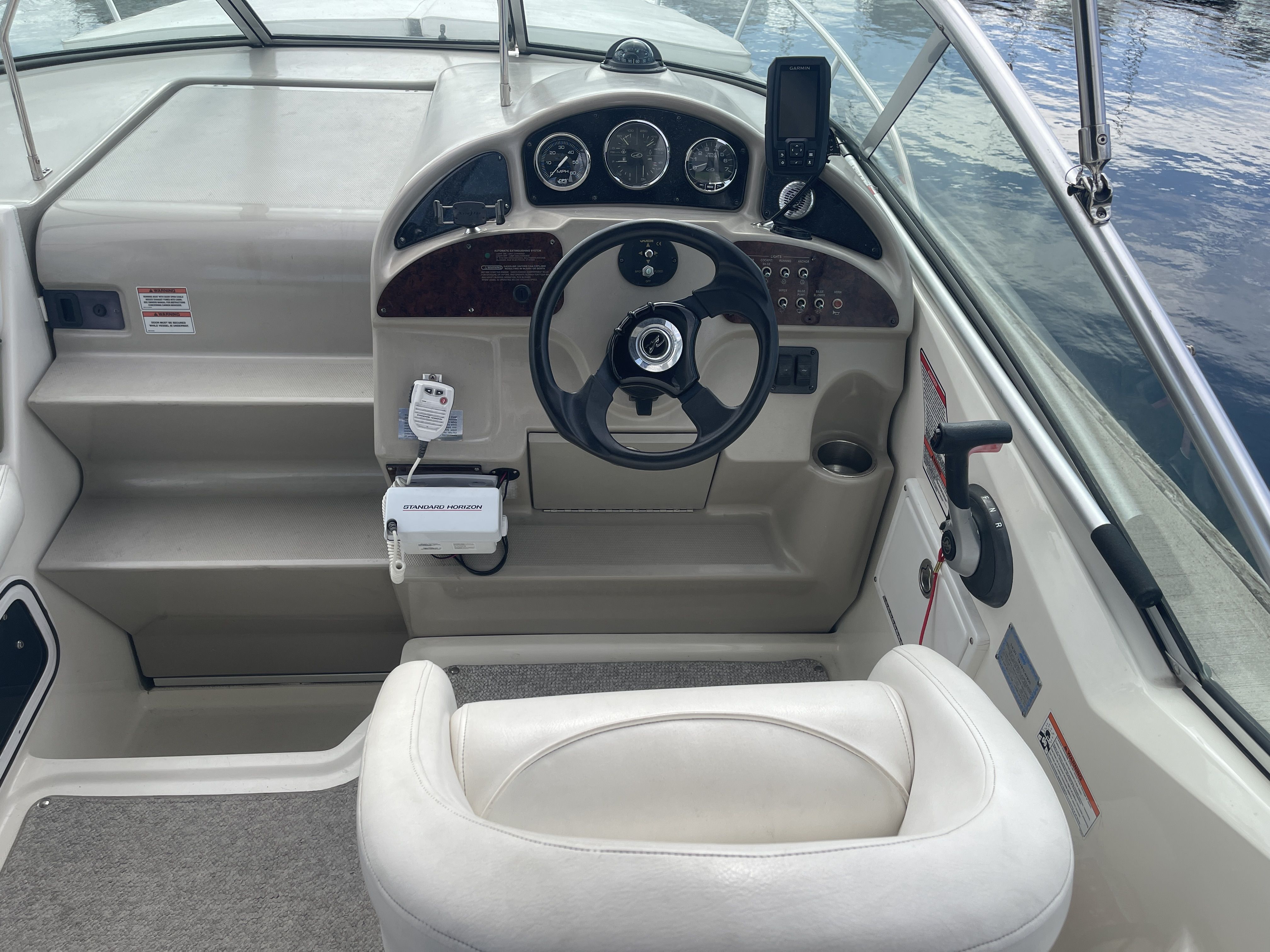 Powered with a MerCruiser 350 MAG MPI Bravo III drive with 680 Hours of run-time. The helm features Garmin GPS and fish finder(Brand new), compass, VHF, electric horn, remote spotlight, single adjustable captain bucket seat, port side companion seating, L-shaped cockpit seating with table, a port side wet bar, cockpit speakers, custom bow pad, Stainless BBQ, a gas assisted transom storage locker and an electric engine hatch.