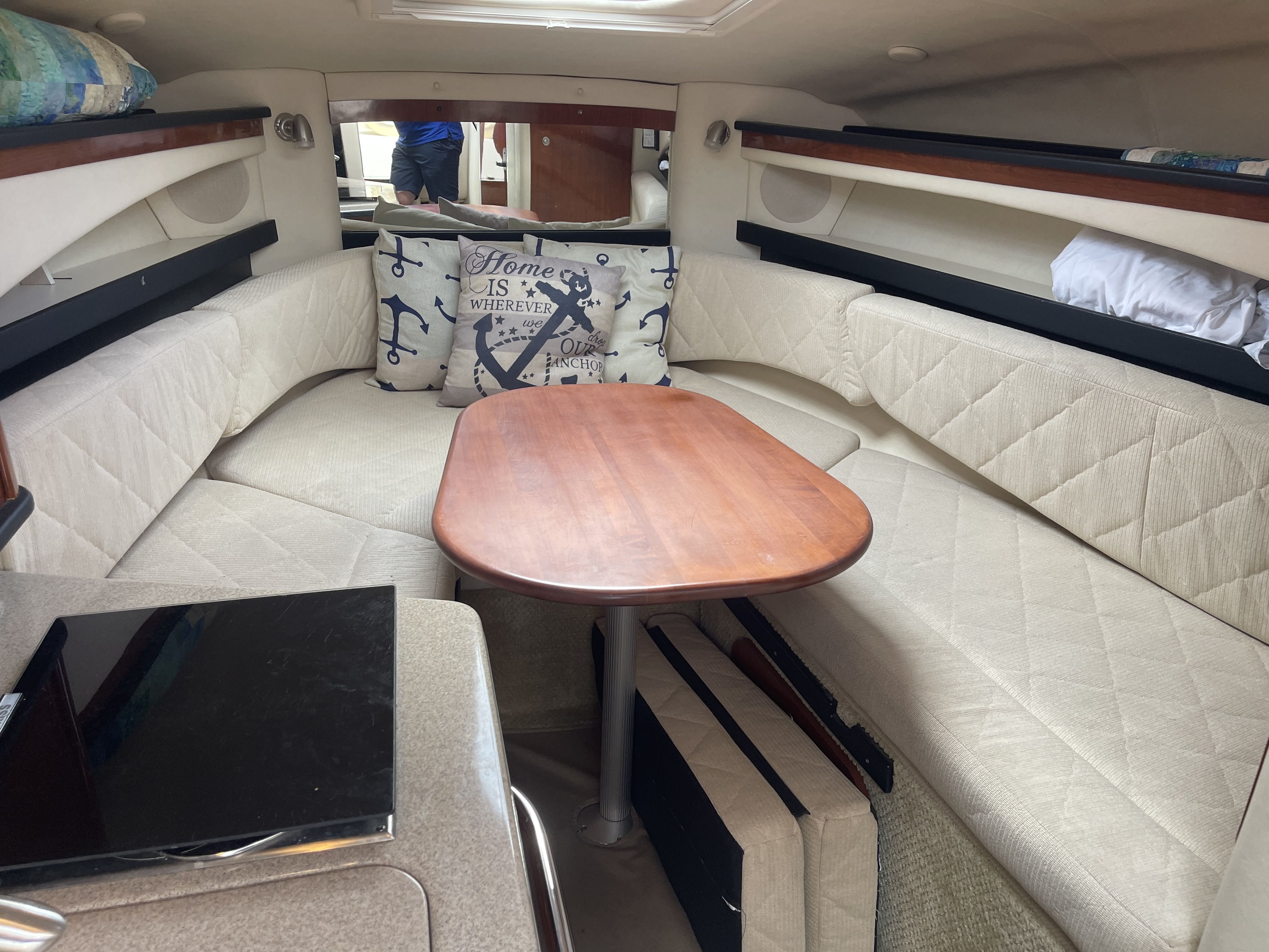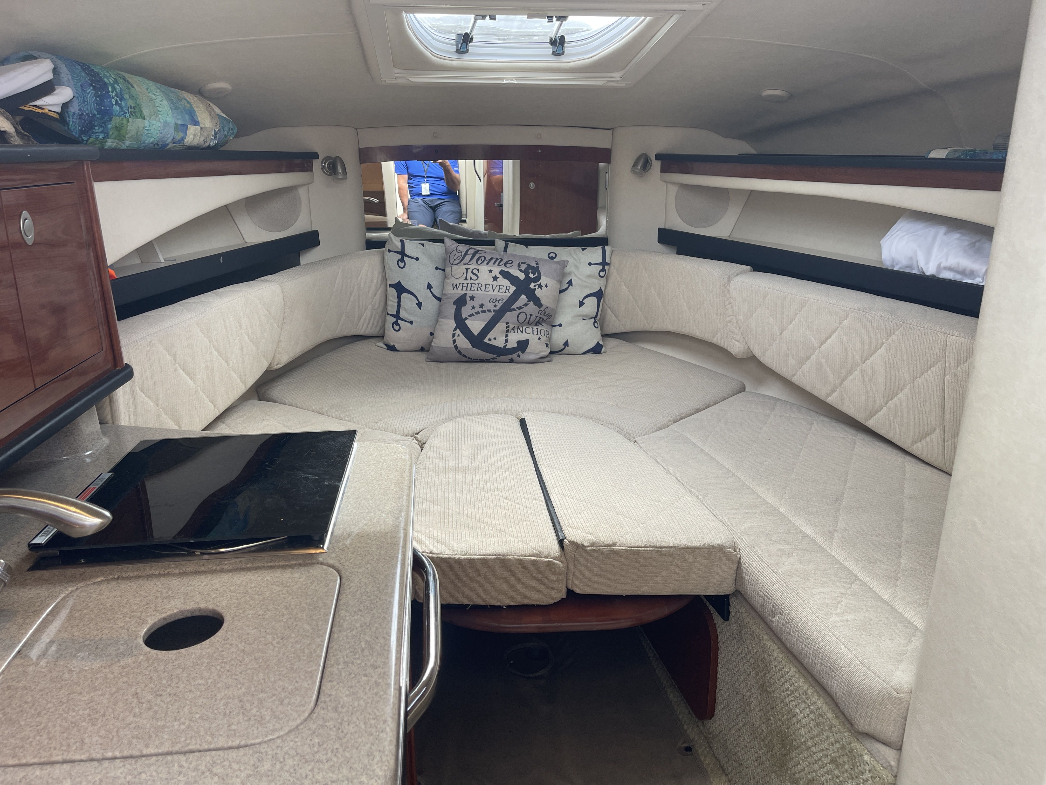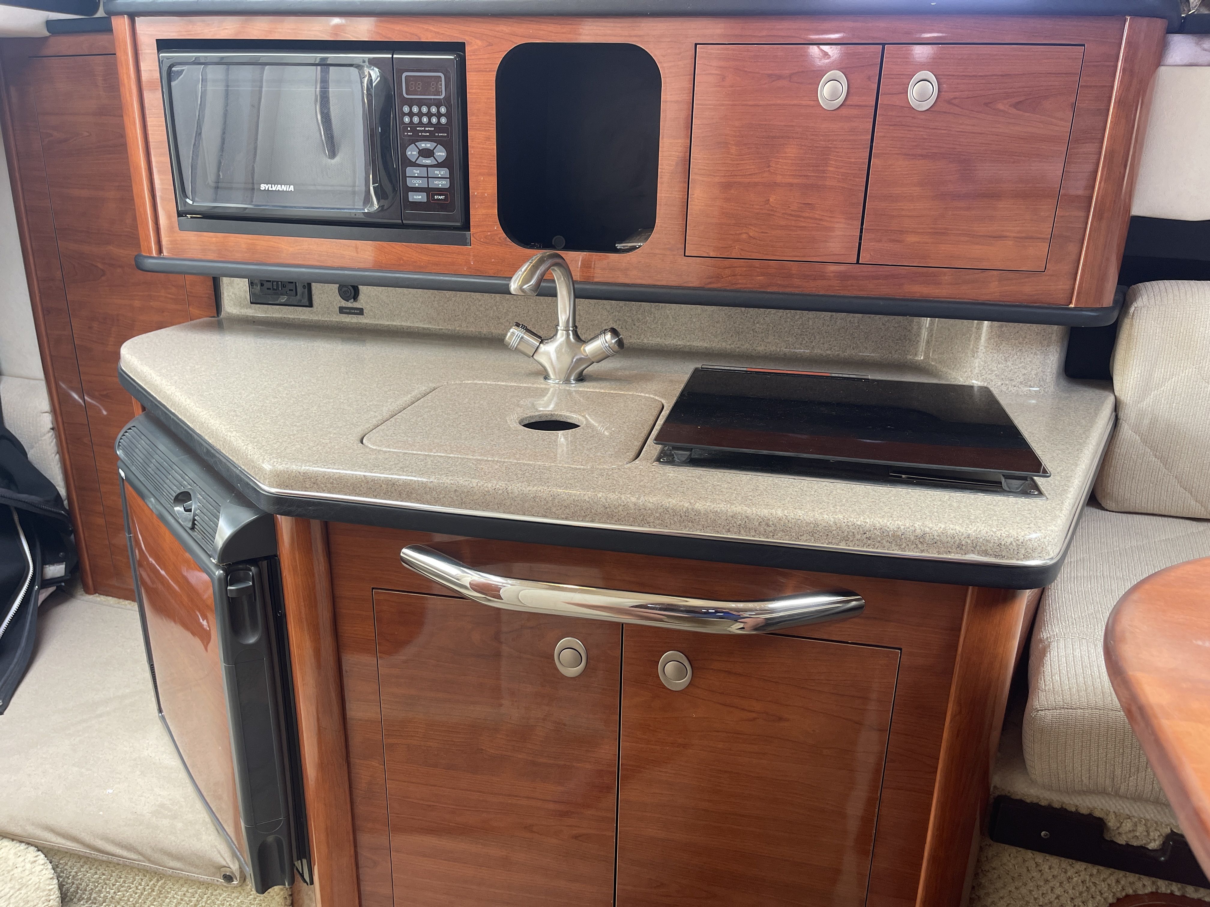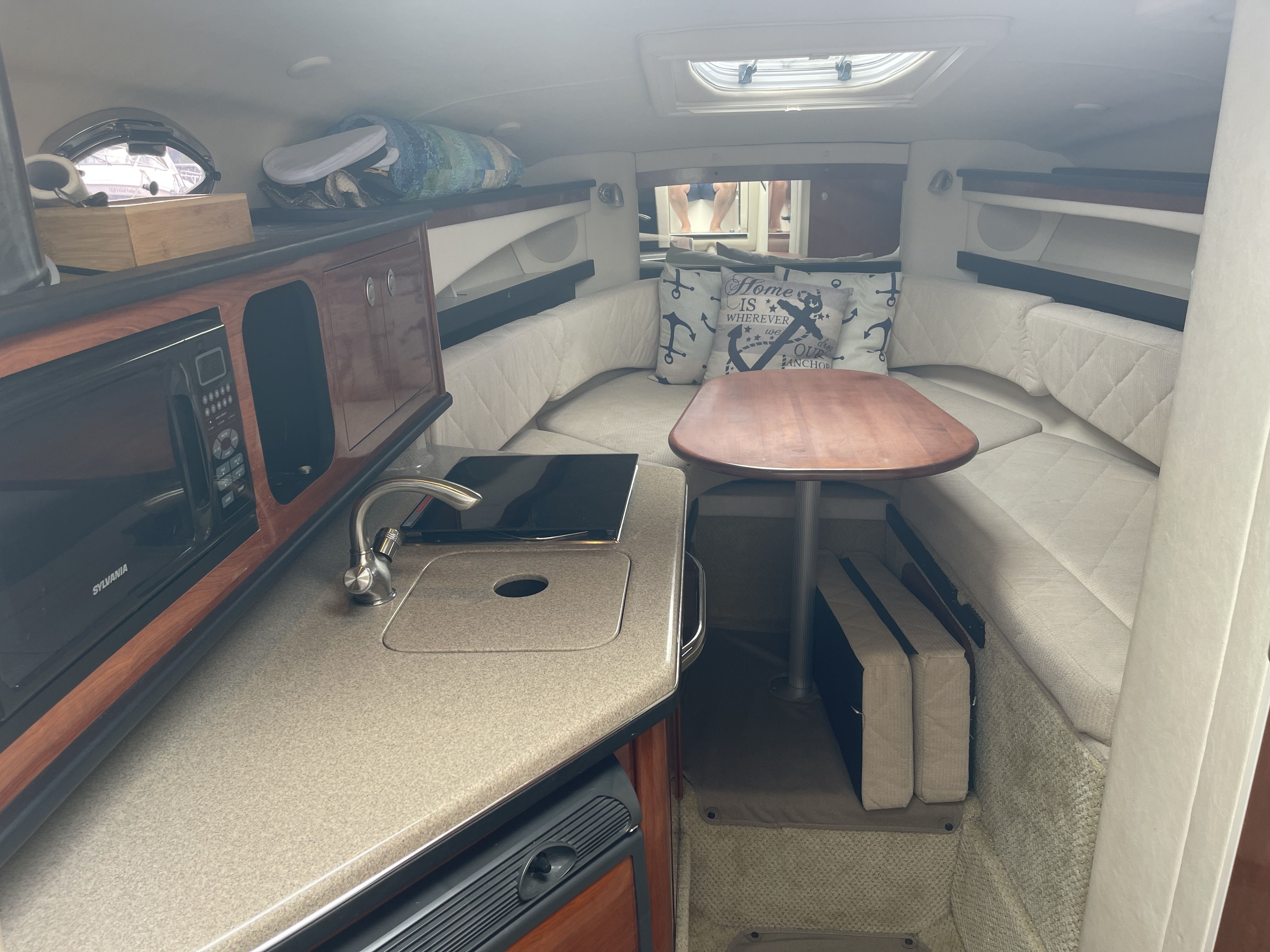 Inside is an open V-berth cabin with forward dinette seating, capable of converting to a bed with an insert and foam topper, and an aft/mid cabin bed with a memory foam topper. The port side galley has a Kenyon one burner stove top, sink, fridge and microwave. The head has a vacuflush toilet and shower.