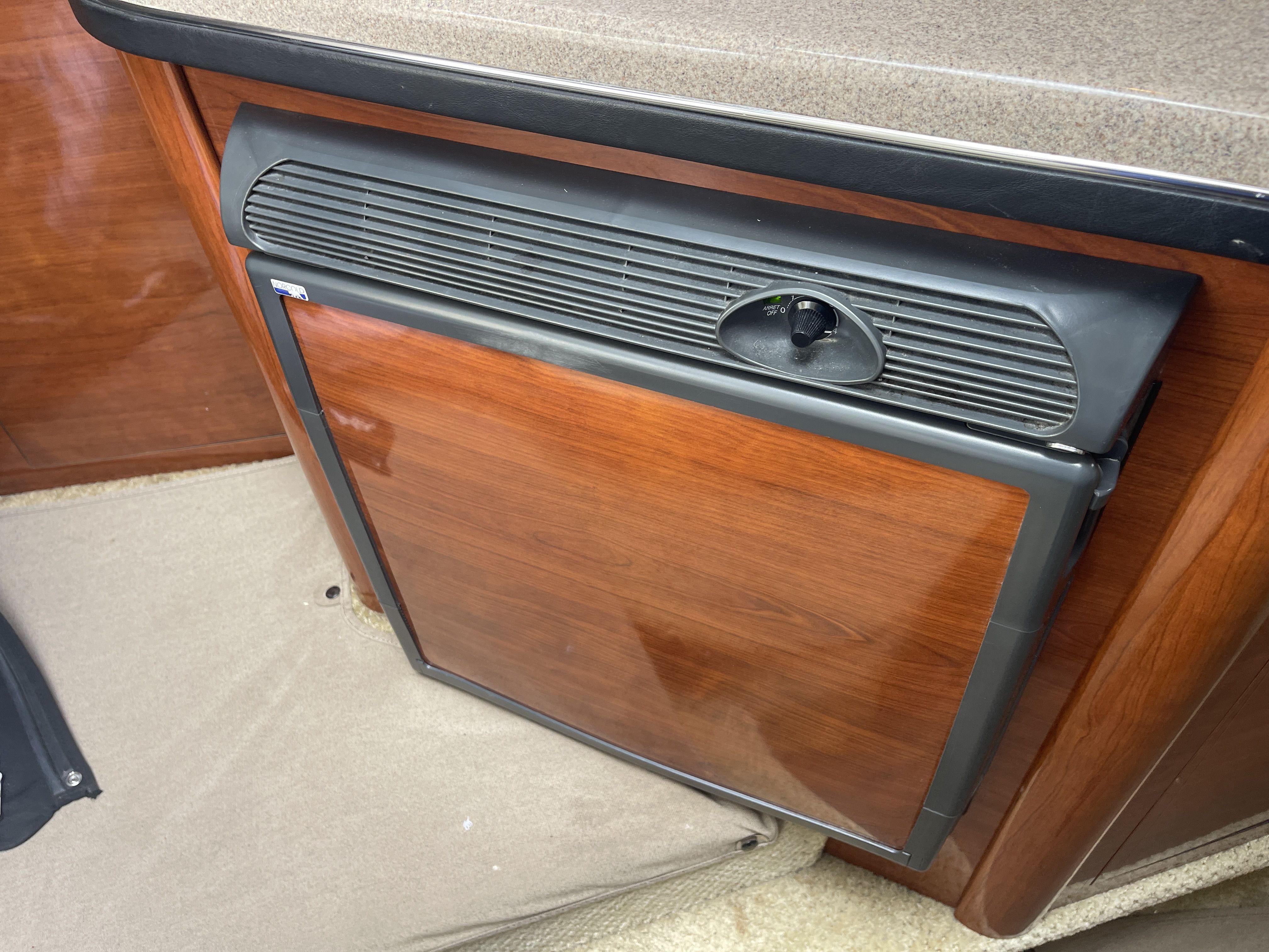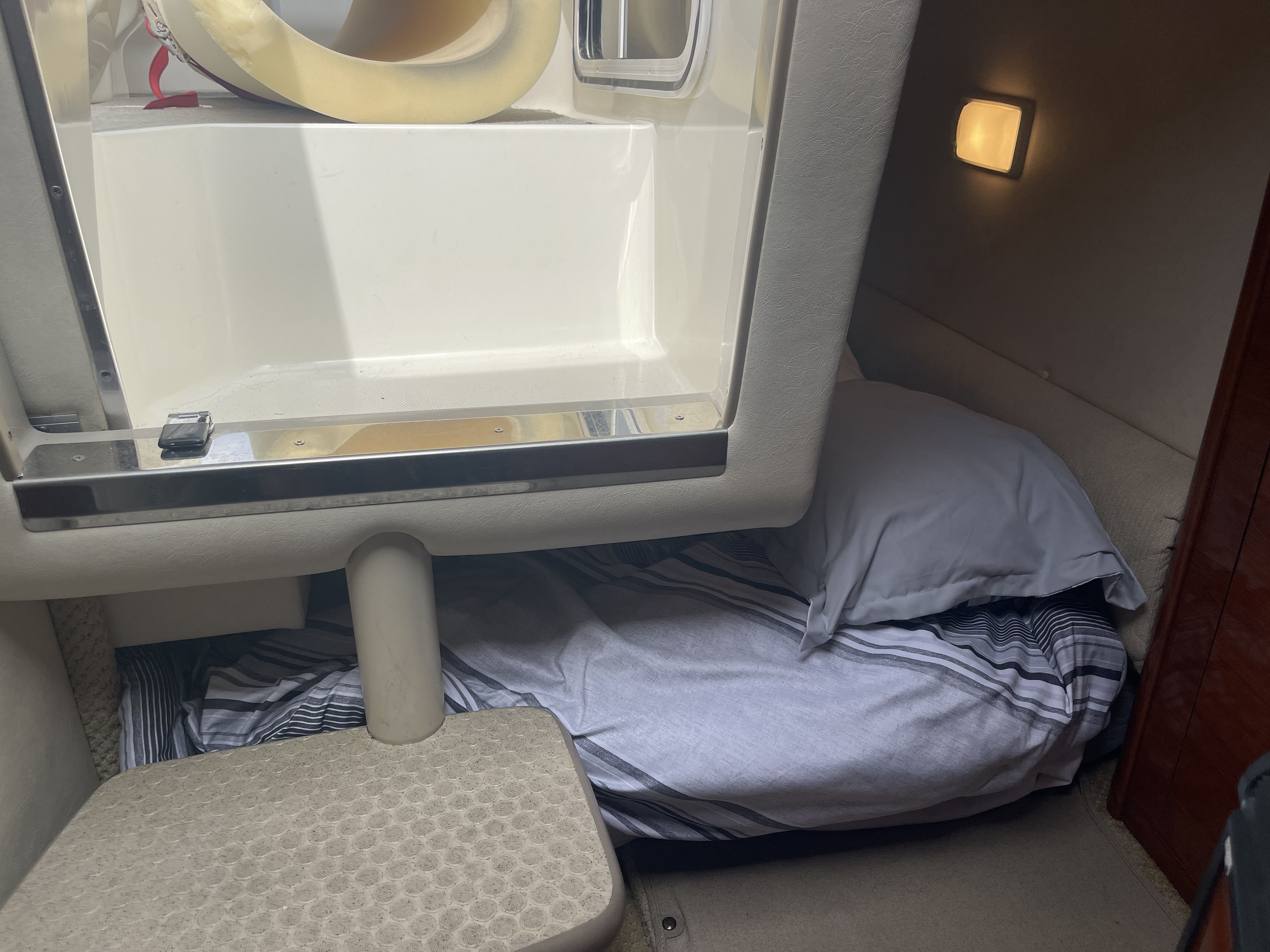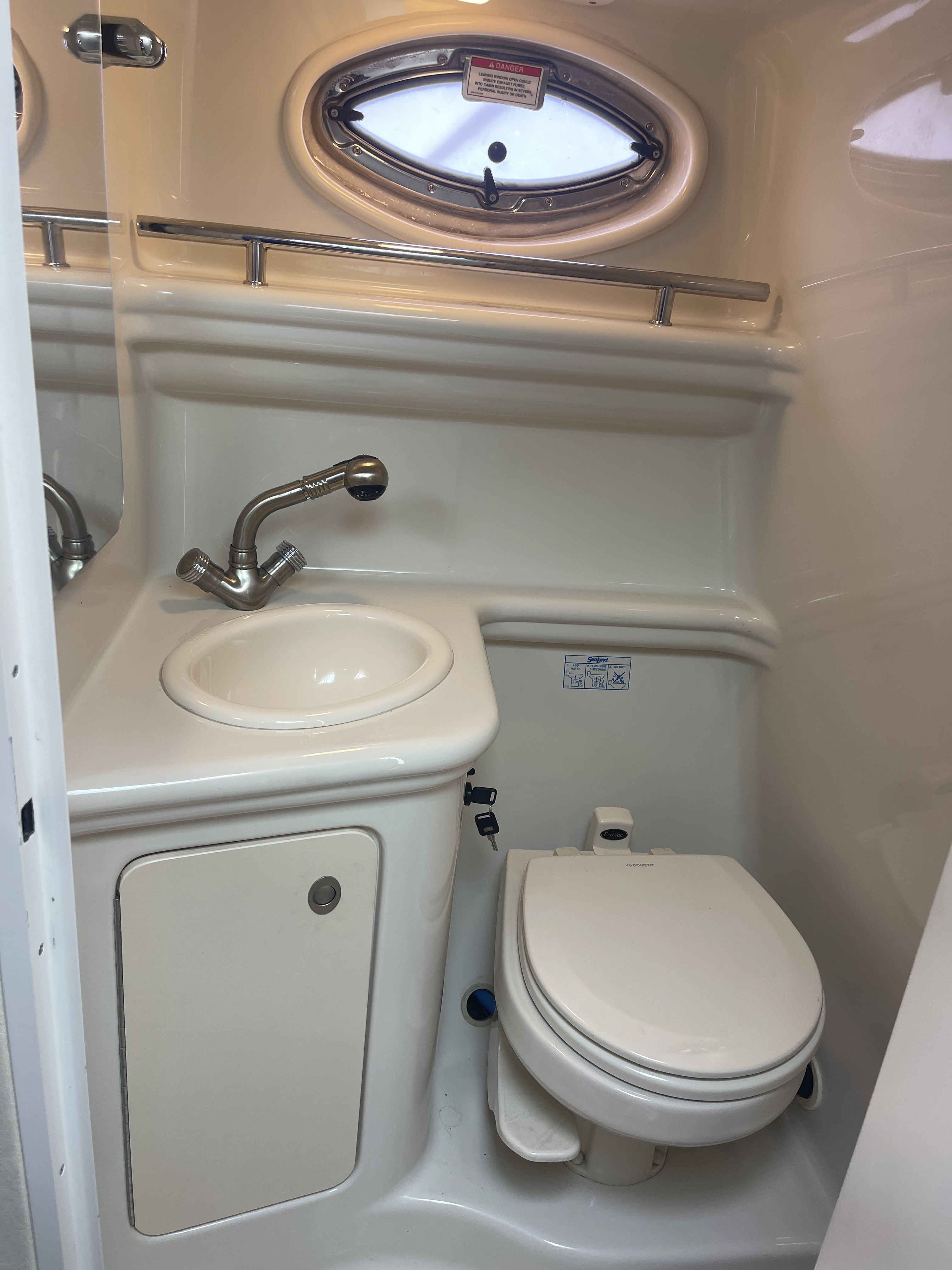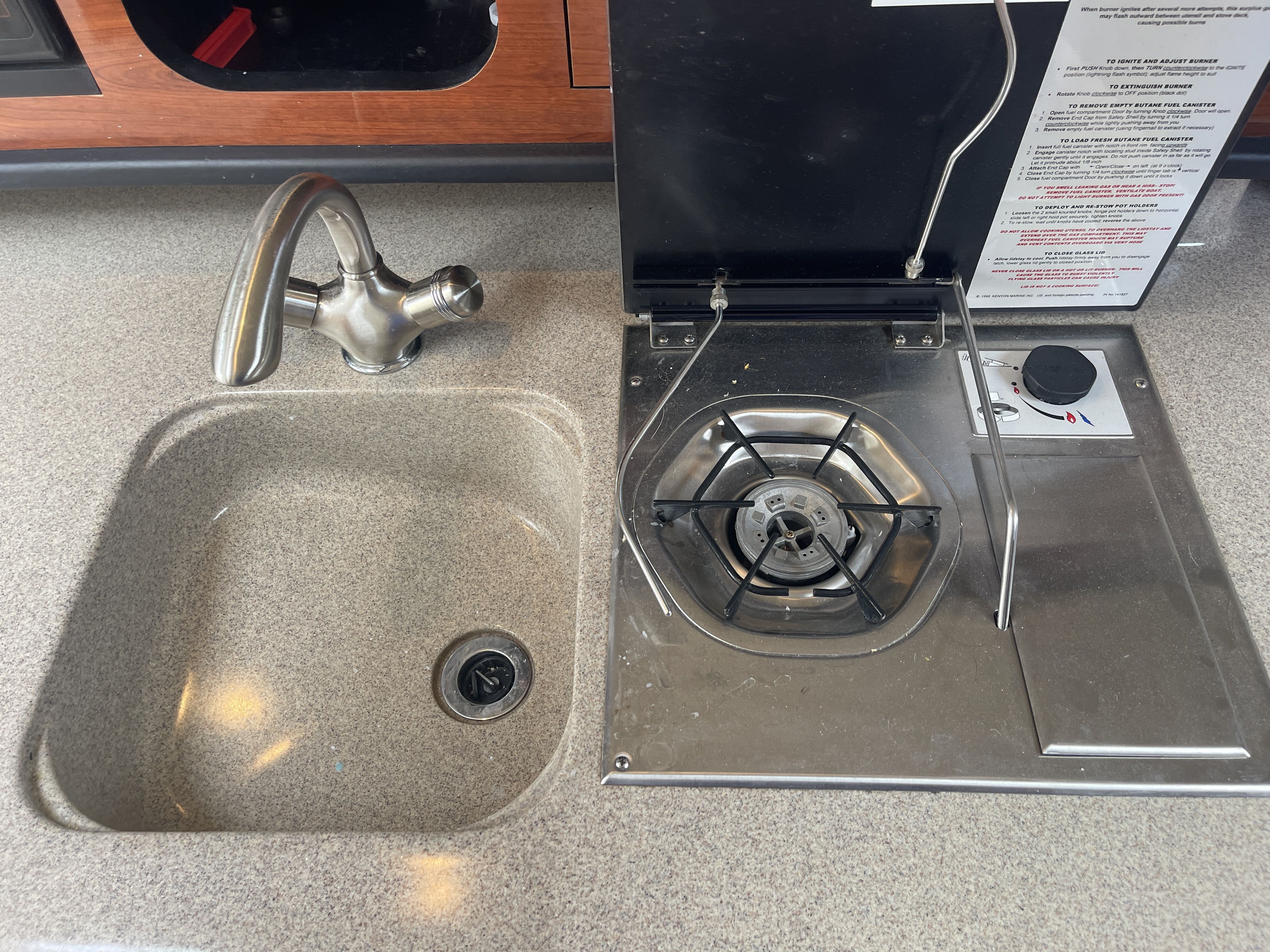 Inside is an open V-berth cabin with forward dinette seating, capable of converting to a bed with an insert and foam topper, and an aft/mid cabin bed with a memory foam topper. The port side galley has a Kenyon one burner stove top, sink, fridge and microwave. The head has a vacuflush toilet and shower.