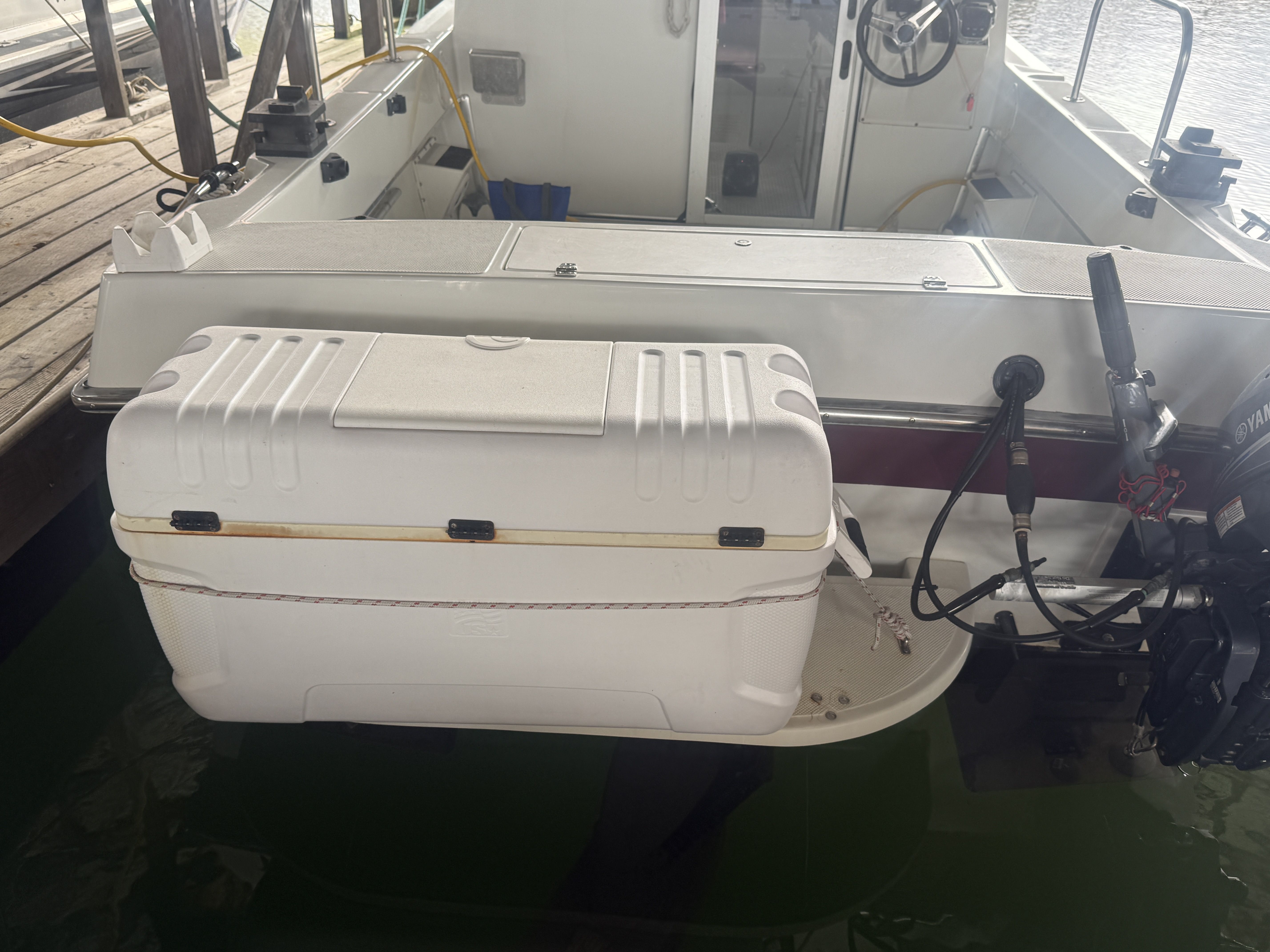 This boat is well-equipped for both cruising and fishing. The cockpit is spacious and functional, and the addition of dual flexible solar panels allows for extended time off-grid. A Walker Bay dinghy is included for added versatility at anchor, and the 2016 high-thrust kicker provides redundancy and precision trolling capability.
