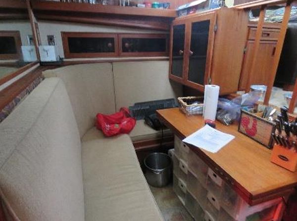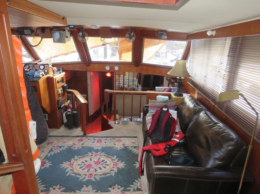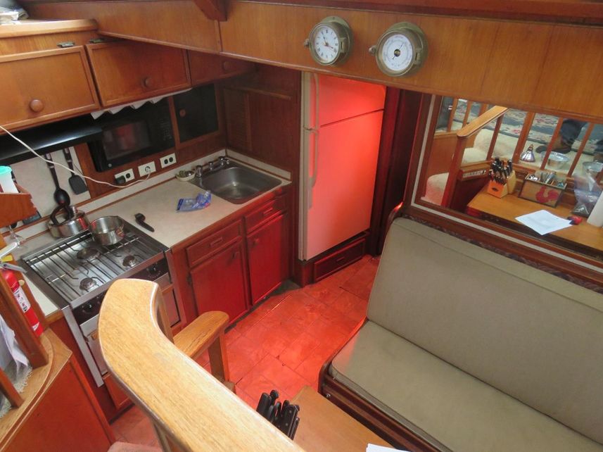 Enclosed forward stateroom Private aft cabin beneath rear deck Large main salon Enclosed aft lounge Galley down layout Dinette opposite galley Three burner propane stove with oven 110V electric refrigerator Separate deep freezer GE microwave Diesel heat Hot water via 120 VAC and engine heat exchange Panasonic sound system Propane locker with solenoid shut-off